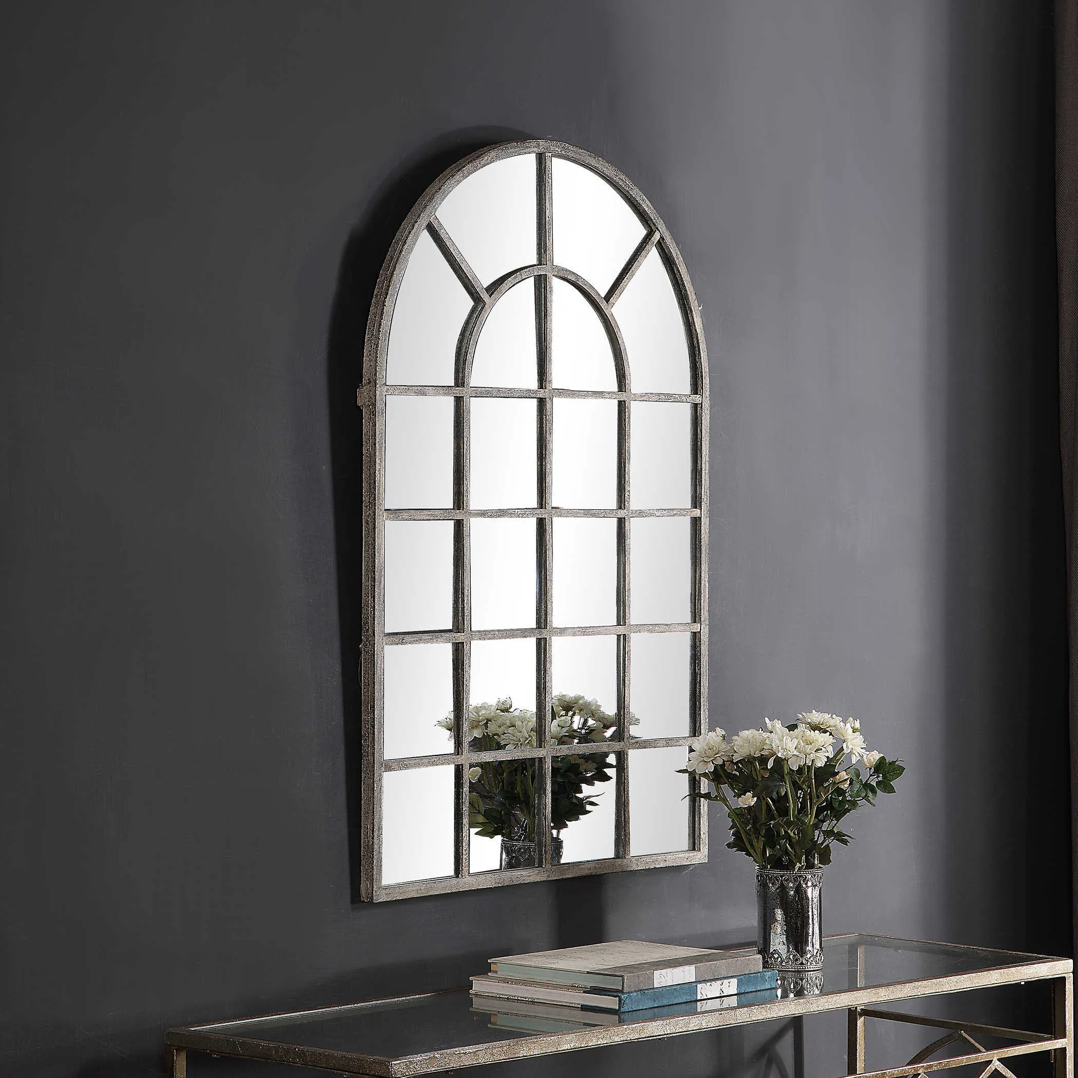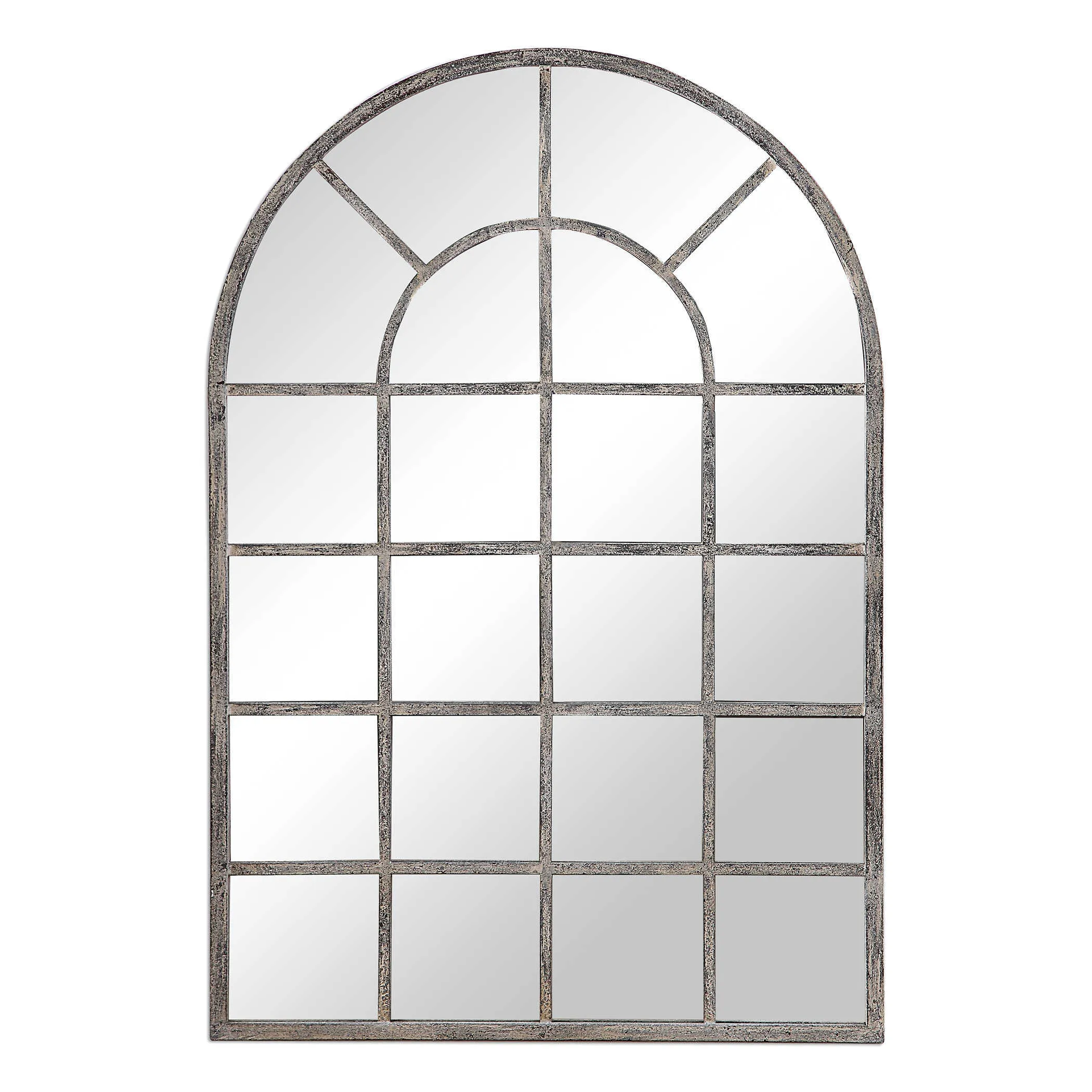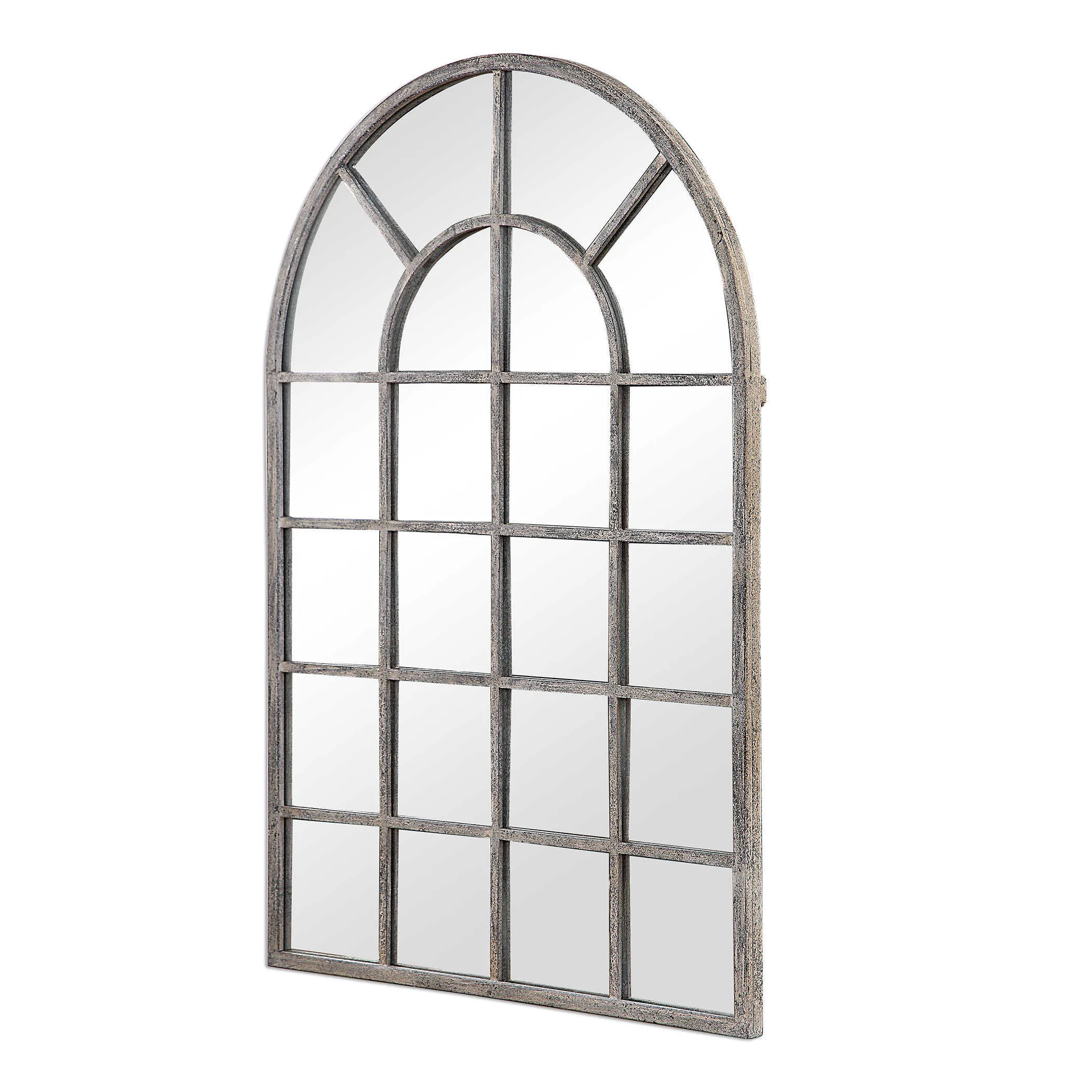 Finished in an antique rustic gray, this metal, arched windowpane will add interest to any space.