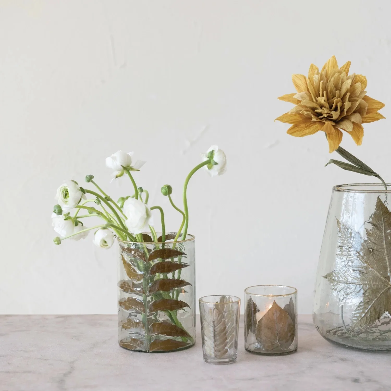 Hand-Blown Glass Votive Holder w/ Embedded Peepal Leaves & Gold Foil Edge