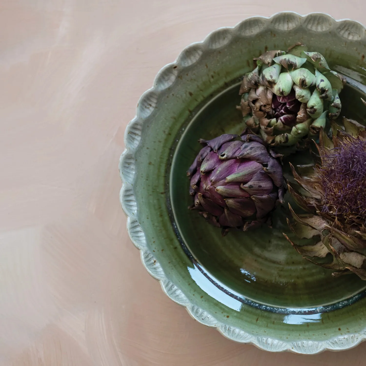 Stoneware Bowl w/ Scalloped Edge, Reactive Glaze, Green