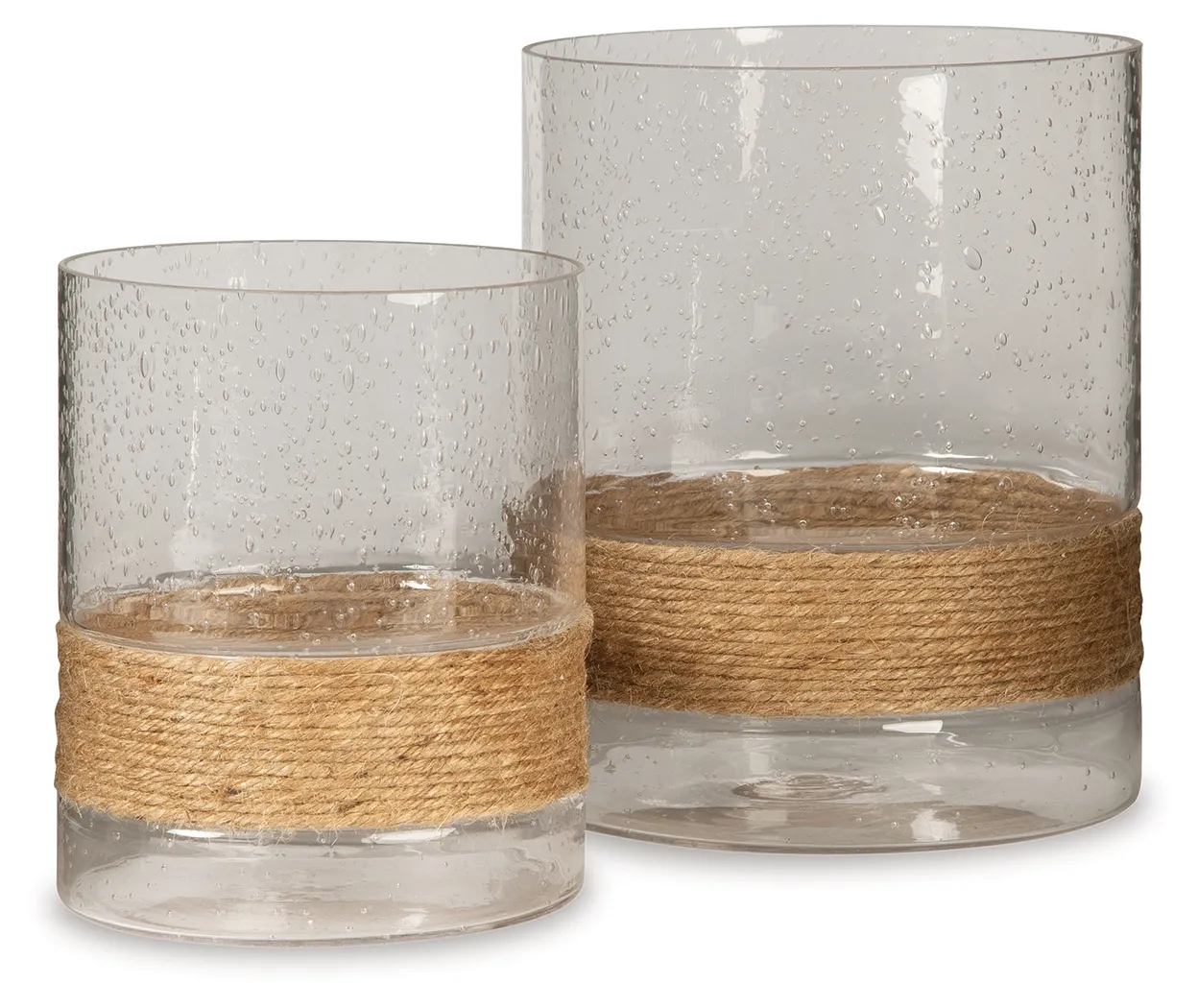 Instantly add interest to any room in your home with this set of candleholders. Pairing the natural beauty of seeded glass and hemp rope, these are the perfect shabby chic accent for your living space.