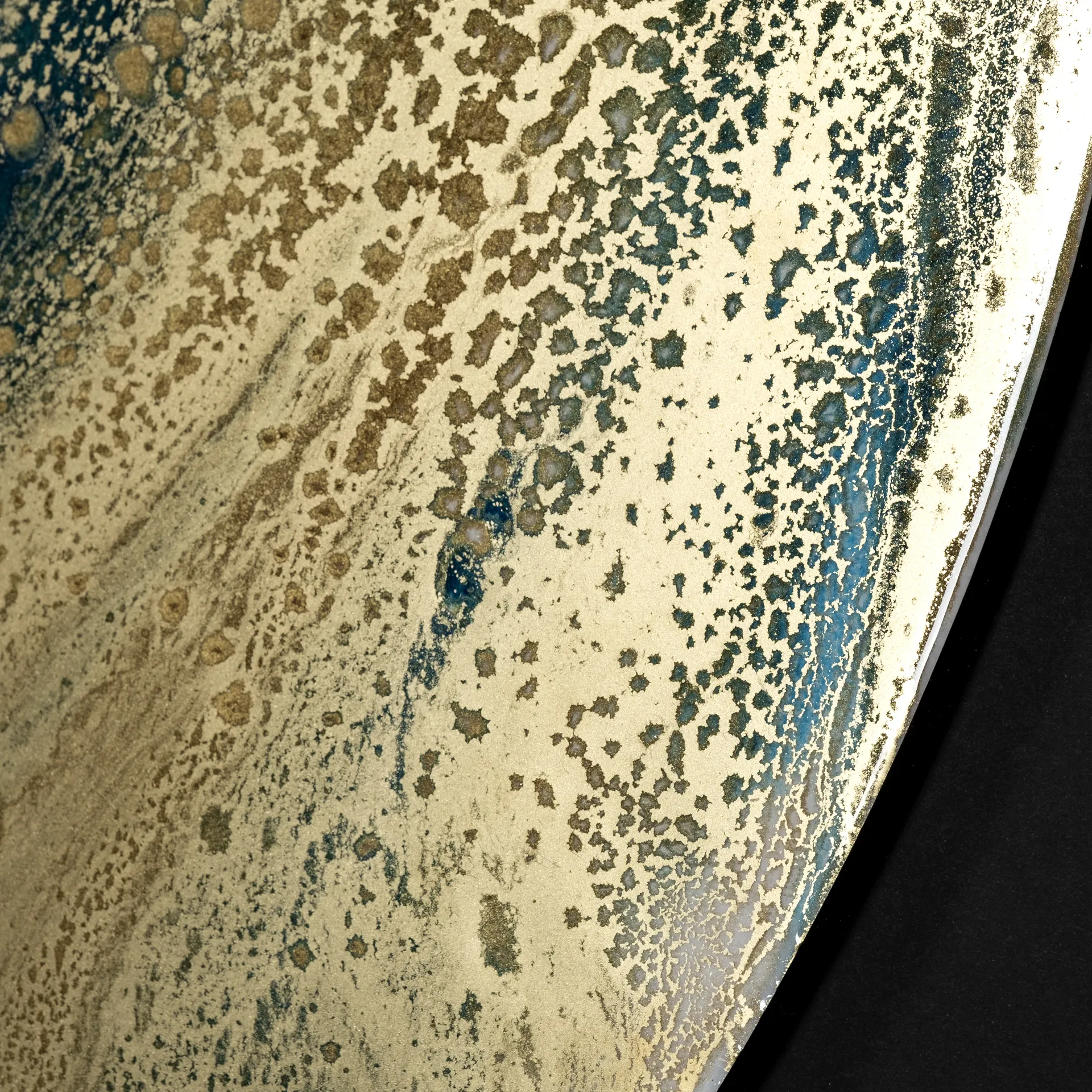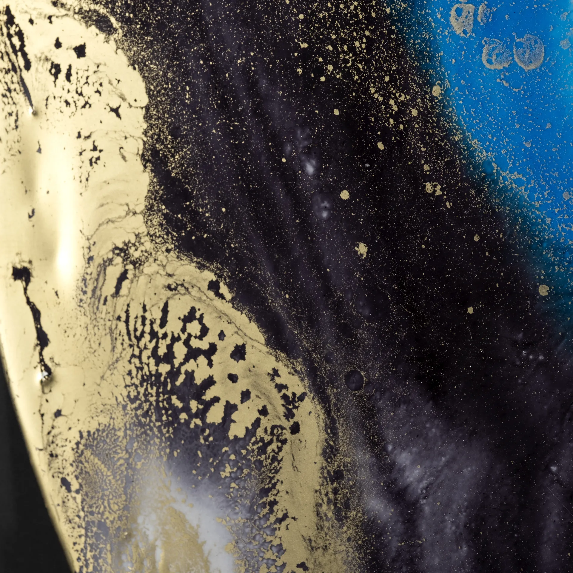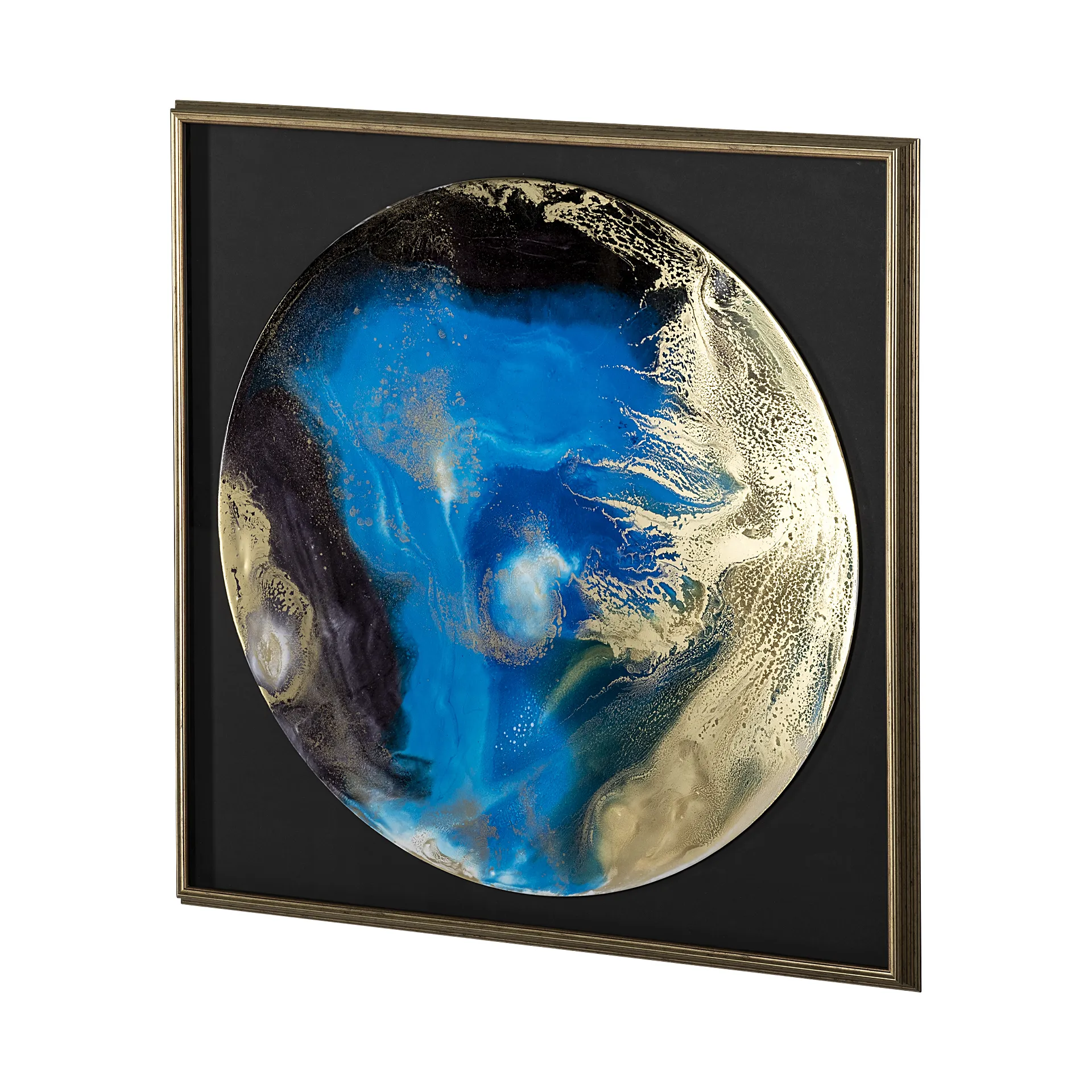 "Blue Planet" by Barbara Mercado is a mesmerizing celestial abstraction swirling with deep blues, vibrant teals, and opulent golds, capturing the mystique of a cosmic landscape. Handcrafted with exquisite attention to texture, each original piece is hand-embellished and elegantly encased in a refined gold frame. The frame's rich, warm tones contrast beautifully with the artwork, creating a striking focal point under glass that elevates any space.