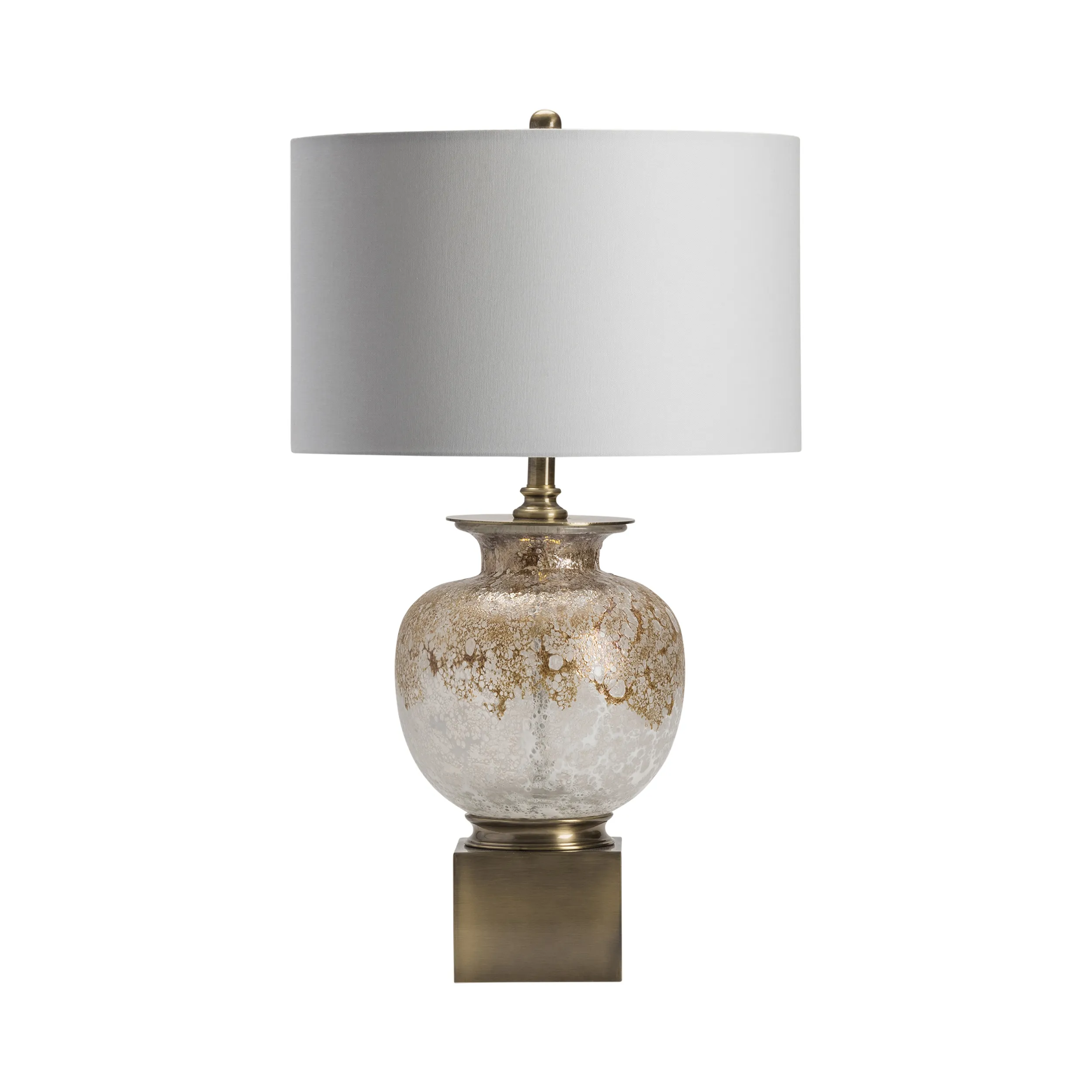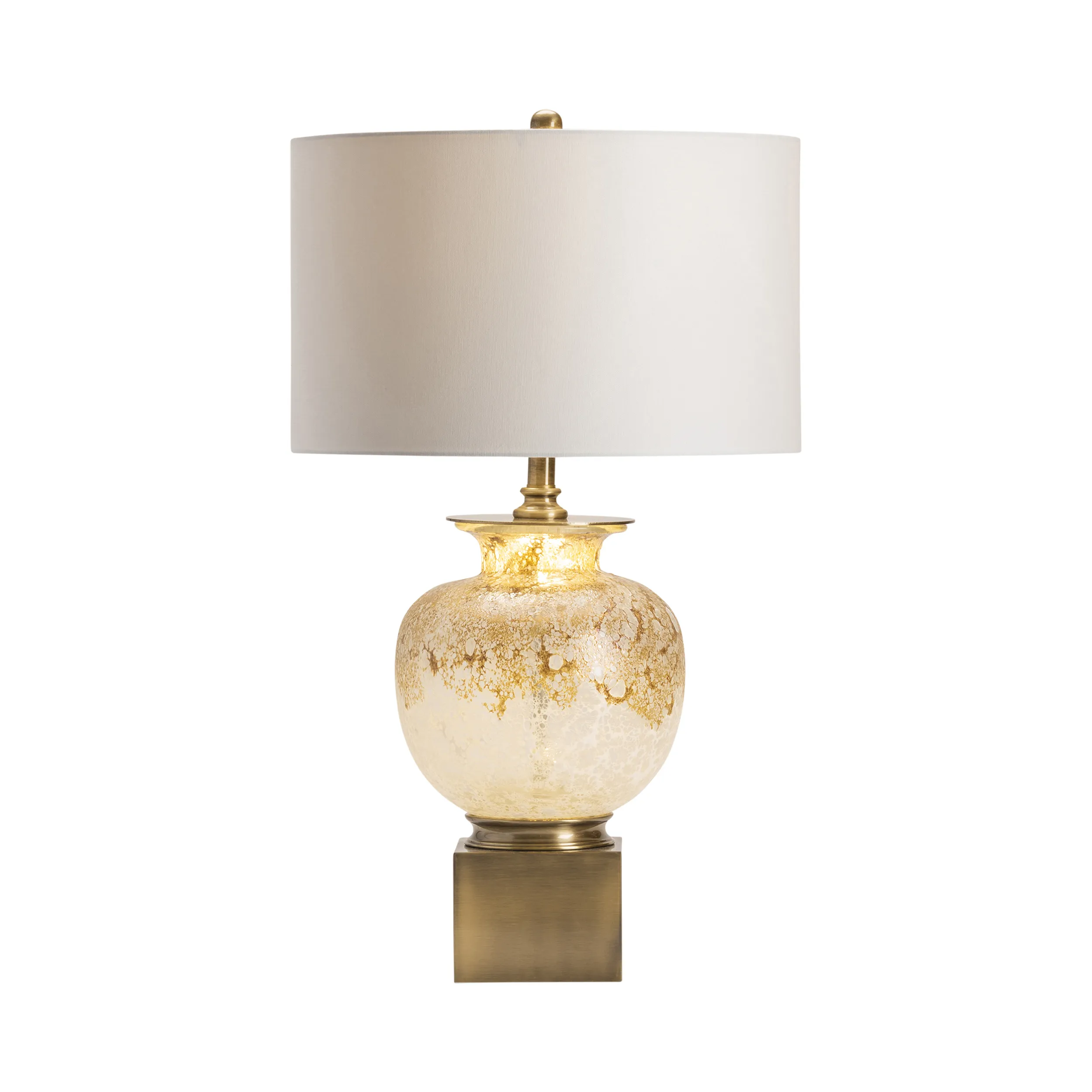 The Crestview Collection Selbourne Table Lamp features an urn-shaped body sitting atop an antique brass plinth. Made of hand-finished glass, the body has a gold sheen that brings elegance to your home. A white linen drum shade enhances the beauty of this transitional table lamp. A built-in night light makes this lamp perfect for any room in your home.