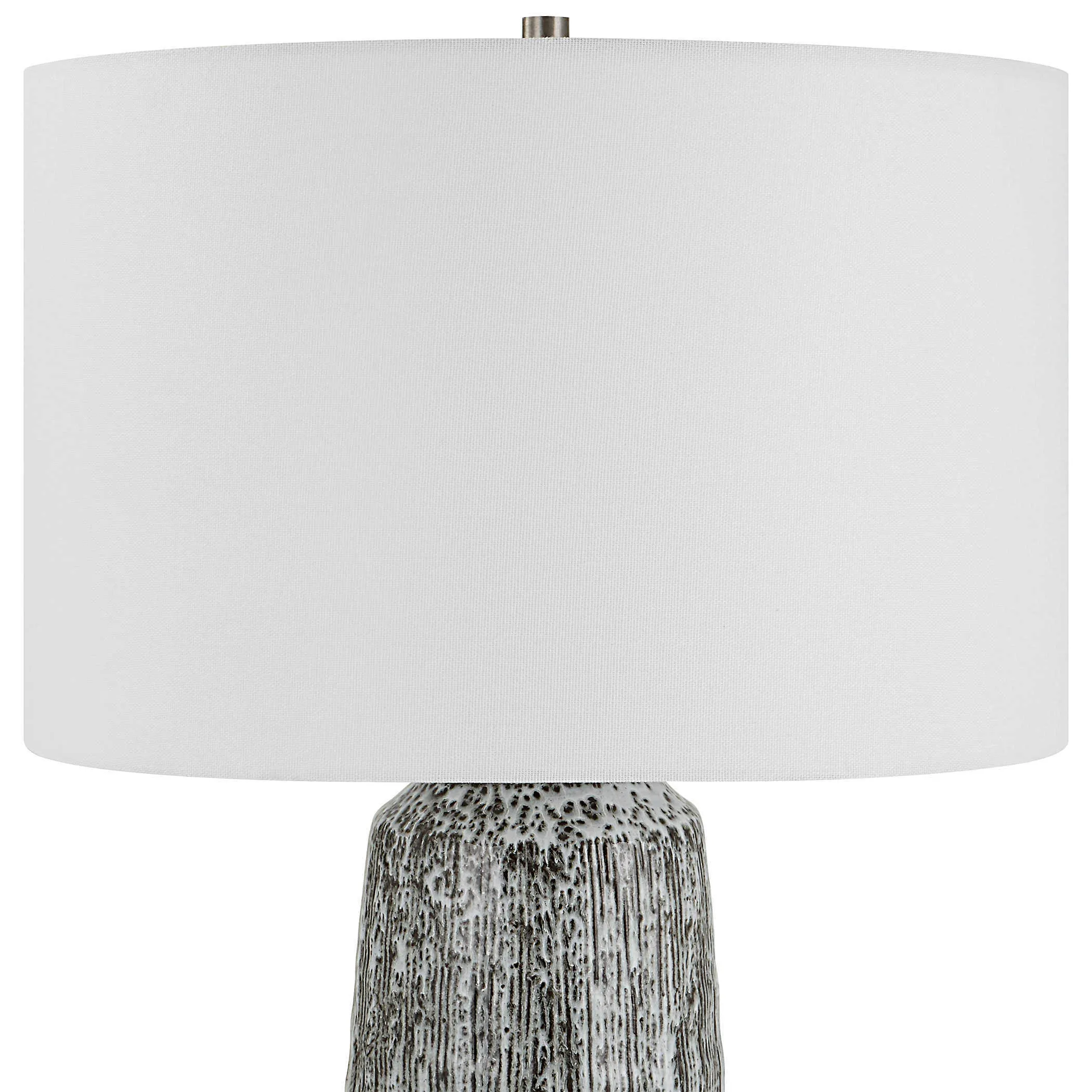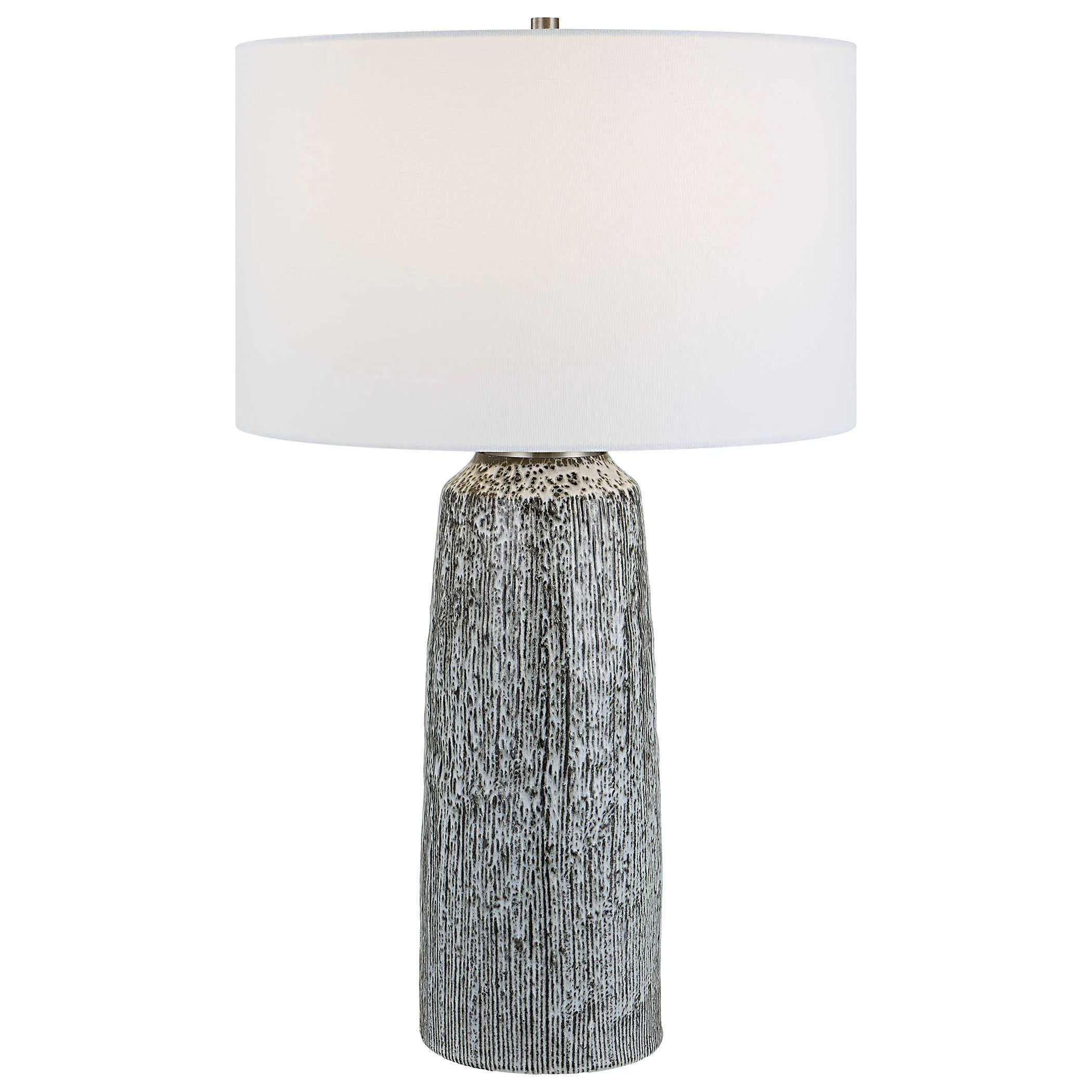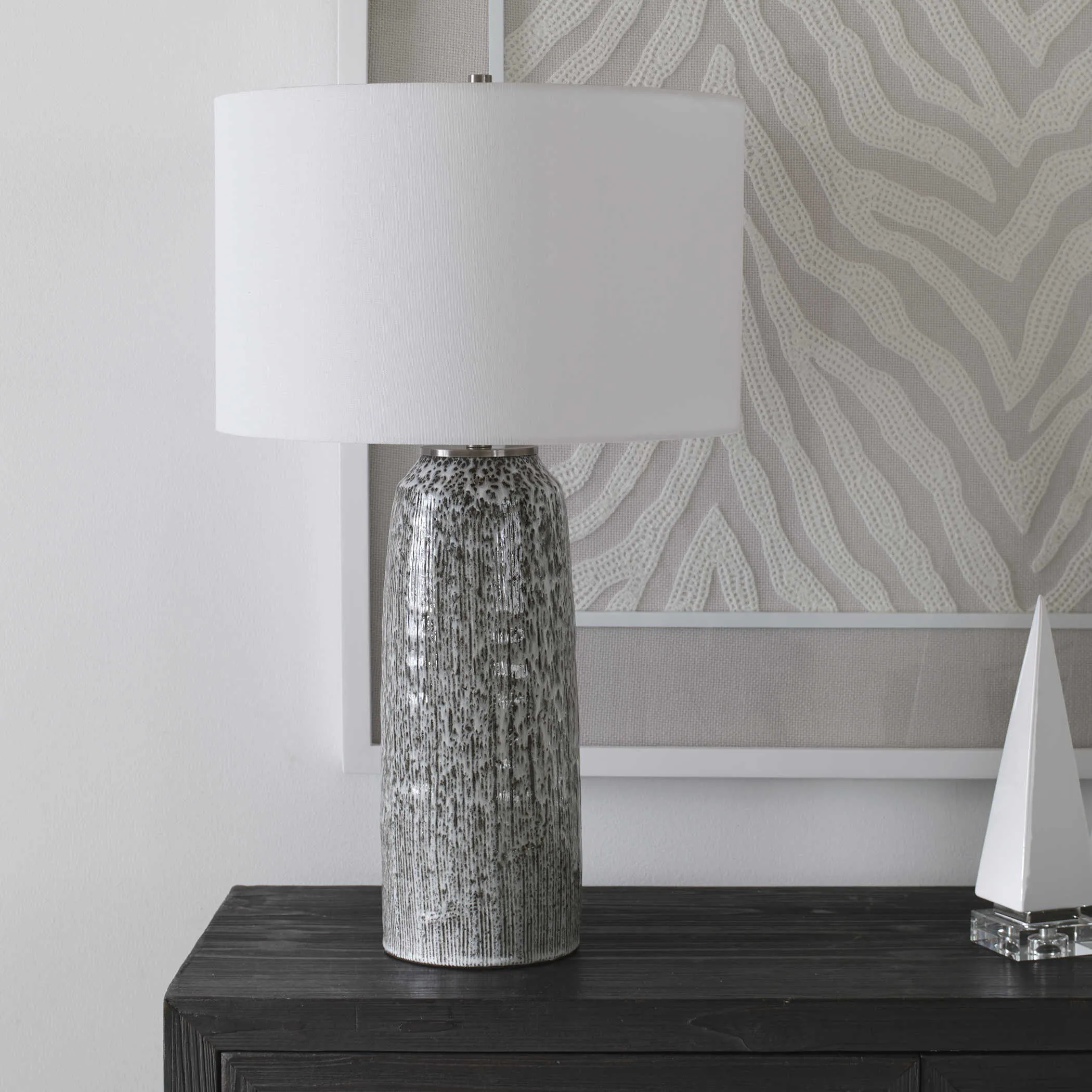 A modern work of art, this ceramic table lamp displays a striking black and white glaze with subtle embossed details and brushed nickel plated details. The hardback drum shade is covered in a white linen fabric.