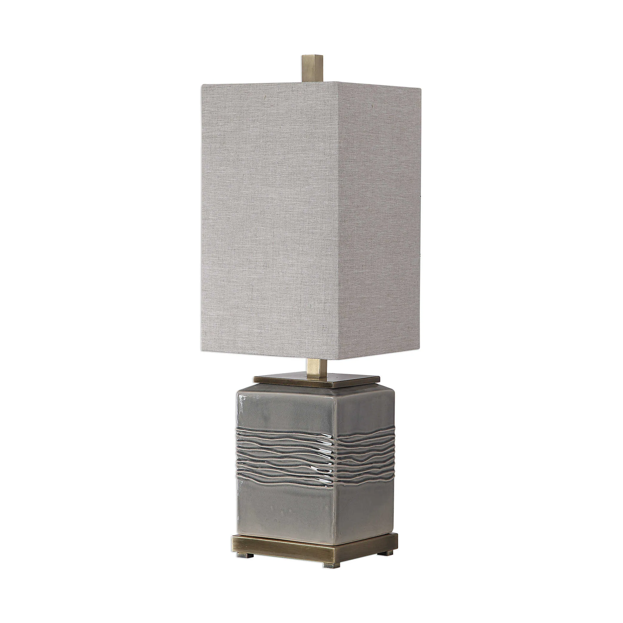 A contemporary style emanates from this ceramic base that features wavy embossing that has a subtle organic feel, finished in a warm gray glaze, accented with plated antique brass details. A rectangular hardback shade in light beige linen with natural slubbing compliments this piece.