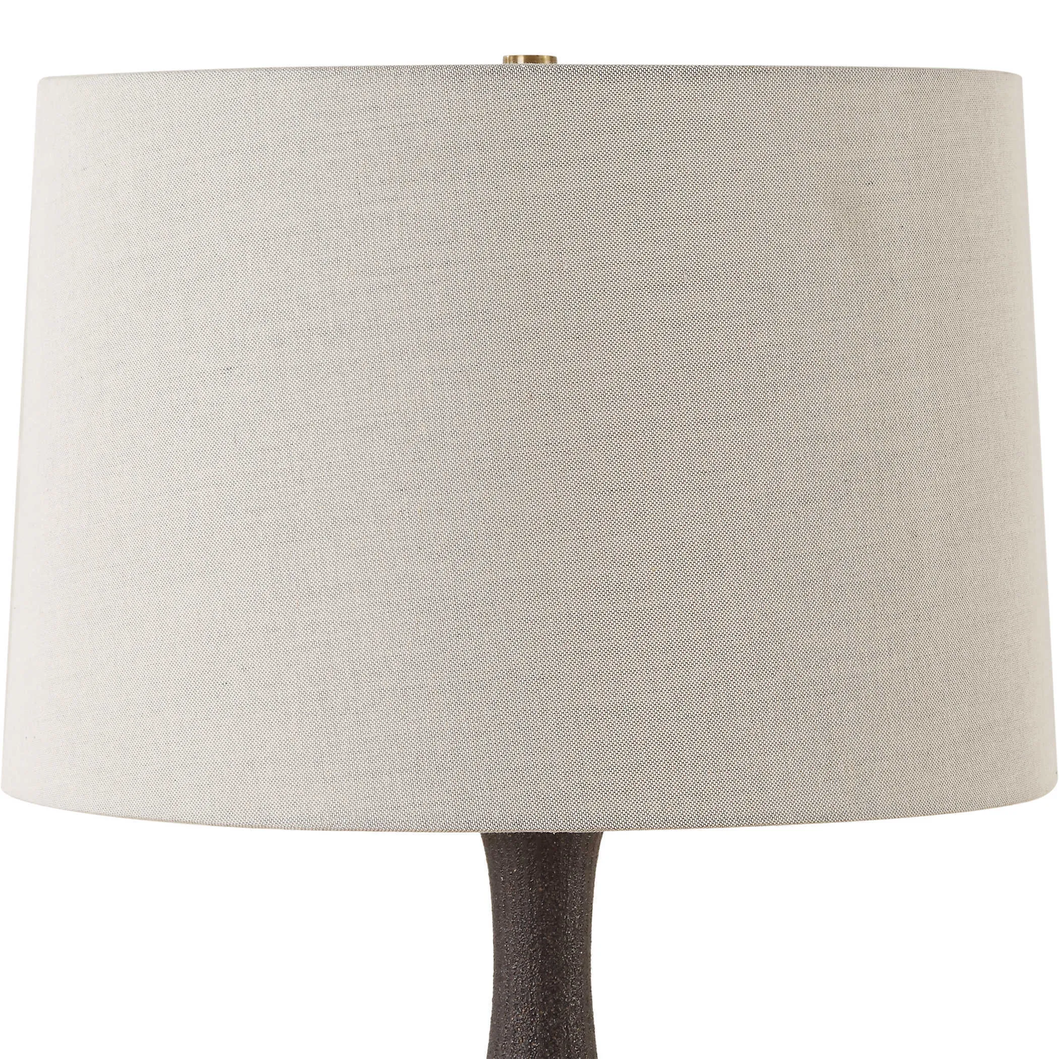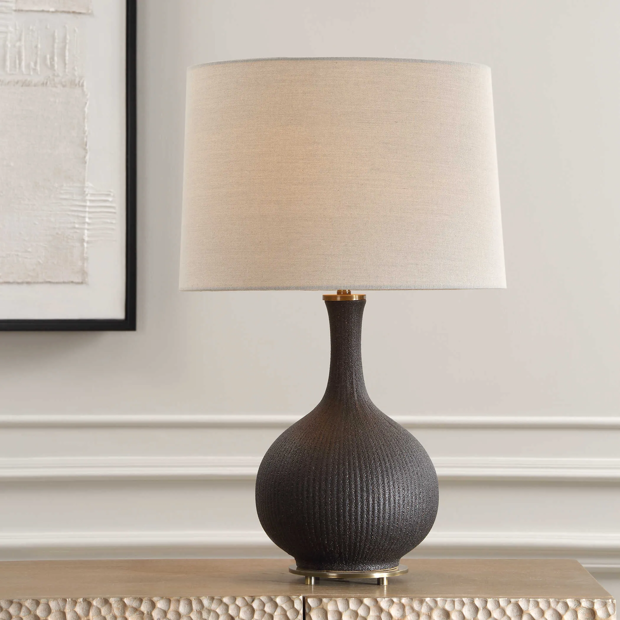 This ceramic table lamp features heavily ribbed surface with distressed texture in a matte black glaze with rust undertones. Accented by plated brushed antique brass foot and matching hardware. The slightly tapered round hardback shade is a warm gray linen fabric with natural slubbing.