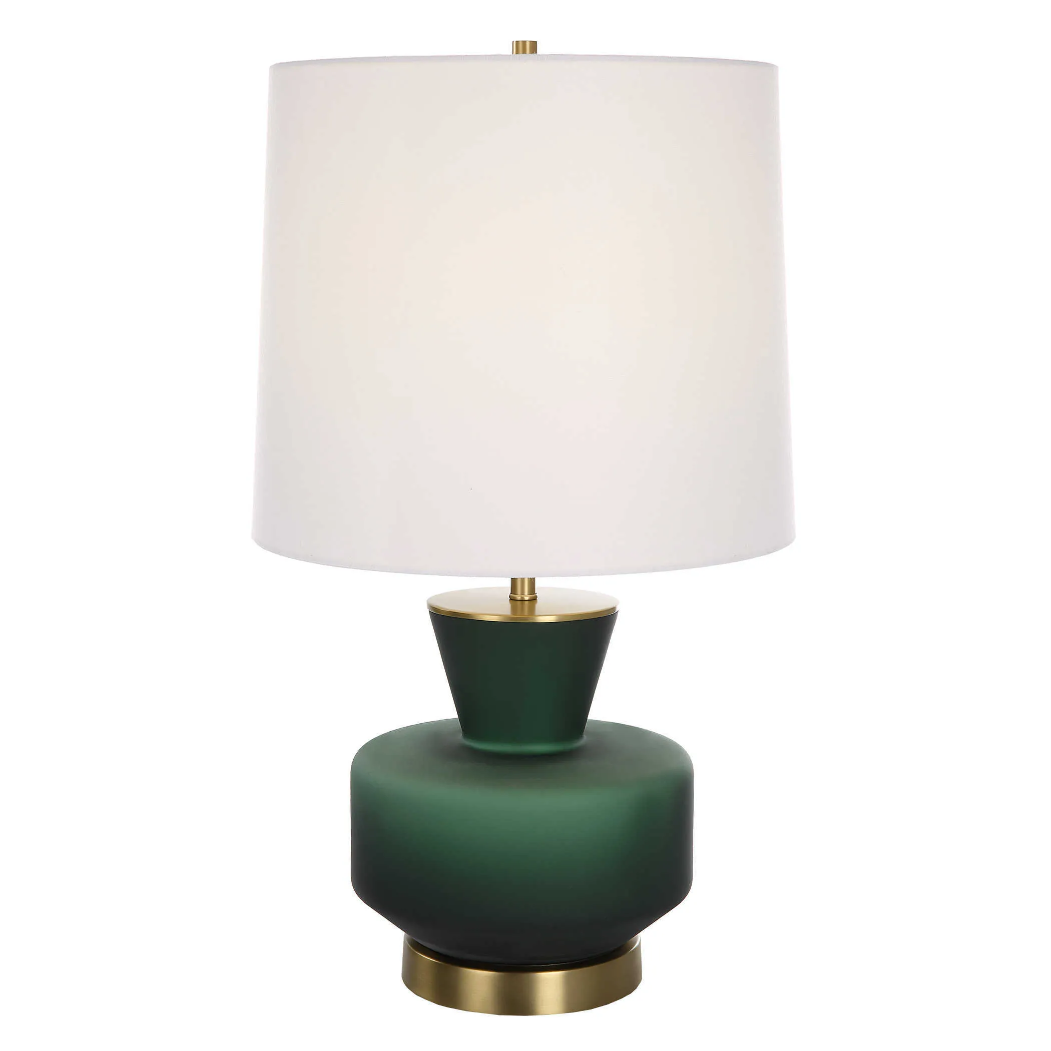 Inspired by Mid-Century Modern design, this table lamp features a unique dark emerald green glass base that's accented with lightly antiqued brass plated details. The tapered round hardback shade is covered in a crisp white linen fabric.