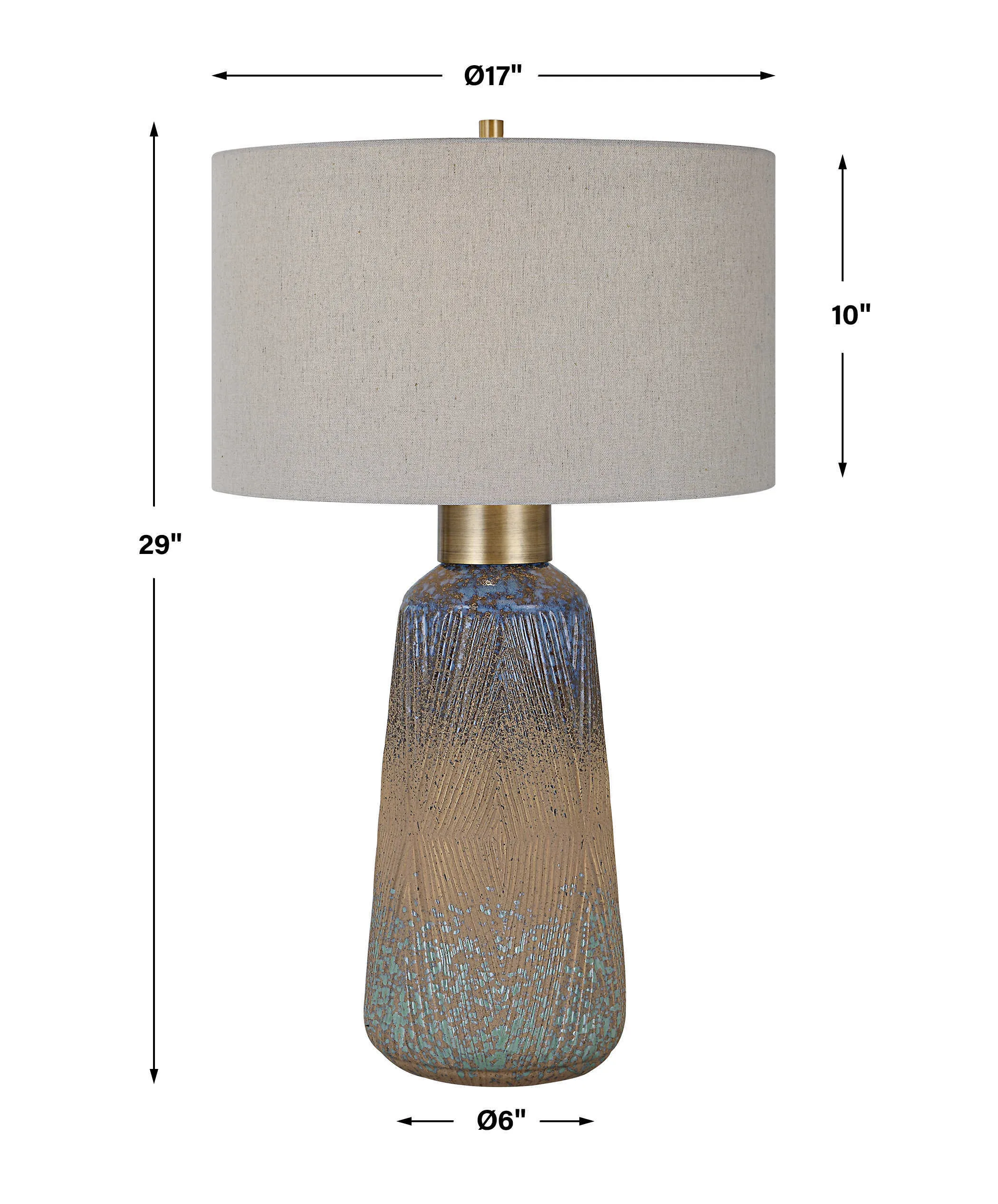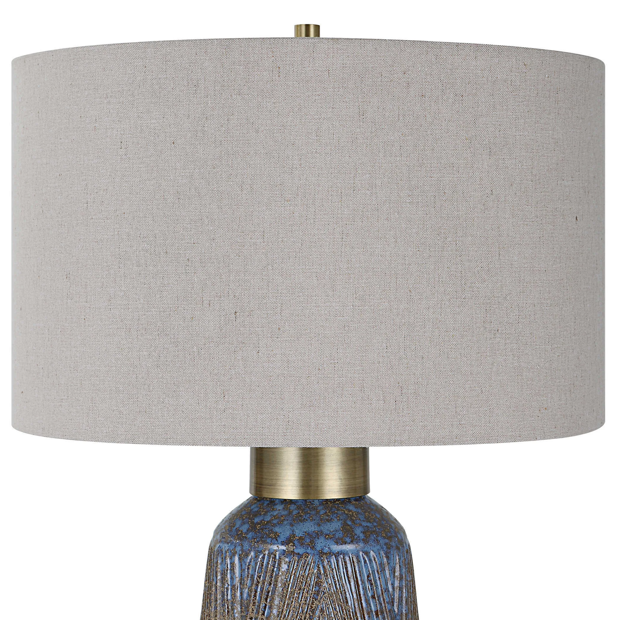 A beautiful display of color and style, this ceramic table lamp features an embossed design with a unique mix of matte and gloss glazes in various shades of blue-green, indigo, and golden rust, paired with antique brass plated details. The hardback drum shade is covered in a light gray linen fabric with natural slubbing.
