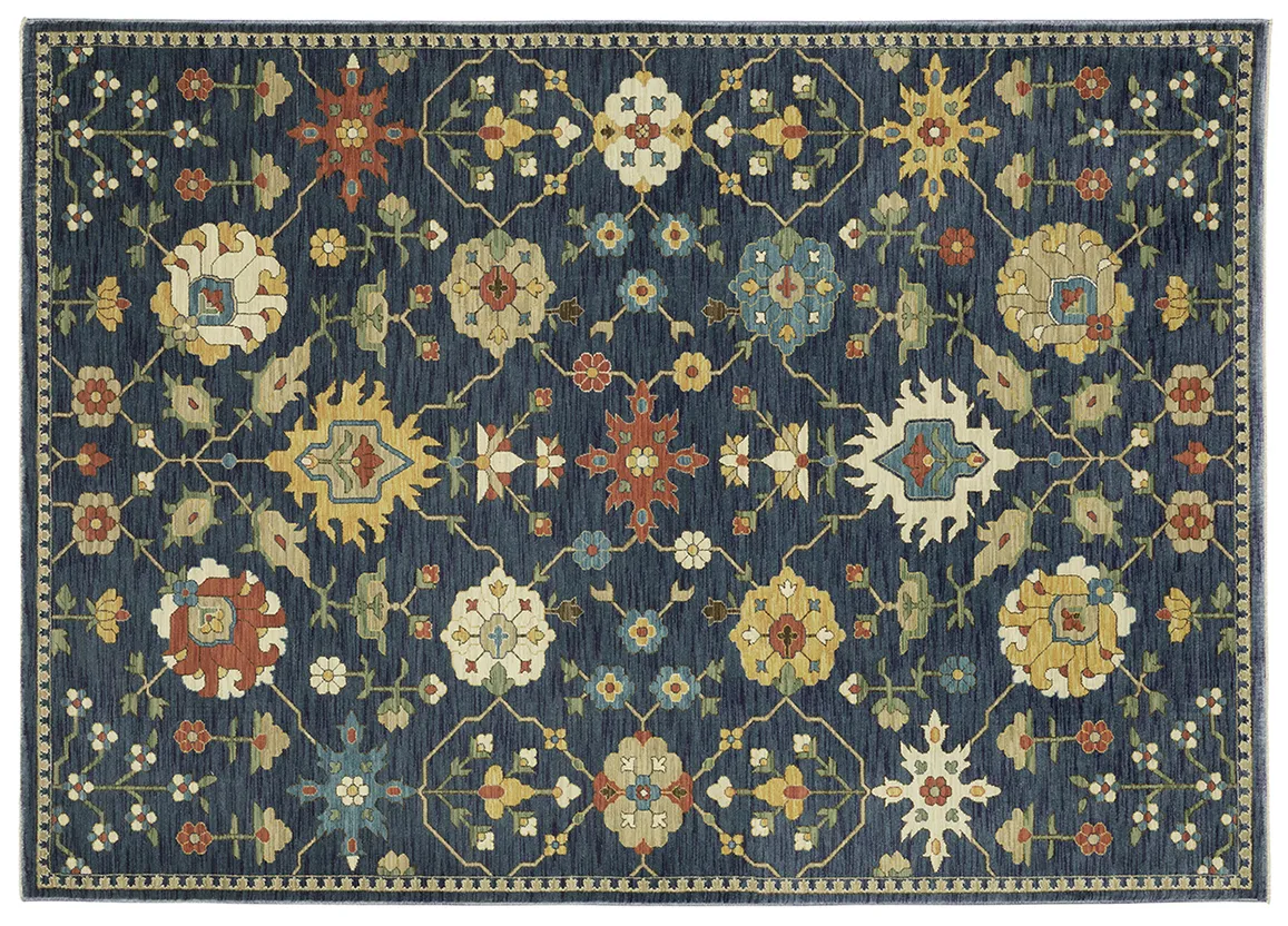 The Francesca collection features softened jewel tones of sapphire and turquoise, muted gold, and cinnabar alongside nature-inspired neutrals and an earthy brown and green. It is power-loomed of space dyed, super soft polypropylene. Francesca showcases updated traditional patterns highlighting open fields, updated borders, and some folk-art flair.