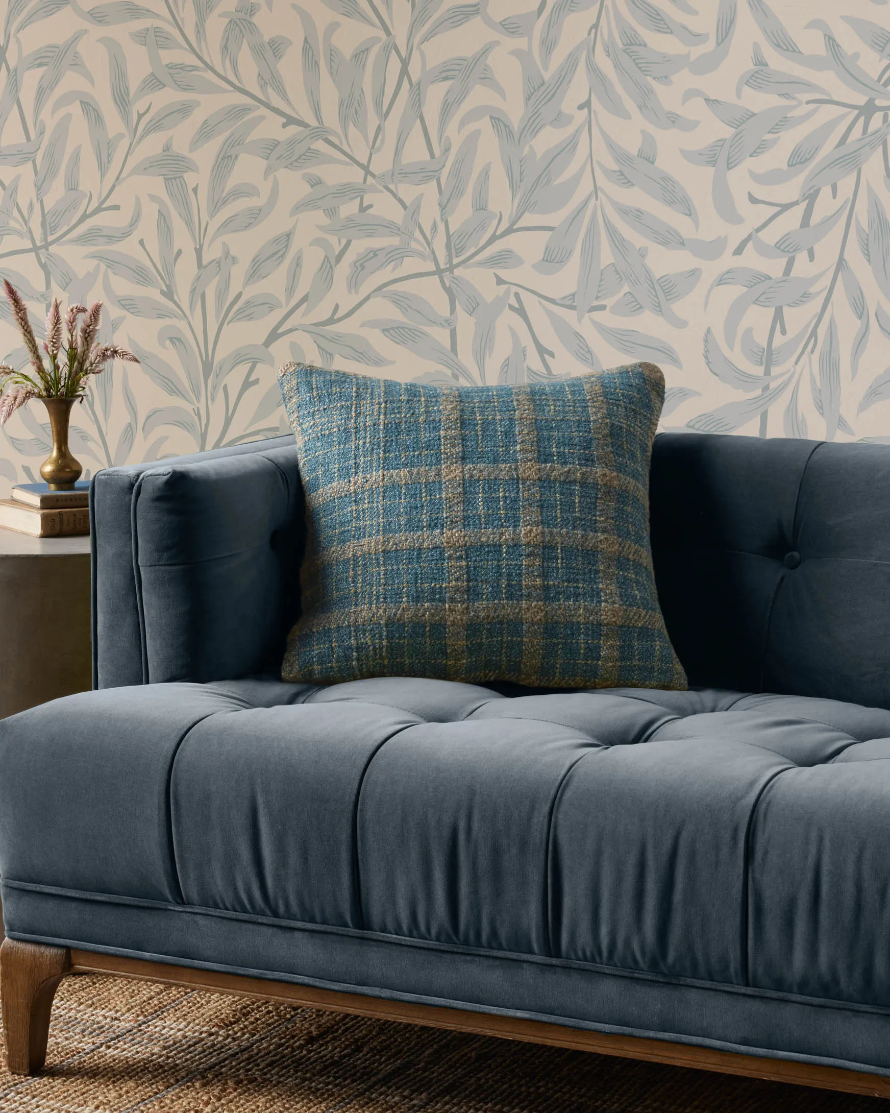 The Earl throw pillow from Chris Loves Julia x Loloi features a timeless check pattern in a cabin-inspired teal and tan palette. The pillow cover is made of cotton, polyester, and rayon and measures 18” x 18”, a standard size to style in living rooms and bedrooms.