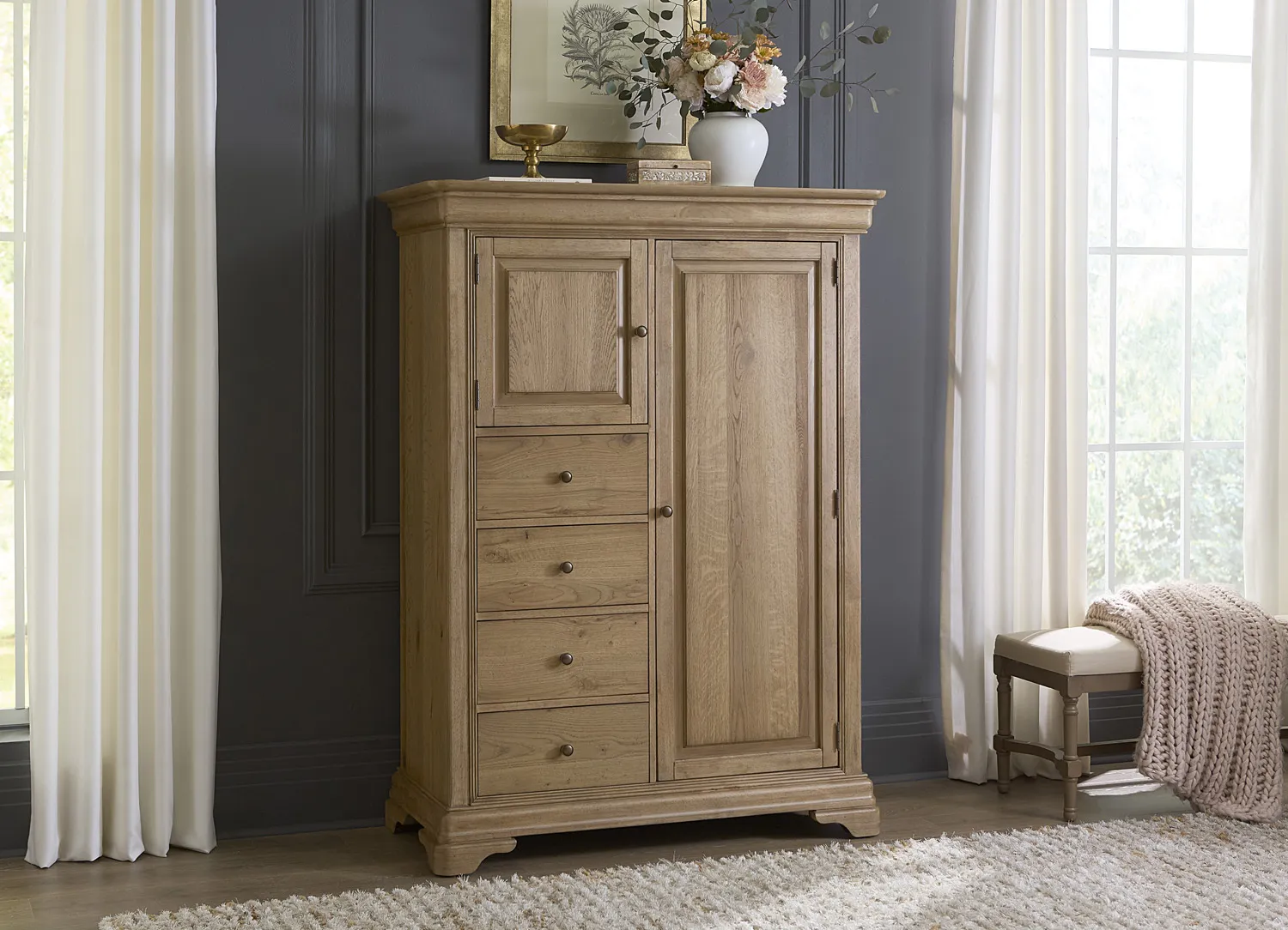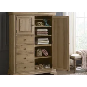 The Chateau Philippe Chiffarobe by Aspen Home offers the perfect blend of form, function, and traditional sophistication. With cedar-lined storage, felt-lined protection, and premium craftsmanship, it’s designed to be as practical as it is beautiful. Pair it with the other pieces in the collection to create a refined, cohesive bedroom suite. Ideal for adding extra storage while enhancing the visual presence of your bedroom.