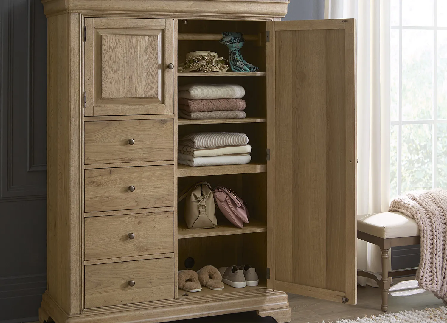 - Cedar-Lined Bottom Drawers – Naturally aromatic cedar helps absorb odors and repel moths, making it perfect for storing seasonal clothing and linens.