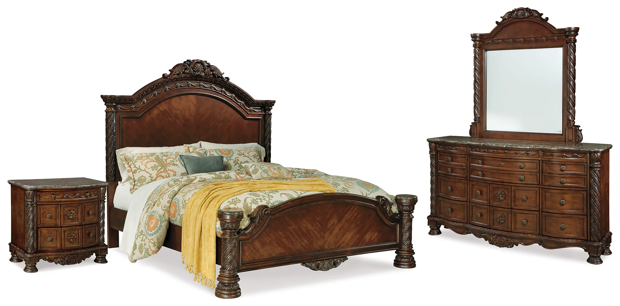 Inspired by the grandeur and grace of Old World traditional style, this queen panel bedroom set is nothing short of stunning. A choice blend of materials is accented by detailed ornamental appliques. Large-scale decorative pilasters make a grand stance.