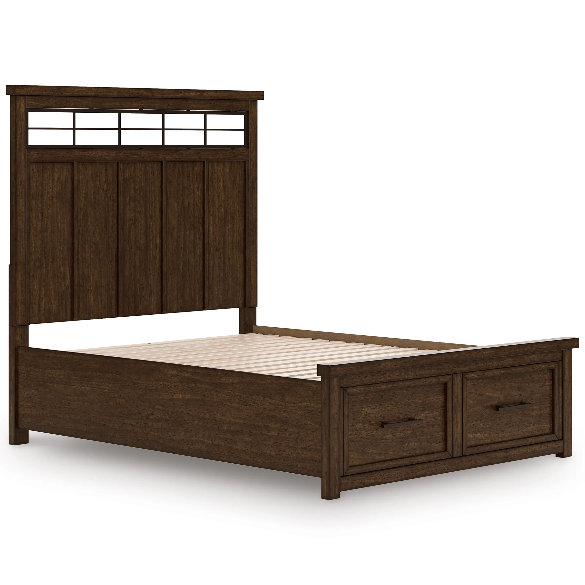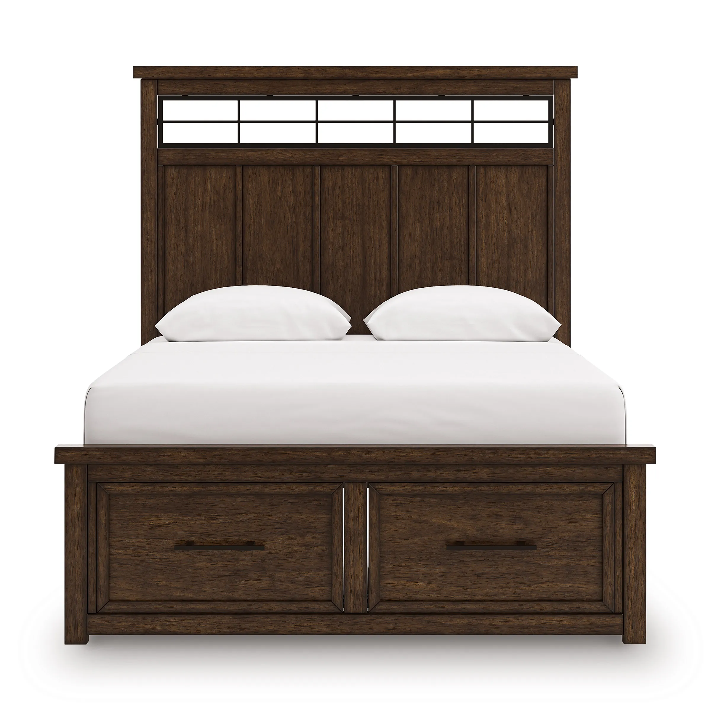 Style, simplicity and charm are hallmarks of this queen panel storage bed. Created with casual spaces in mind, it has the versatility to suit styles from craftsman to modern farmhouse. The rich brown finish aligns with your refined-meets-relaxed approach to everyday style. Short on storage space? Ultra-spacious under bed drawers keep extra clothes and linens neatly tucked away. And for a timeless touch, black metal fretwork on the headboard brings an inviting mixed-material feel to the overall look.
