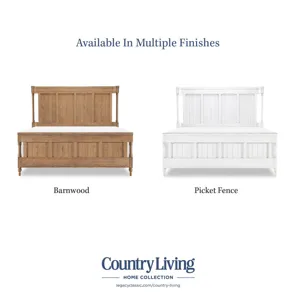 The Vintage Market Shelter King Bed by Legacy Classic Furniture brings the warm, cozy, and family-centered charm of the Country Living Collection into your bedroom. Shown in the Picket Fence White finish, this bed combines timeless design with a light, inviting aesthetic that brightens any space. Its distinctive shelter-style headboard and gently curved edges evoke the look of a handcrafted heirloom, while the solid construction ensures beauty and durability for years to come. Crafted from select hardwoods and oak veneers, this bed is available in two signature finishes—Picket Fence and Barnwood—allowing you to create a look that feels truly collected and lived-in.