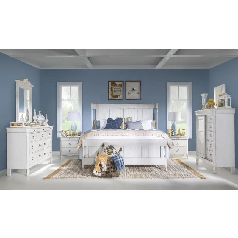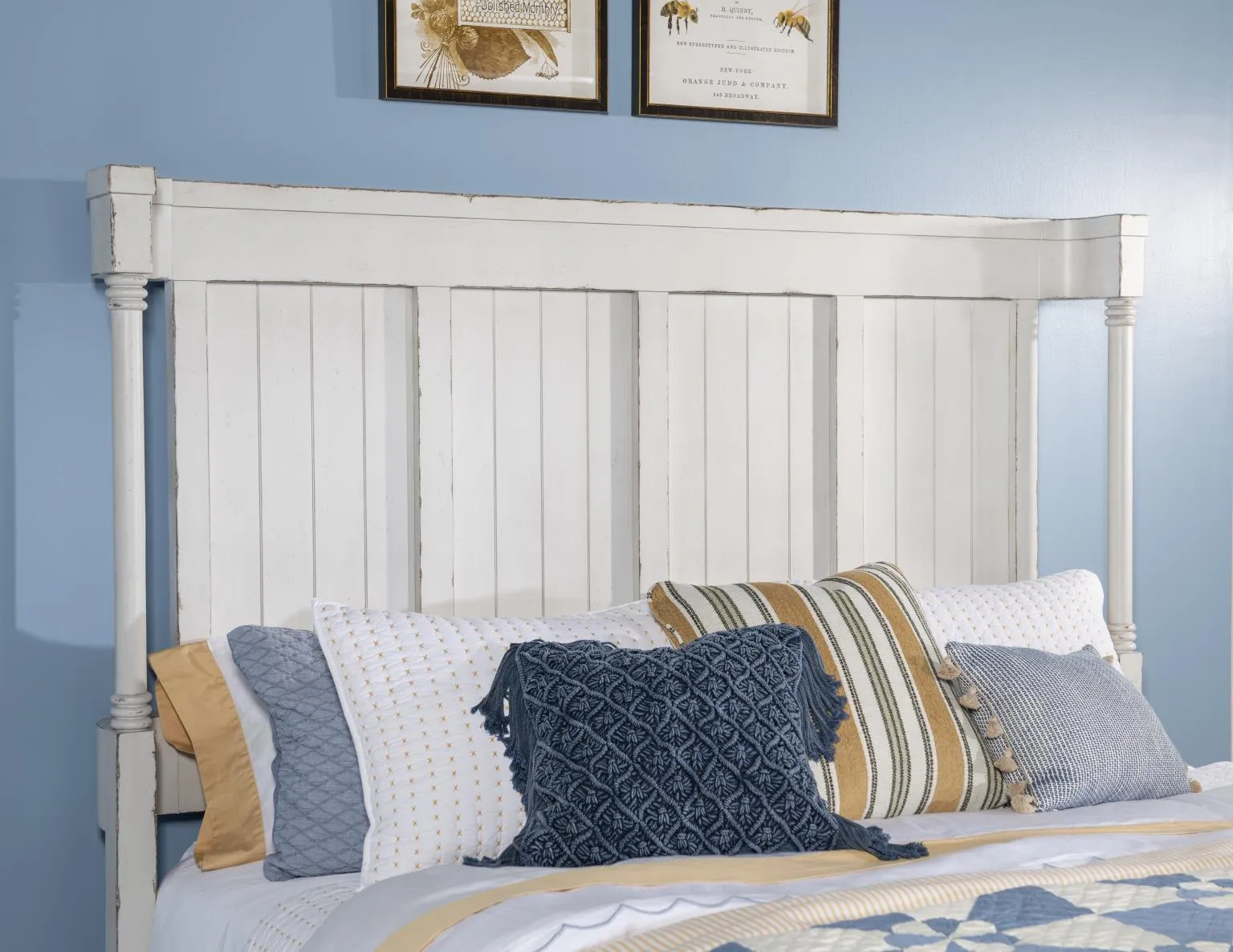 The Country Living Vintage Market Shelter King Bed in Picket Fence by Legacy Classic Furniture is a solid wood shelter bed featuring aged finishes and timeless farmhouse design, available in Picket Fence or Barnwood. Perfect for farmhouse, cottage, or traditional bedrooms, it reflects the authentic charm and warmth of the Country Living Collection, bringing a sense of comfort and craftsmanship to your home.