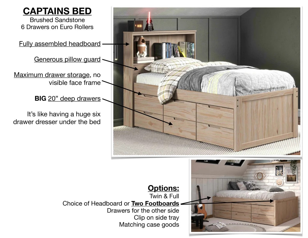 The Innovations Captains Bed with Headboard in Sandstone is a full size, storage enhanced bed designed for both functionality and affordability. With its built-in bookcase front headboard and compact dimensions, it’s an ideal choice for maximizing space in cozy bedrooms. The neutral sandstone finish offers a clean look that blends effortlessly with a range of décor styles.Available in Twin or Full offering flexibility to fit different rooms and storage needs.
