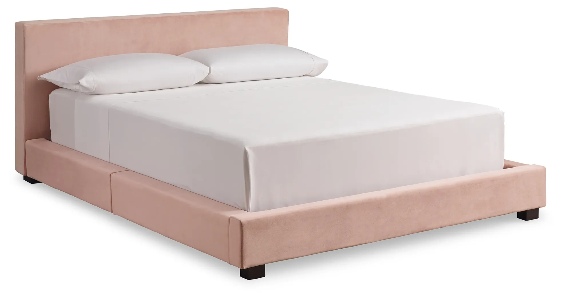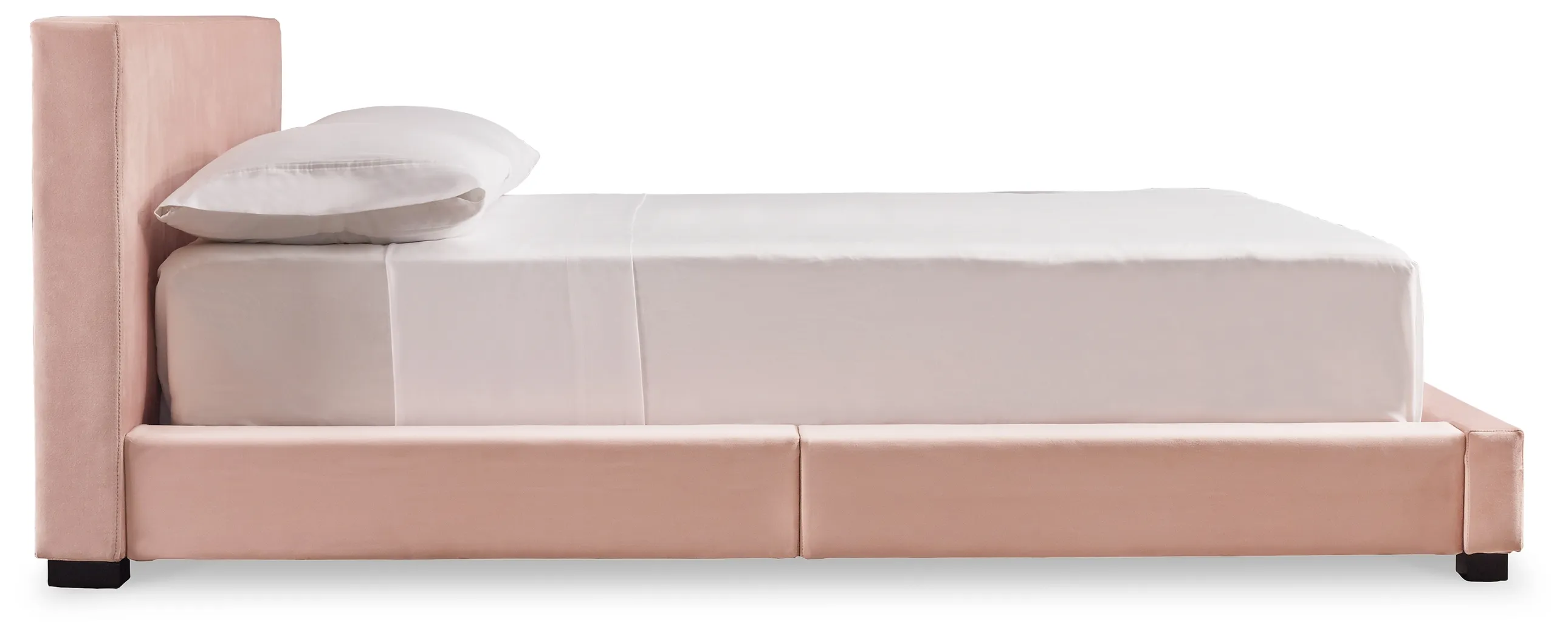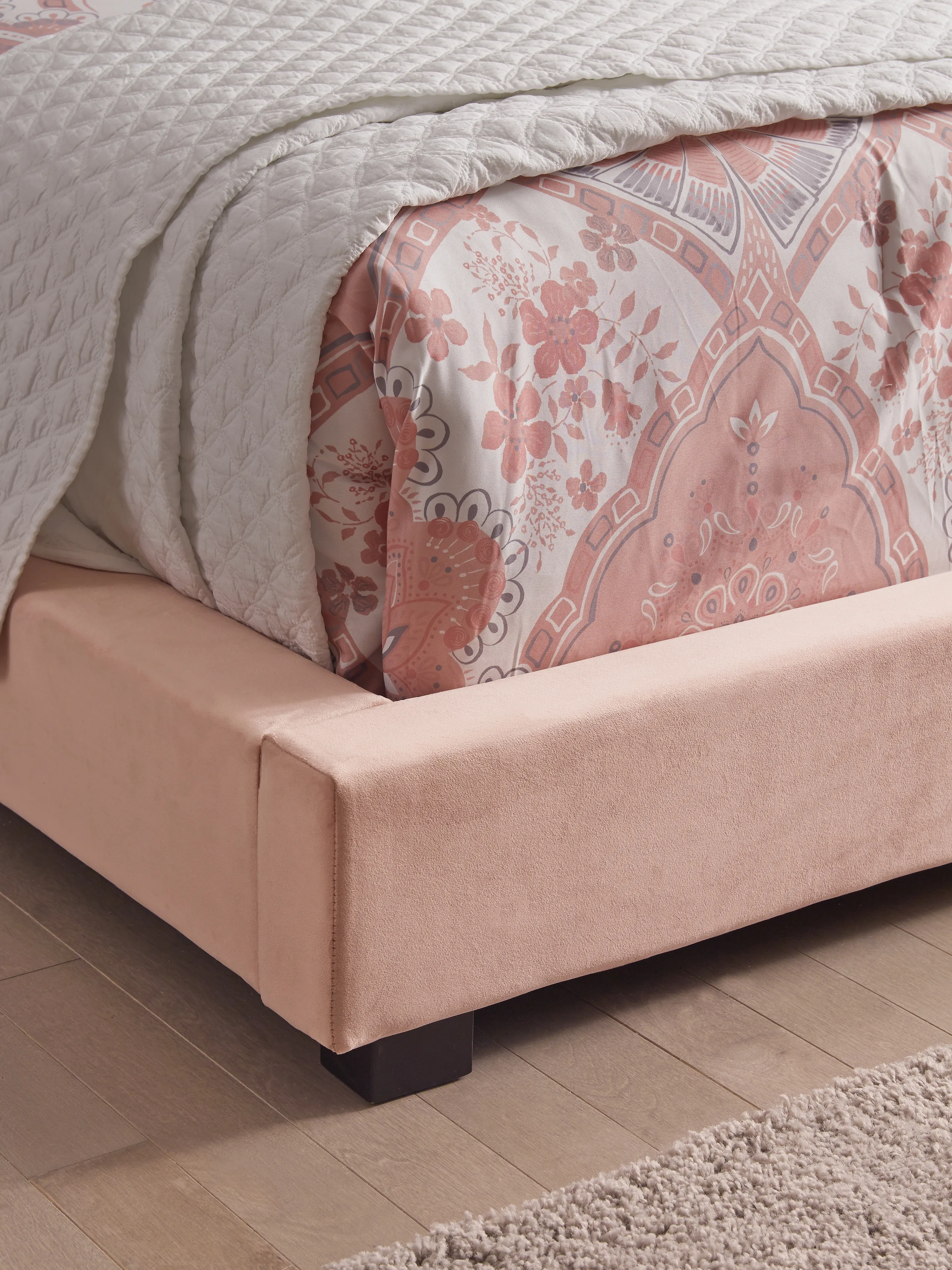 A striking piece with a plush look and sturdy support, this scrumptious upholstered bed is sure to make an impression. The extra-thick side rails and headboard panels are cushioned with foam for a decadent feel, while pink upholstery adds a splash of color in a velvet-like fabric for eye-catching appeal.