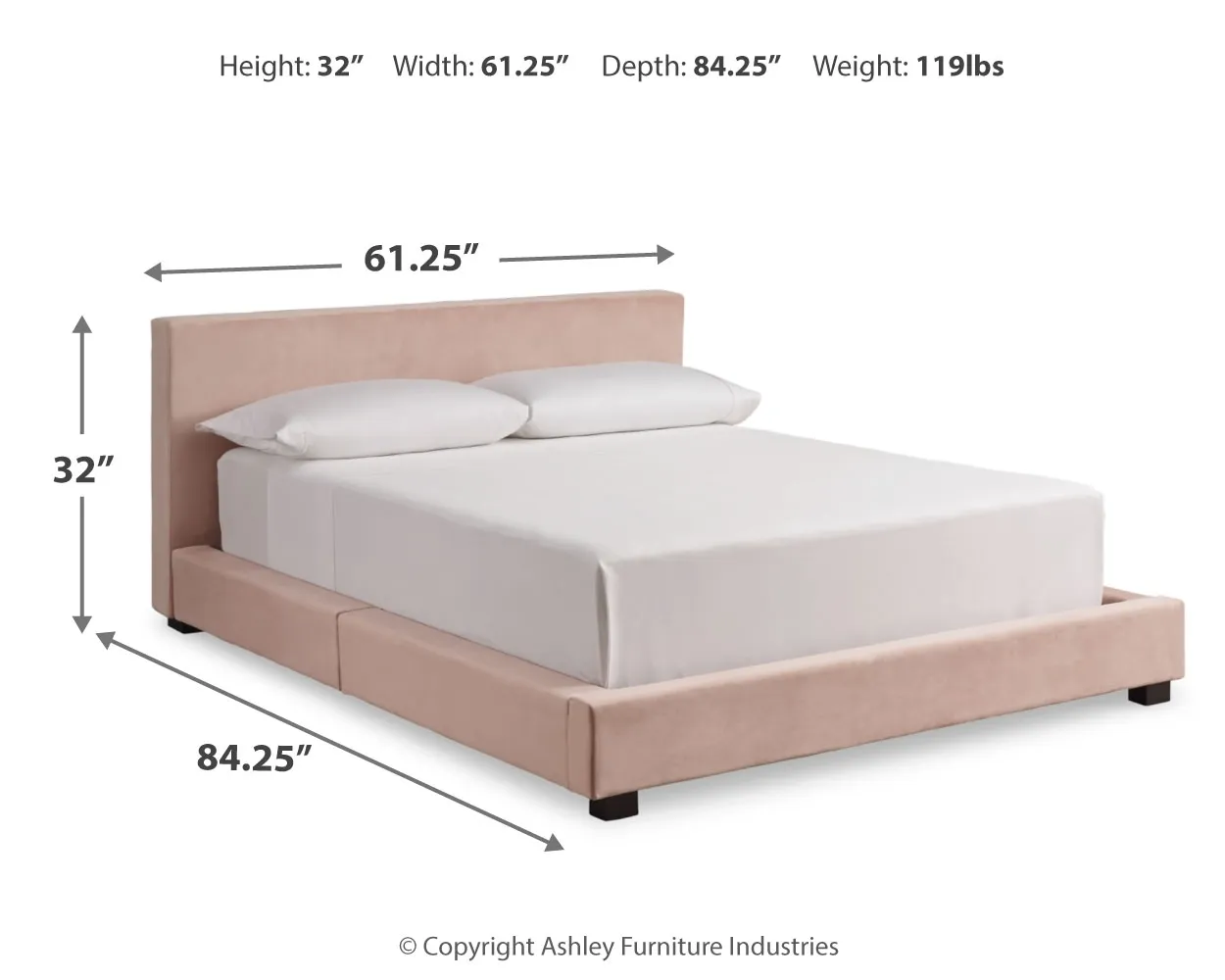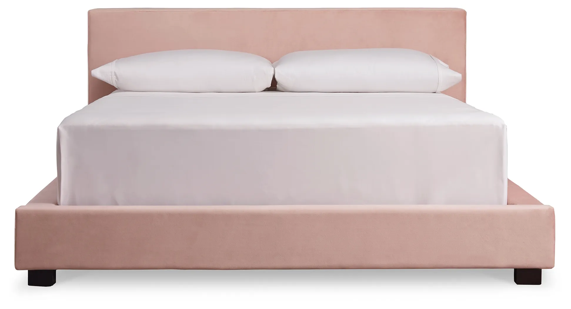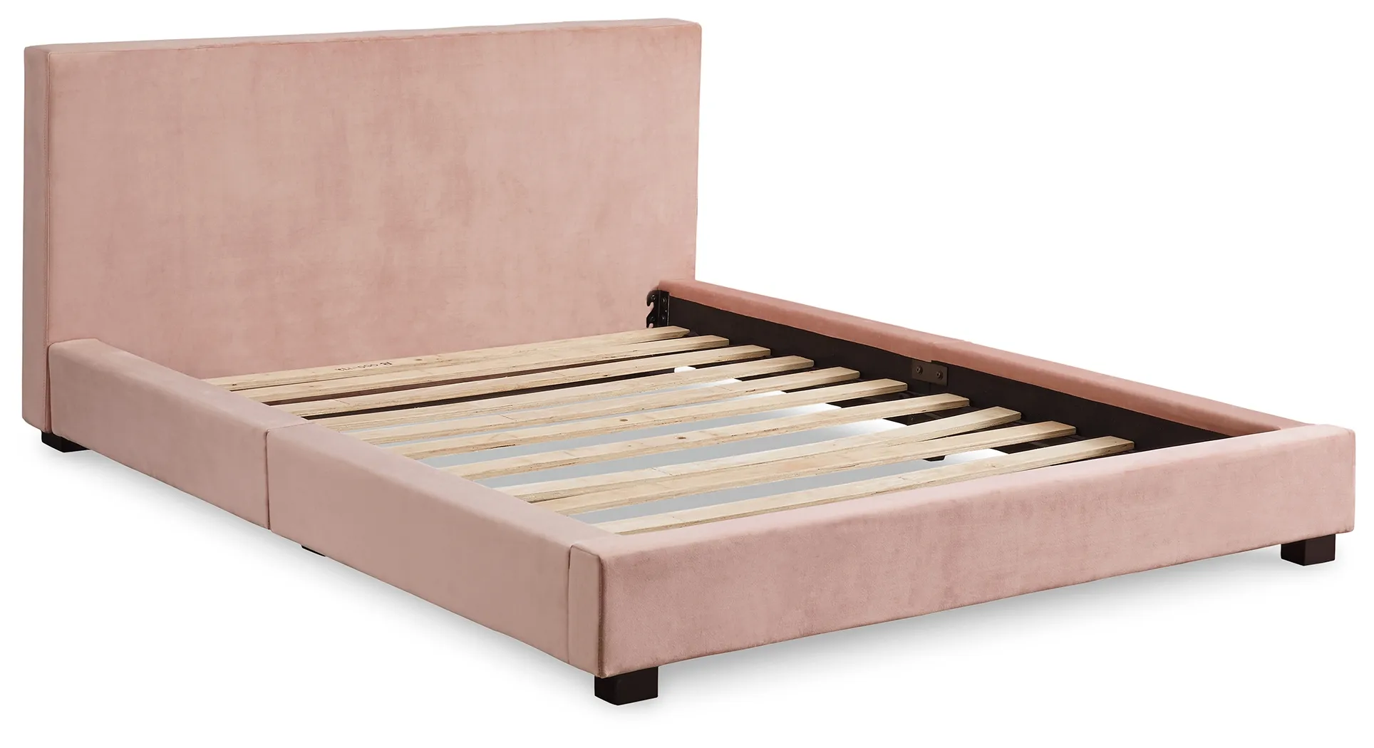 A striking piece with a plush look and sturdy support, this scrumptious upholstered bed is sure to make an impression. The extra-thick side rails and headboard panels are cushioned with foam for a decadent feel, while pink upholstery adds a splash of color in a velvet-like fabric for eye-catching appeal.