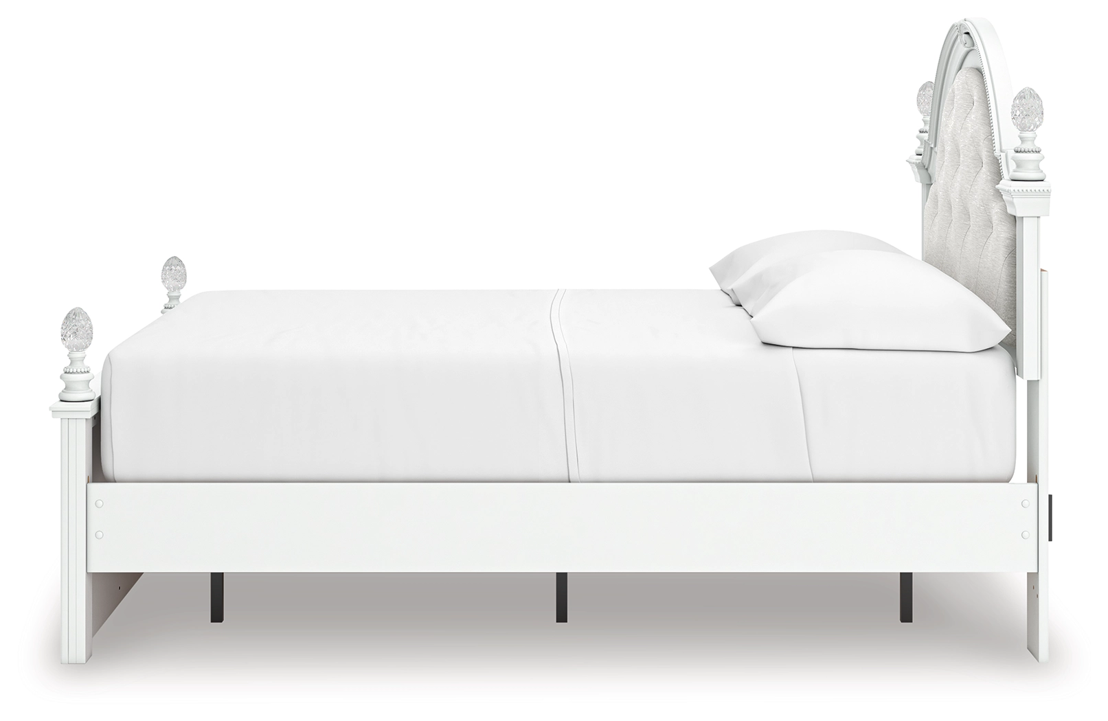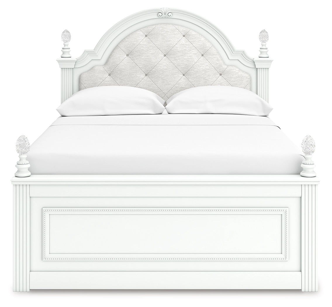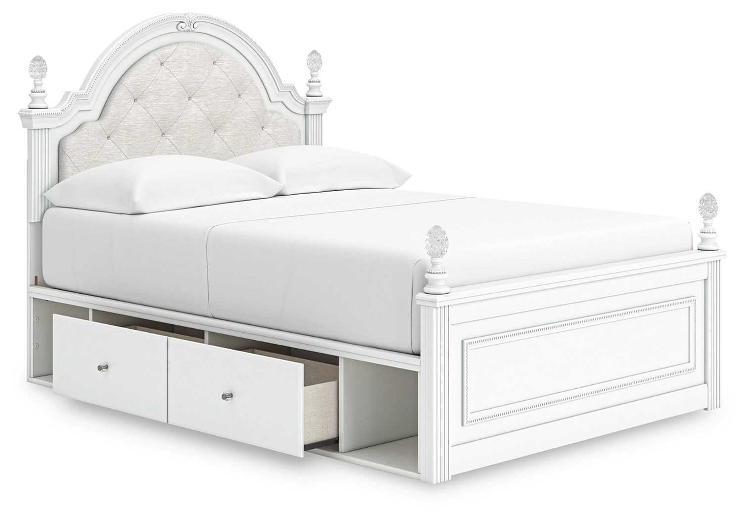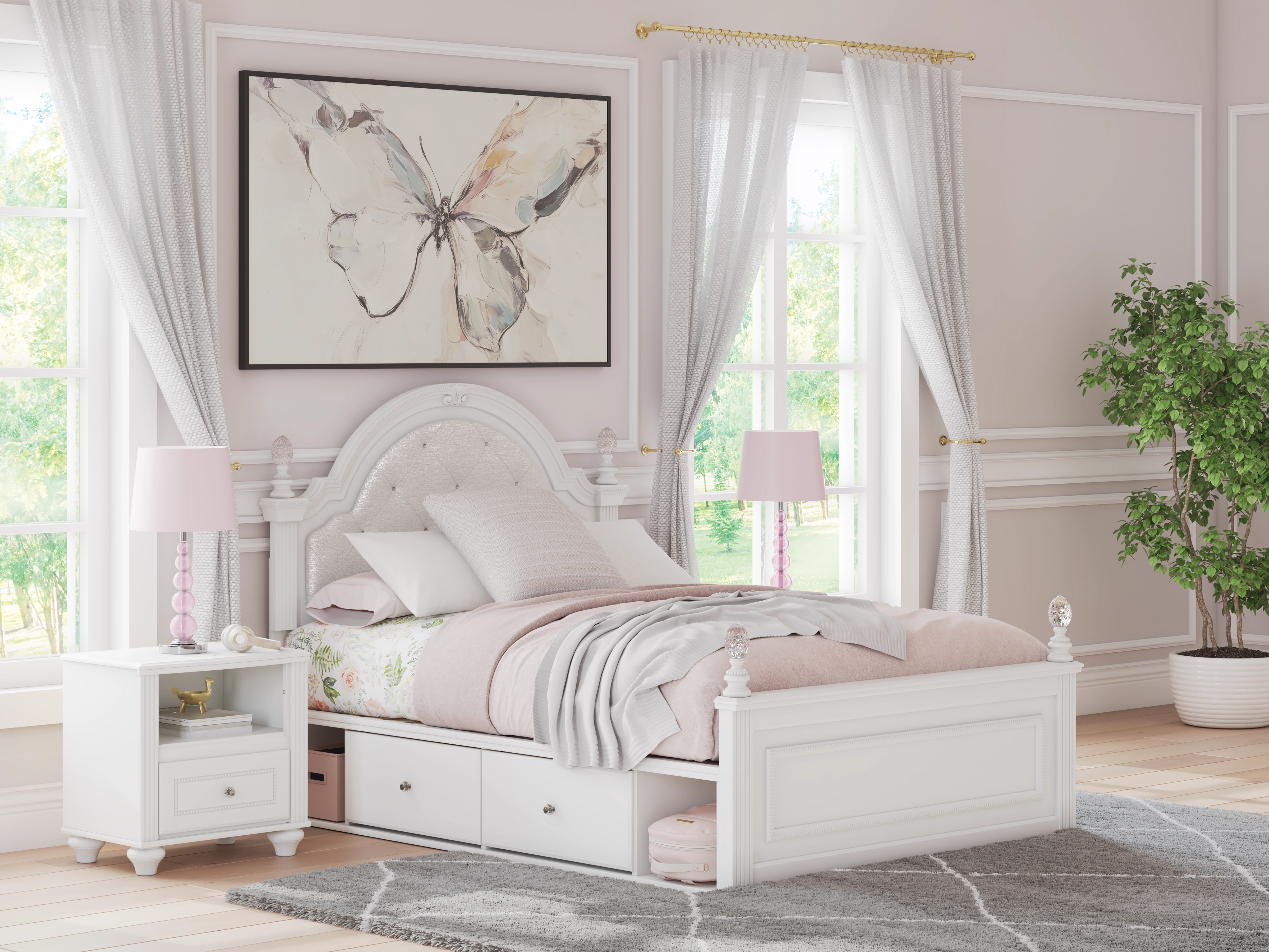 Fit for a princess. This full upholstered panel storage bed’s crisp matte white finish pairs with charming ornate beading details and sumptuous button-tufted upholstery—perfect for your girly girl. Spacious storage drawers neatly tuck away bedroom essentials, while decorative ball tops and multicolored LED lighting in the headboard are the crowning touches to make your little one feel like royalty.