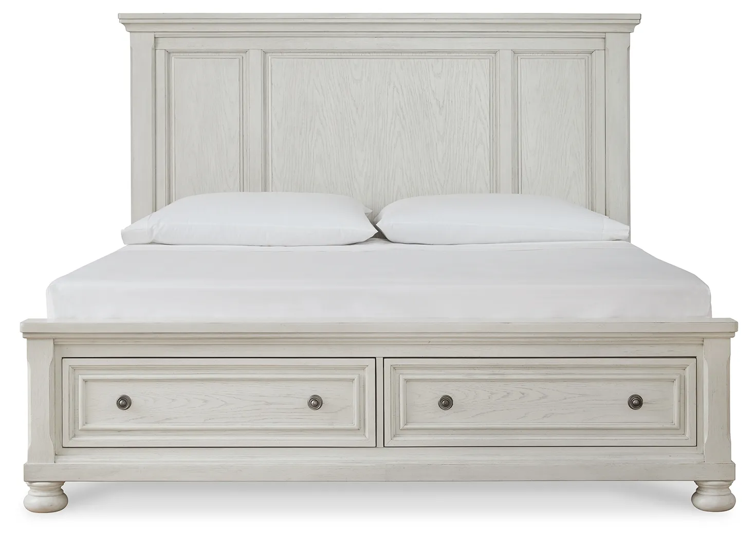 Elegant and timeless, this king panel storage bed brings style and function to your bedroom. The antiqued white finish features a sophisticated wood grain texture, while the dark bronze-tone hardware adds an ornate touch to the handy storage drawers. The Robbinsdale bed is perfect for keeping your bedroom beautiful and organized.