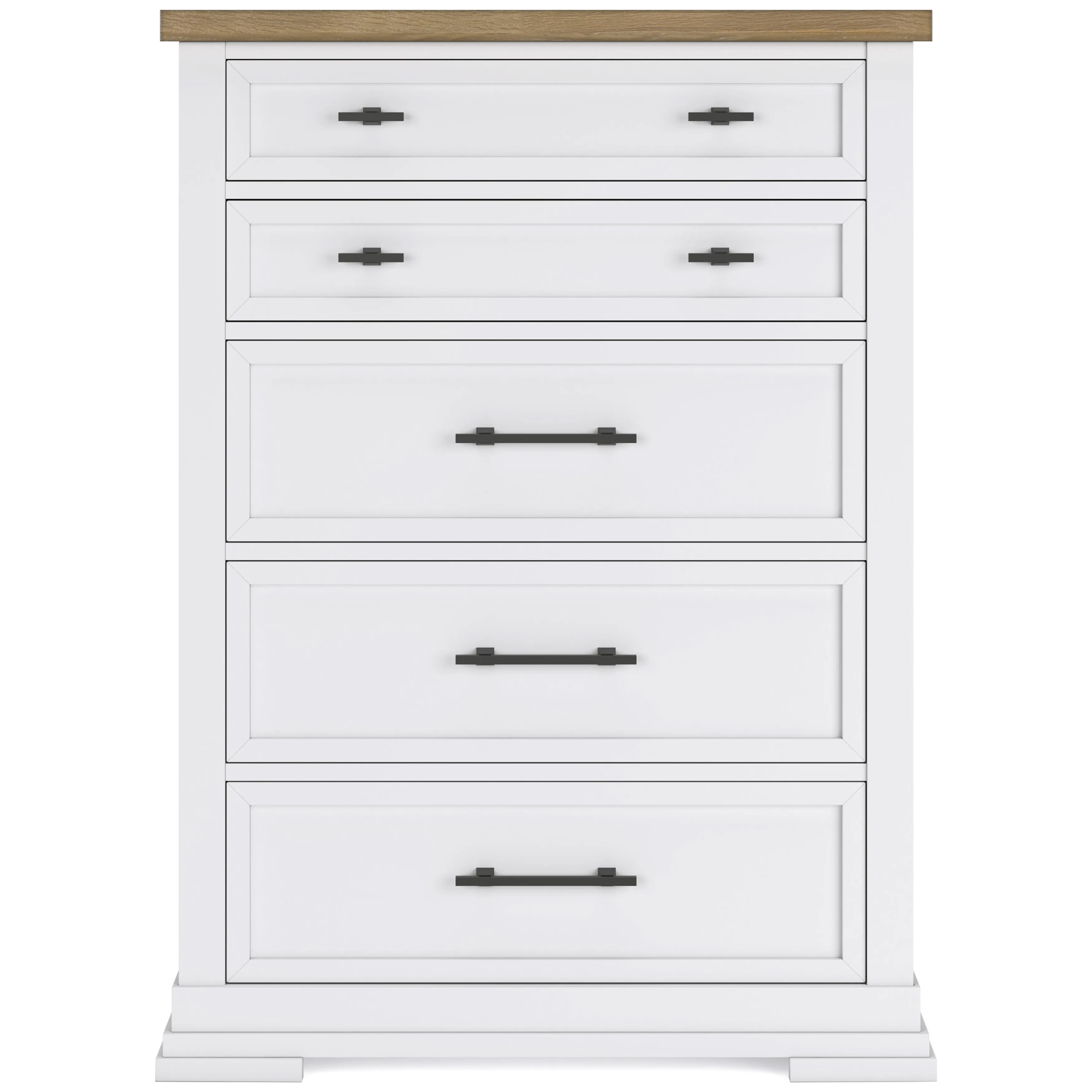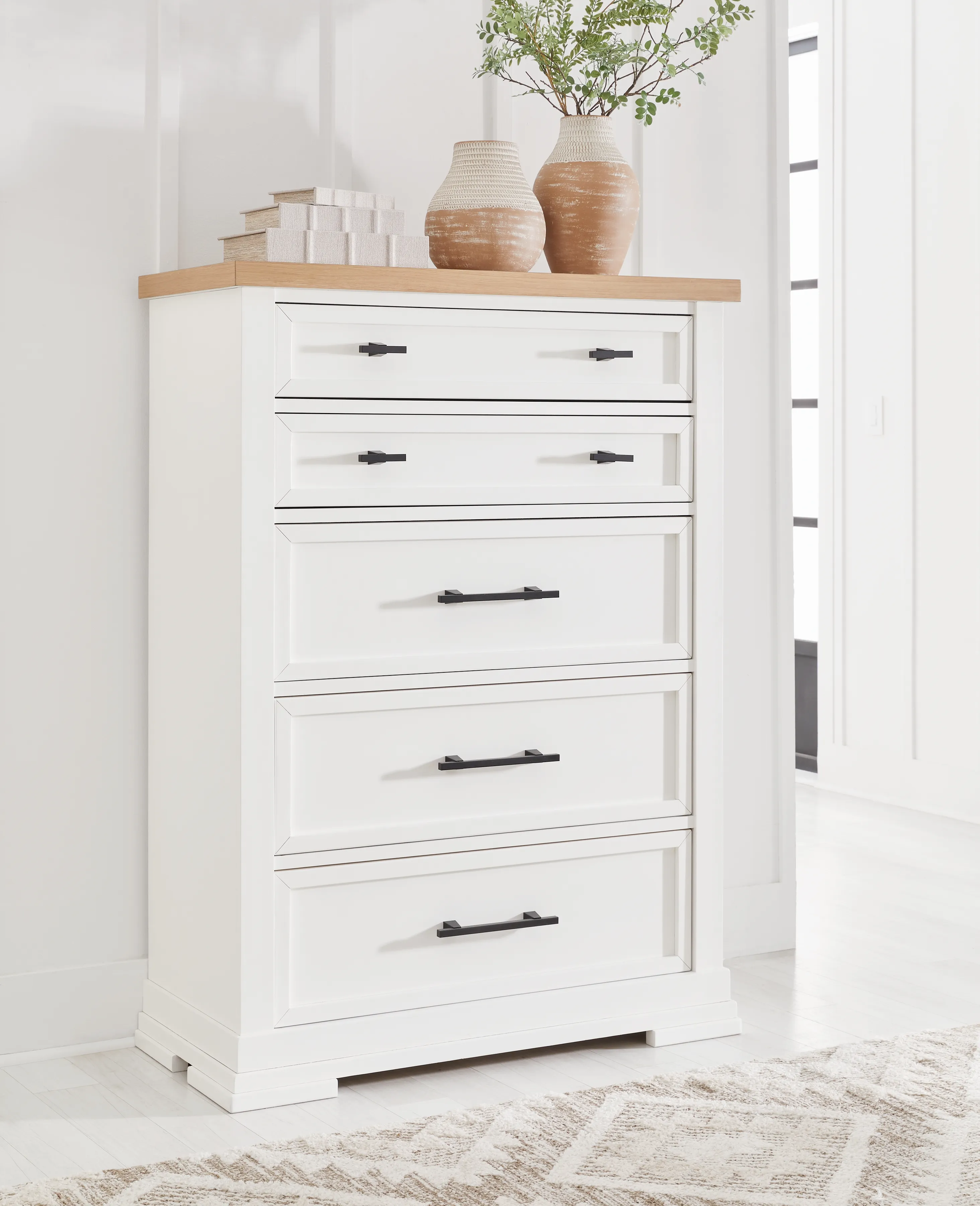 Casual style with substance. The two-tone Ashbryn chest of drawers raises the bar on comfortably cozy design in your soothing sanctuary. A sturdy silhouette with a classic white finish and black metal hardware exudes modern farmhouse vibes. The butcher block oak veneer top adds a relaxed aesthetic. And this charmingly curated piece is spacious enough for all your essentials.