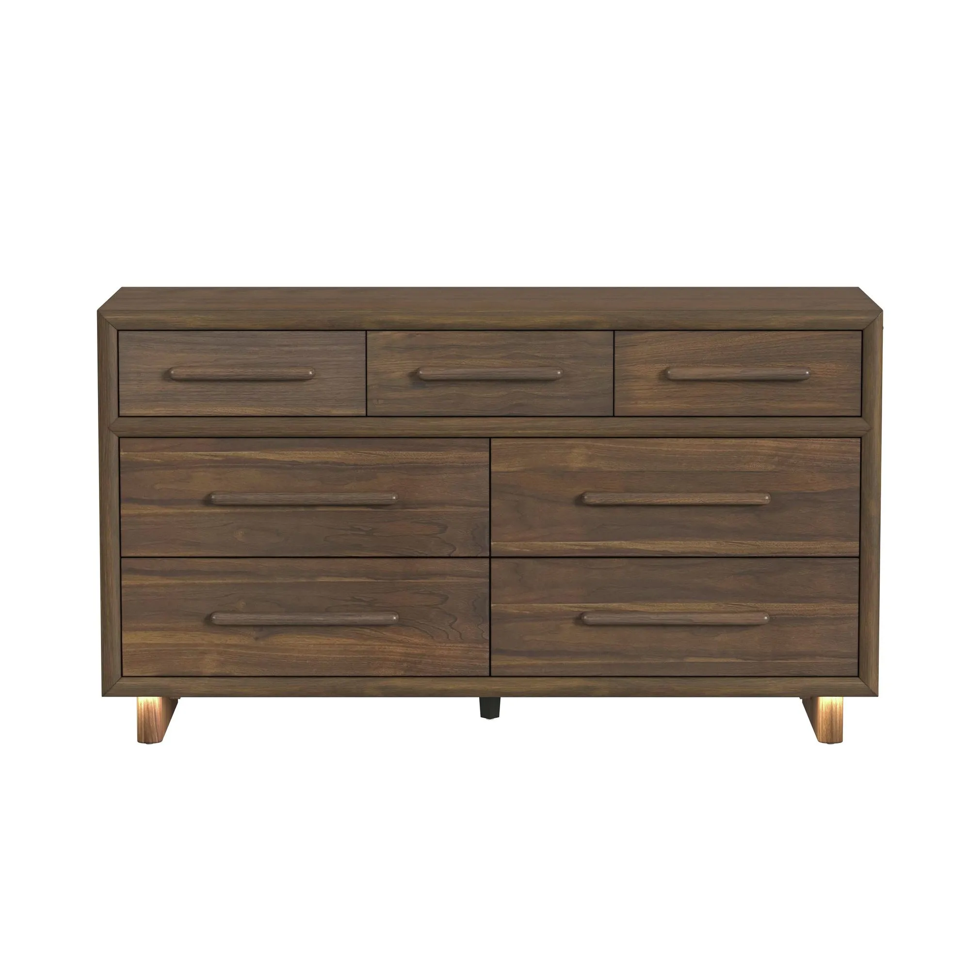 Adorn your bedroom with the charming mid-century modern style of the Brisbane Dresser with LED in Brown. Crafted from solid wood and a high-quality walnut veneer, this dresser is as durable as it is stylish. Spacious drawers offer ample space for storing your essentials, and top-row drawers with protective felt lining and a jewelry tray reflect thoughtful design. Minimalist, wood drawer handles and a double pedestal base add charming detail, while LED lighting enhances the piece’s visual aesthetic. For a timeless, durable, and stylish addition to your bedroom, the Brisbane Dresser with LED is an ideal choice.