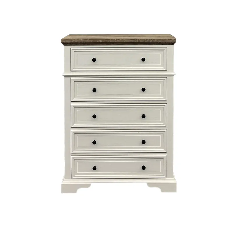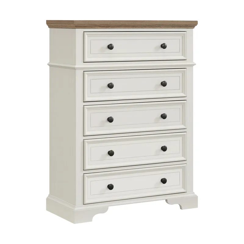Create an inviting sanctuary with the beautifully crafted Eastwood collection that exudes timeless charm and elegance. The two-tone design with rich brown top adds depth and sophistication to this case piece. Experience practicality with a felt-lined top drawer for delicate items, smooth ball-bearing drawer guides, and durable French dovetail construction. With added safety from an anti-tipping kit, this chest from the Eastwood collection blends intricate detail, functionality, and durability for an enchanting bedroom experience.