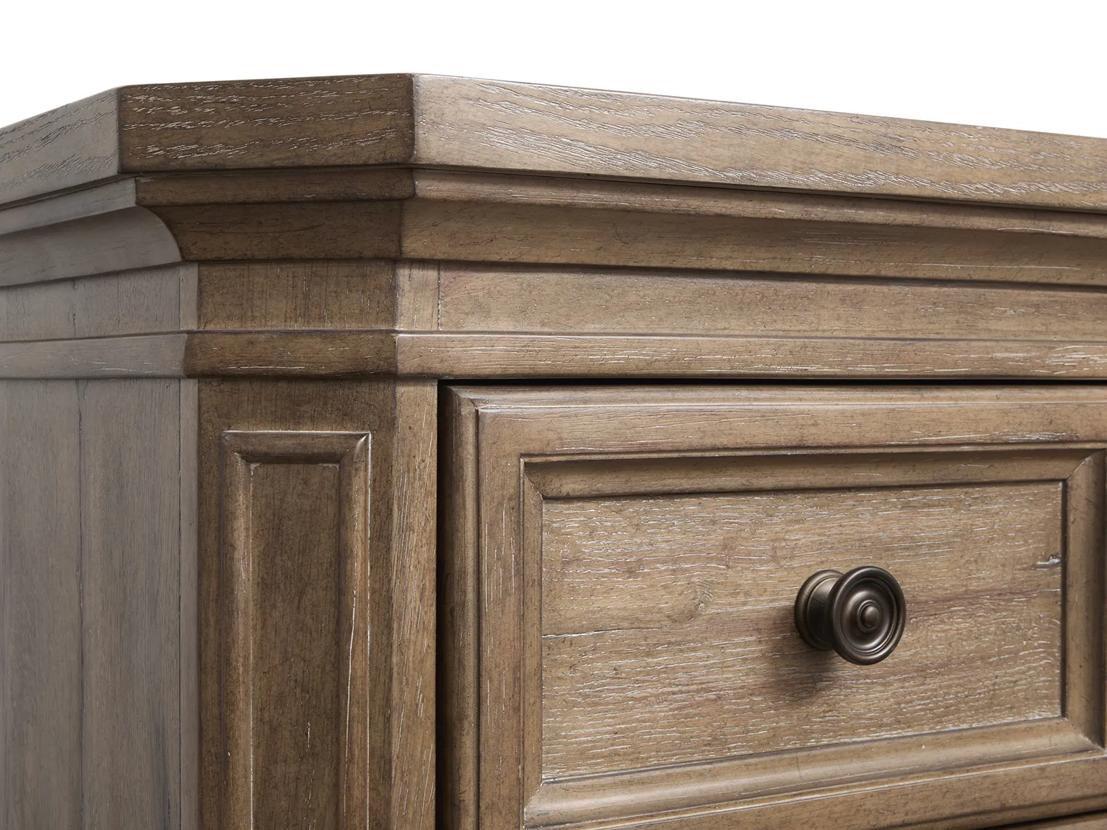 The Adler Court Chest of Drawers by Magnussen Home embodies timeless elegance and meticulous craftsmanship, offering refined storage for today’s classic interiors. Built from European Rustic oak veneers in a Florentine Walnut finish, this chest highlights traditional moldings, canted corners, and aged bronze hardware that enhance its sophisticated look. Five spacious drawers—with the appearance of seven—provide ample organization, while the felt-lined top drawer keeps delicate items safely tucked away. Each drawer is constructed with French dovetail fronts, English dovetail backs, and smooth ball-bearing guides for long-lasting durability and ease of use. Finished with a sealed case and levelers on the front feet, this elegant storage piece balances enduring strength with timeless appeal.