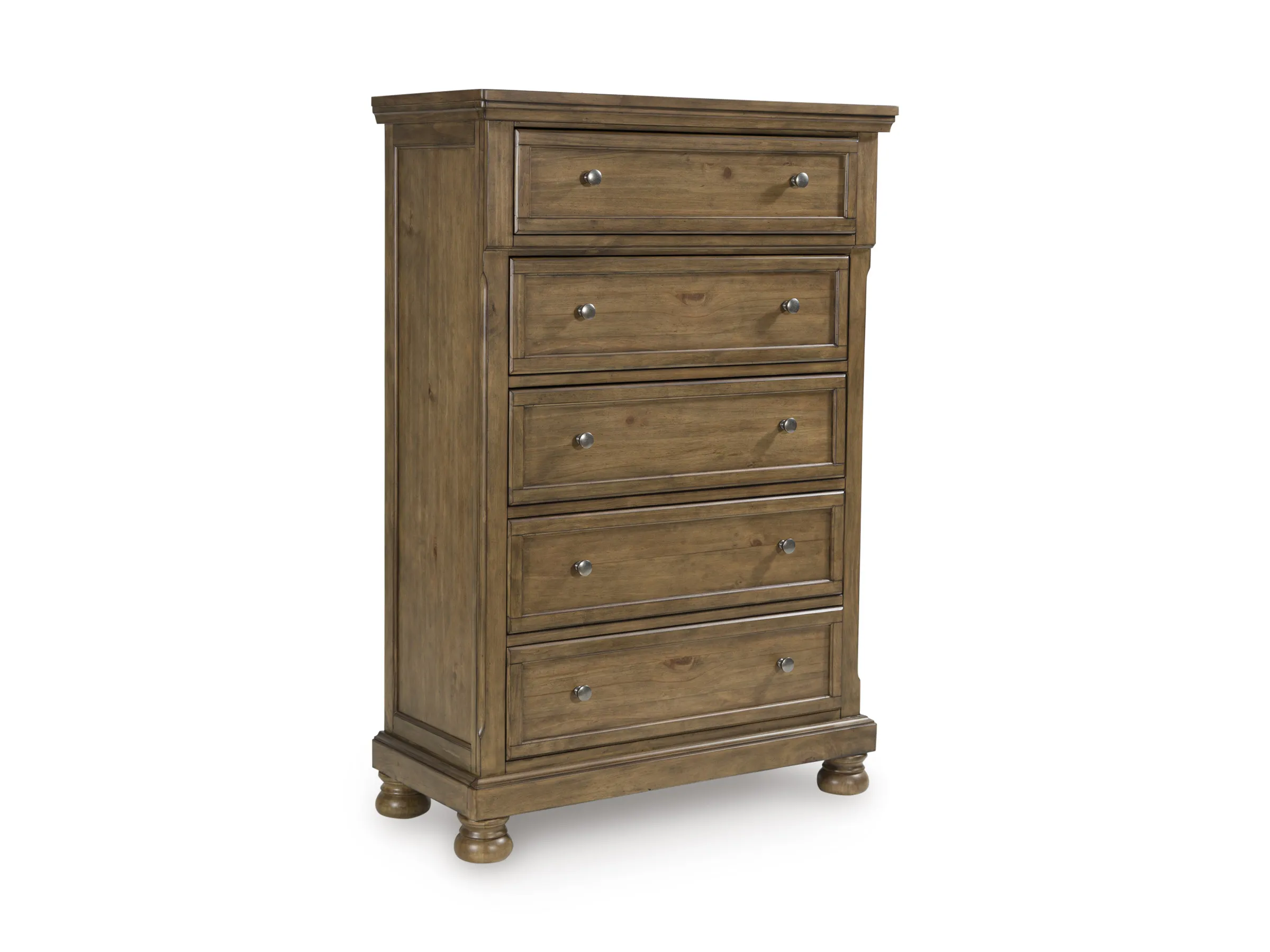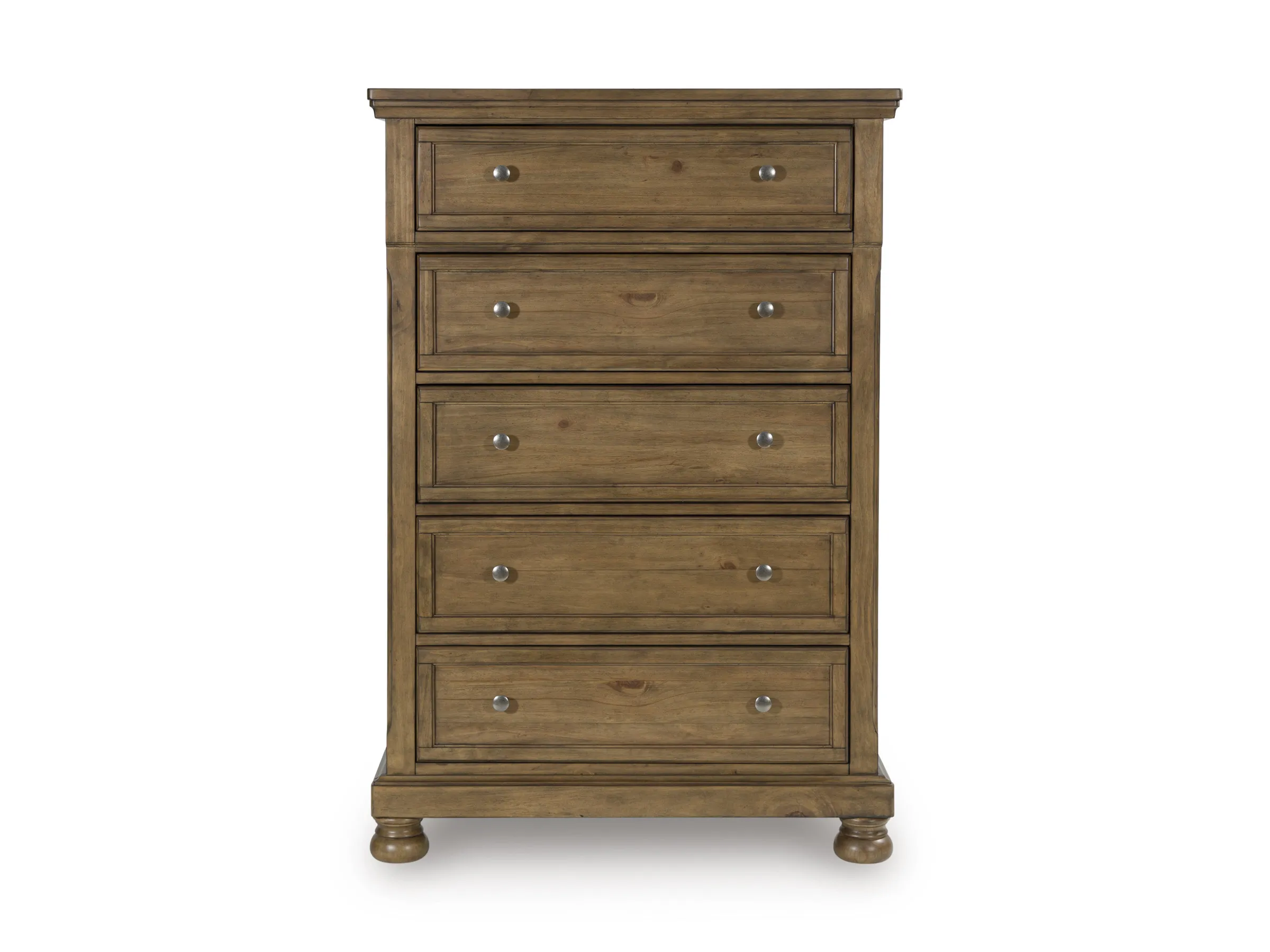 A relaxed take on casual traditional design, this chest of drawers strikes a comfy pose with a classic sensibility. Its timeless design and chestnut brown wood-tone create a welcoming retreat tailored to your laid-back lifestyle. Metal knobs in an aged pewter color subtly dress up drawers packed with storage possibilities.