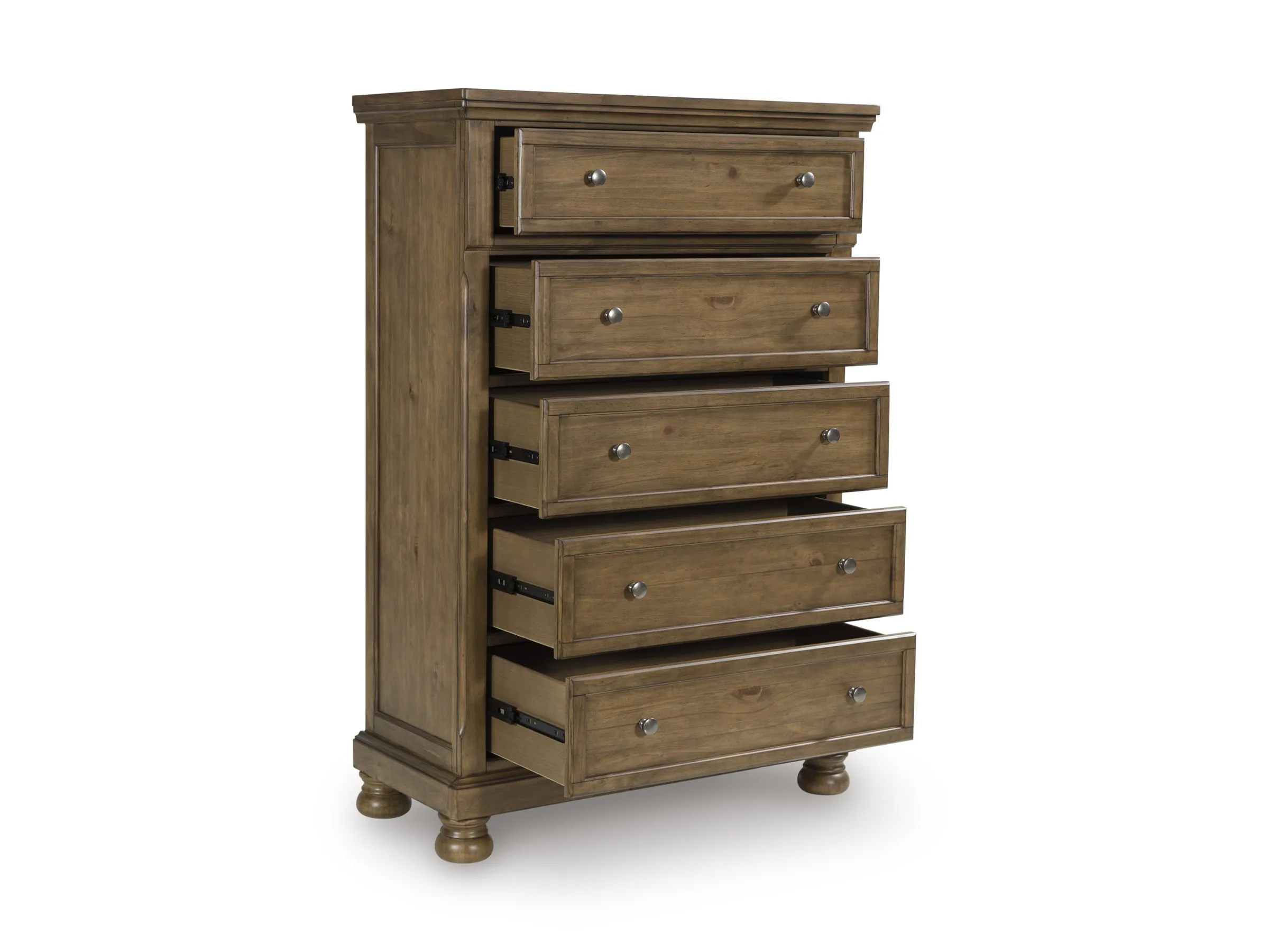 - 5 smooth-gliding drawers with fully finished interiors, English dovetail construction and heavy-duty ball-bearing side glides (top drawer felt lined)