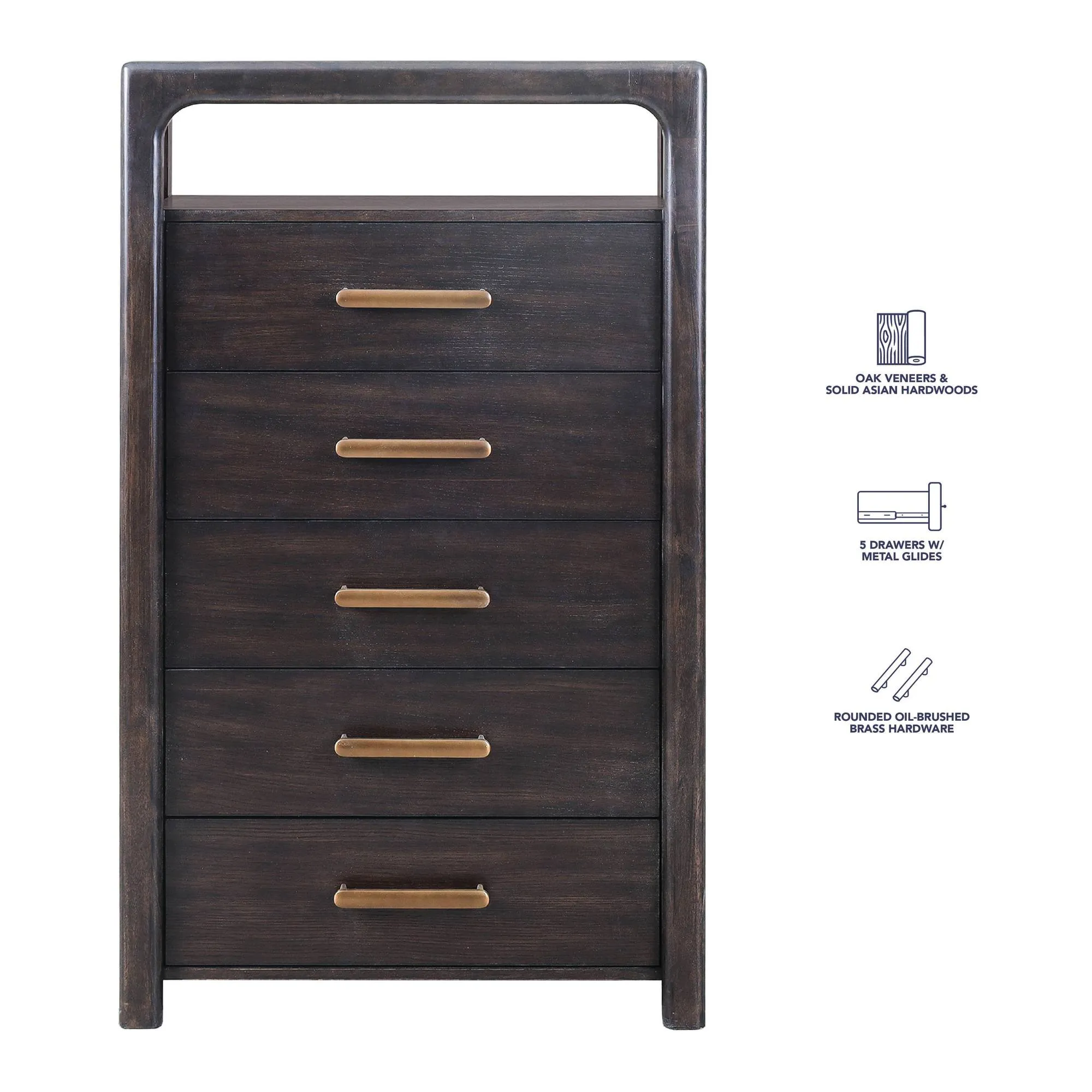 The Sigmund 5-Drawer Chest adds a touch of modern-rustic sophistication to the bedroom with its graceful, elongated profile. Crafted from oak veneers and solid Asian hardwoods in a rich sable finish, it delivers durable, spacious storage through five English-dovetailed drawers that open with smooth, secure glides. Subtle design elements—like the collection’s softly rounded edges and sculpted corners—enhance its warm, refined character, making the chest both a practical storage piece and an eye-catching design statement.