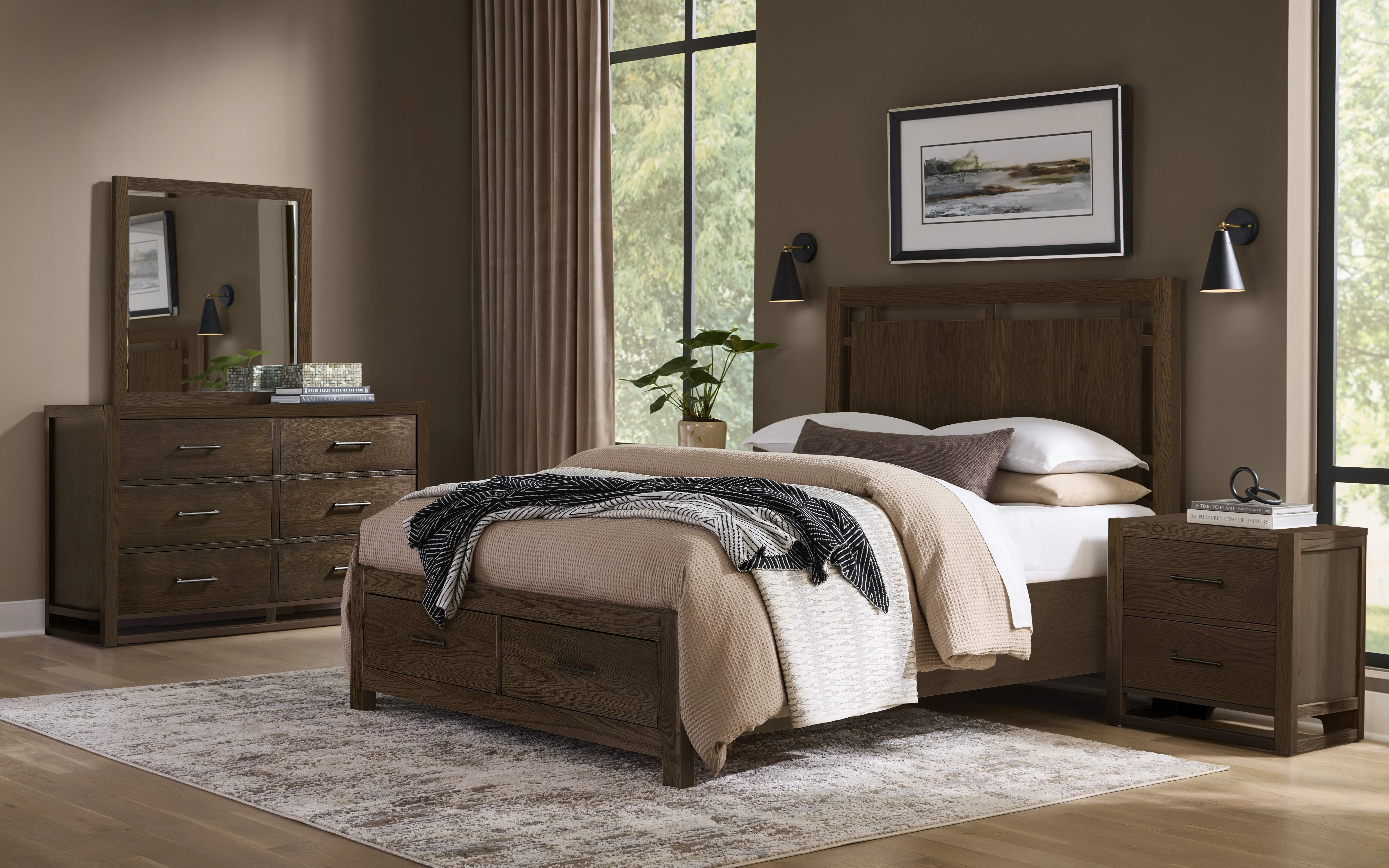 The Lodge & Loft 6 Drawer Dresser by Vaughan-Bassett combines contemporary craftsmanship with the organic beauty of American white oak. Available in Dark Oak and Blond Oak finishes, this dresser showcases the collection’s signature balance of modern lines and rustic warmth, highlighting the bold grain patterns and unique character of solid oak. Its streamlined silhouette and custom metal hardware make it a versatile statement piece that complements a variety of bedroom styles, from modern rustic to transitional.