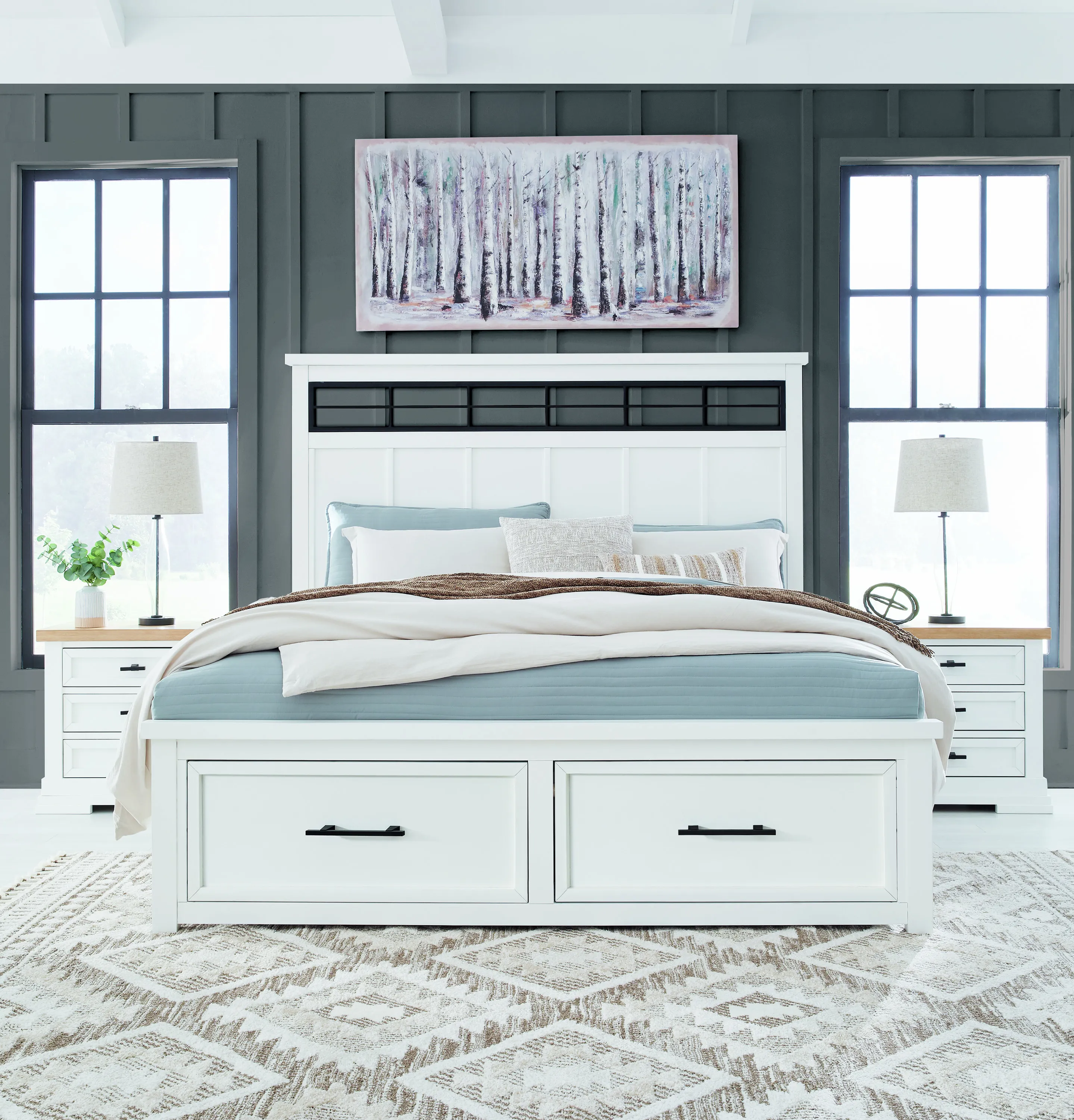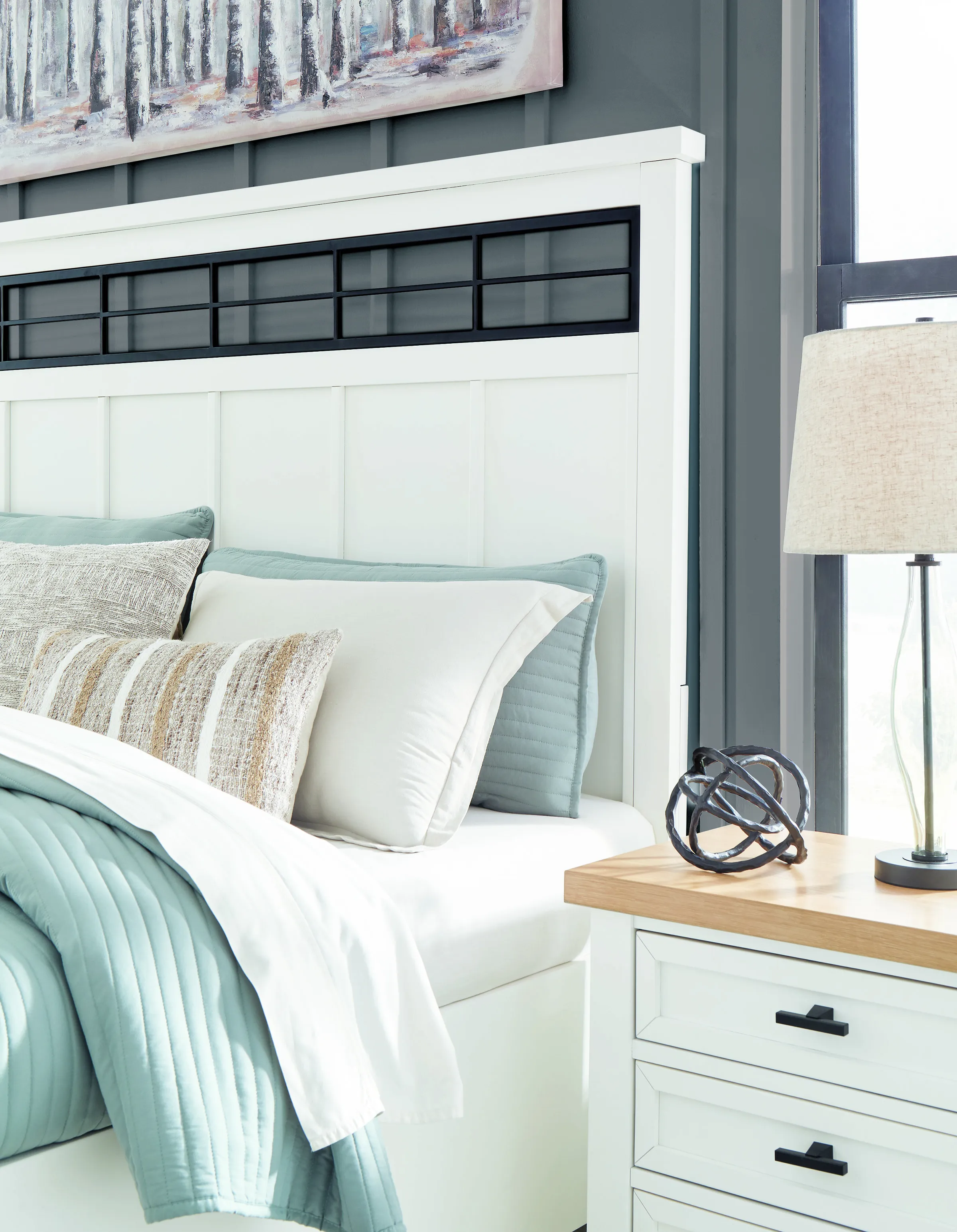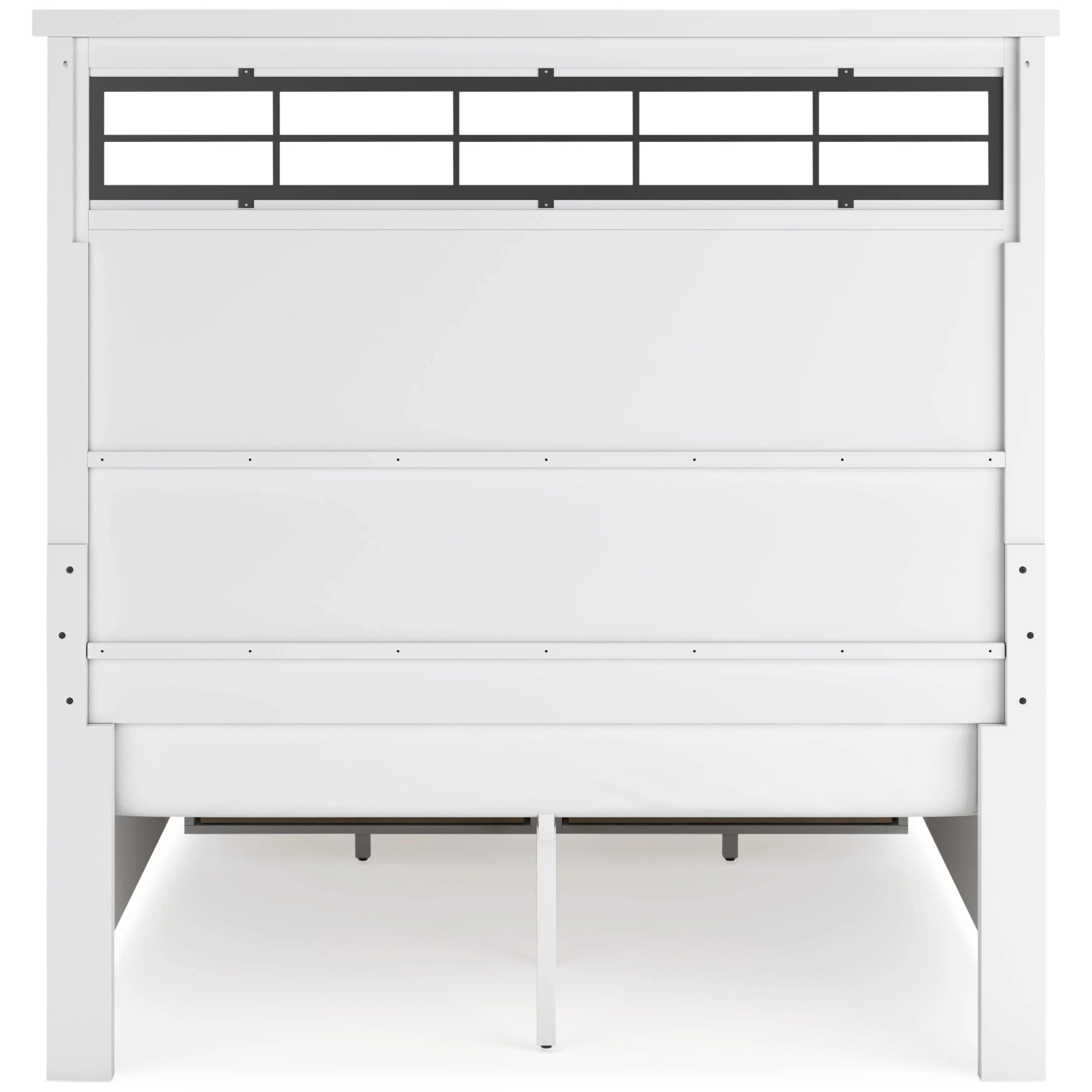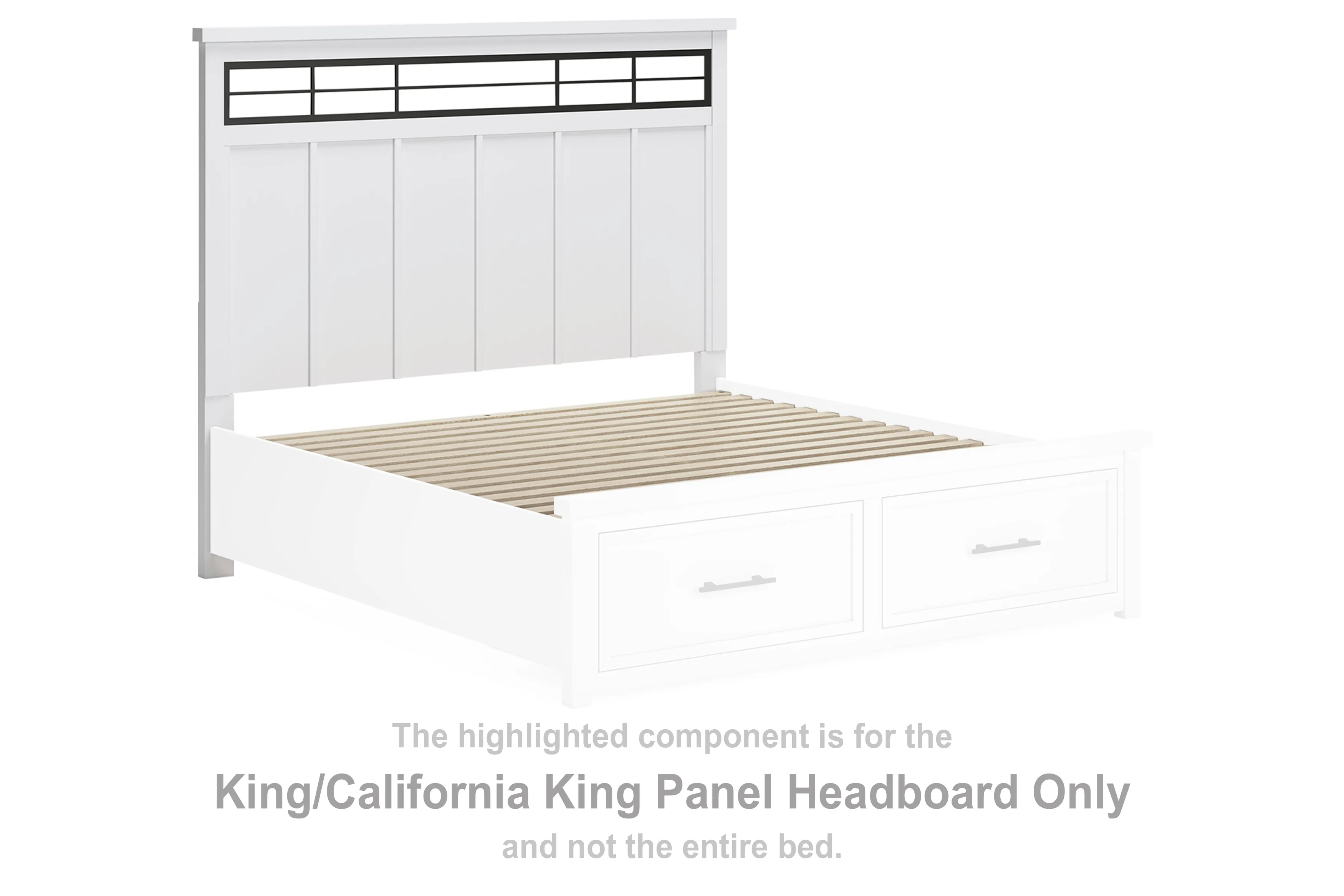 The Ashbryn king/California king panel headboard delivers casual style with substance. An inset metal detail on the headboard displays a unique take on modern farmhouse design. The sturdy silhouette, classic white finish and black accents exude a comfortably cozy vibe in your soothing sanctuary. Pairs with other items in the series to make a bed kit.