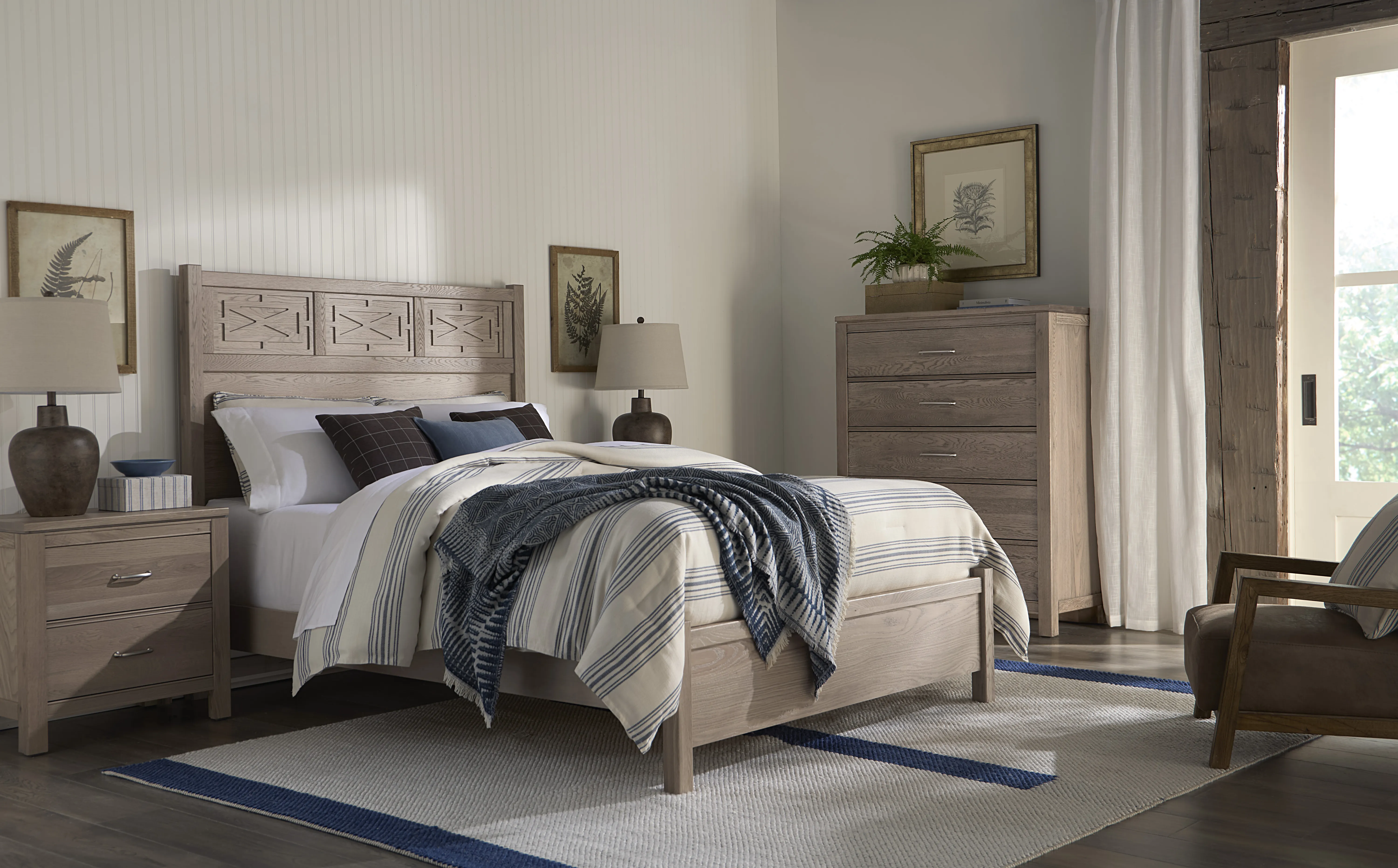 The Tide & Timber Fretwork Queen Panel Headboard in Grey Oak by Vaughan-Bassett is a solid oak headboard with raised fretwork panel detailing, offering American-made craftsmanship, sustainability, and lasting design. Perfect for modern farmhouse, rustic, or transitional bedrooms, it brings natural texture and timeless style to your home.