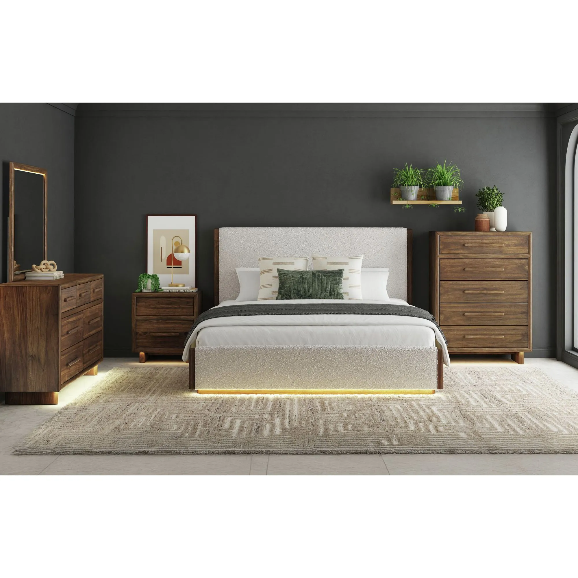 Adorn your bedroom with the charming mid-century modern style of the Brisbane Nightstand with USB and LED in Brown. Crafted from solid wood and a high-quality walnut veneer, this piece is as durable as it is stylish. Spacious drawers offer ample space for storing your essentials, and a top drawer with protective felt lining reflects thoughtful design. Minimalist, wood drawer handles and a double pedestal base add charming detail, while LED lighting and a USB port add practical, modern convenience. For a timeless, durable, and stylish addition to your bedroom, the Brisbane Nightstand with USB and LED is an ideal choice.
