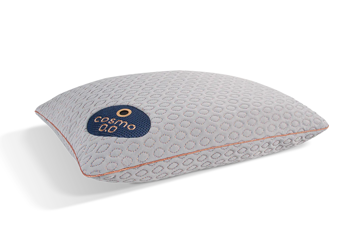 Cosmo has a dual chamber that is soft on one side and firmer on the other. It has a lofty, marquee-diamond pattern, gray-colored cover with rose-gold stitching and an instant-cooling feel. The lowest height pillow includes one air vent and a mesh patch on top and bottom while the other three heights include 10 air vents and mesh on all sides, giving the pillow cross-ventilation for maximum breathability. Cosmo's zip-off removable and washable cover creates a clean and healthy sleep envi