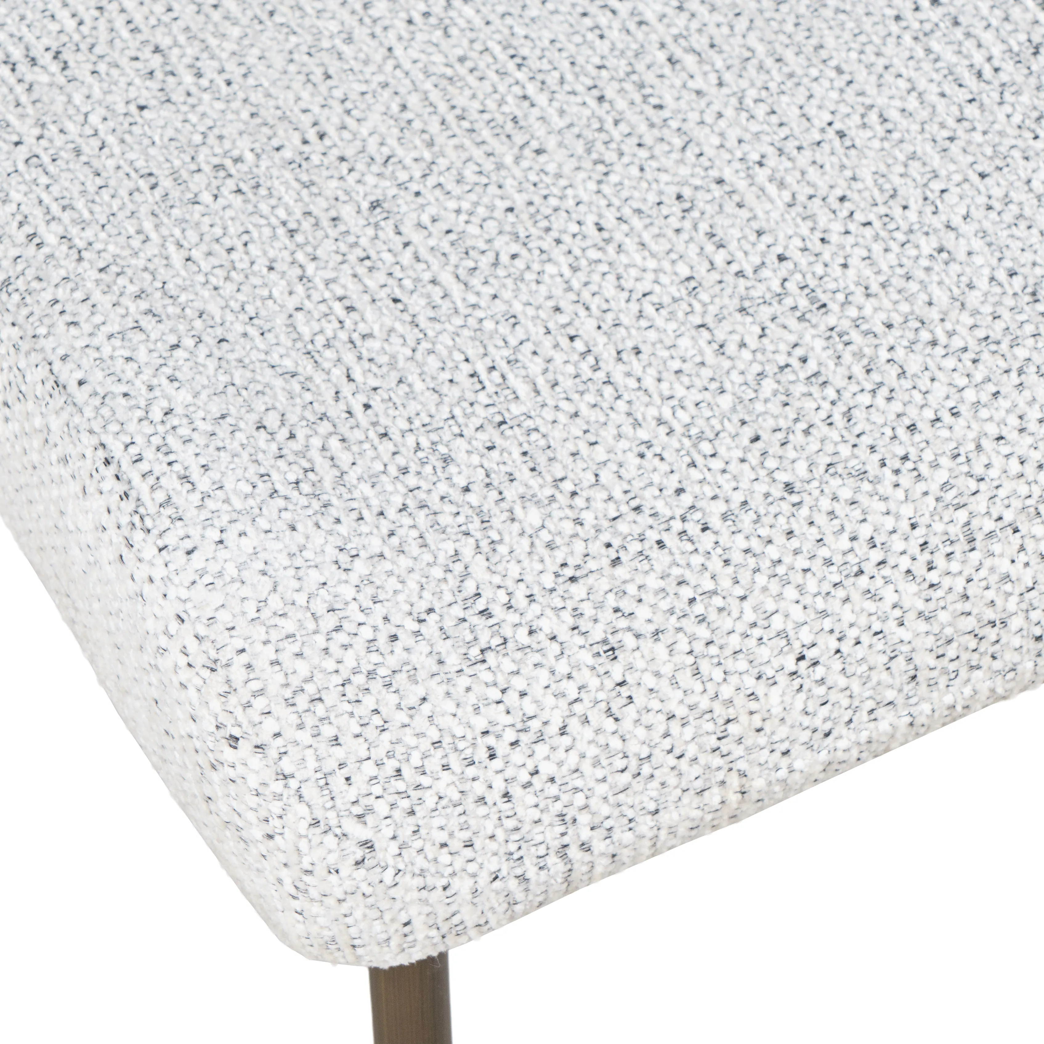 The Gibson Modern Upholstered Dining Chair blends everyday comfort with clean-lined sophistication. Wrapped in a soft, water-repellent performance fabric, the seat features a versatile woven blend of natural, grey, and black tones that pairs effortlessly with modern, transitional, or minimalist interiors. Gently contoured for support, the back and seat rest atop slim, tapered legs finished in antique brass-a warm metallic accent that adds subtle contrast to the soft fabric. Designed for durability and ease, the stain-resistant upholstery stands up to daily use while maintaining its refined look. Whether gathered around a wood table or styled as a standalone accent, Gibson brings elevated simplicity to your dining space. Sold as a set of two.