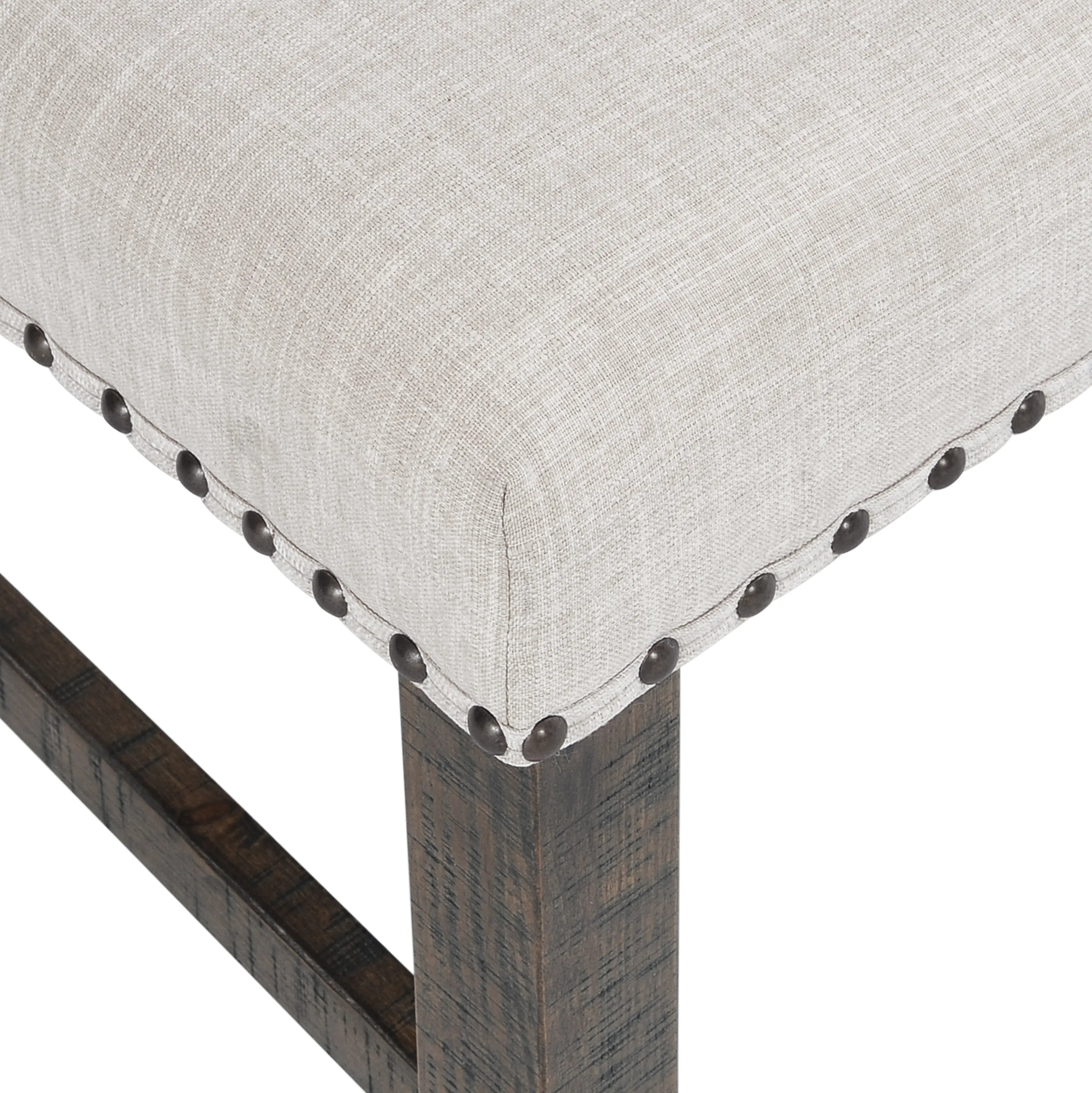 The Willow Creek collection blends the beauty of solid Pine with a rich distressed finish for a rustic style that is right at home. This set of two upholstered side chairs pair perfectly with the matching dining table, and the nailhead trim on cream fabric add a wonderful sophisticated accent.