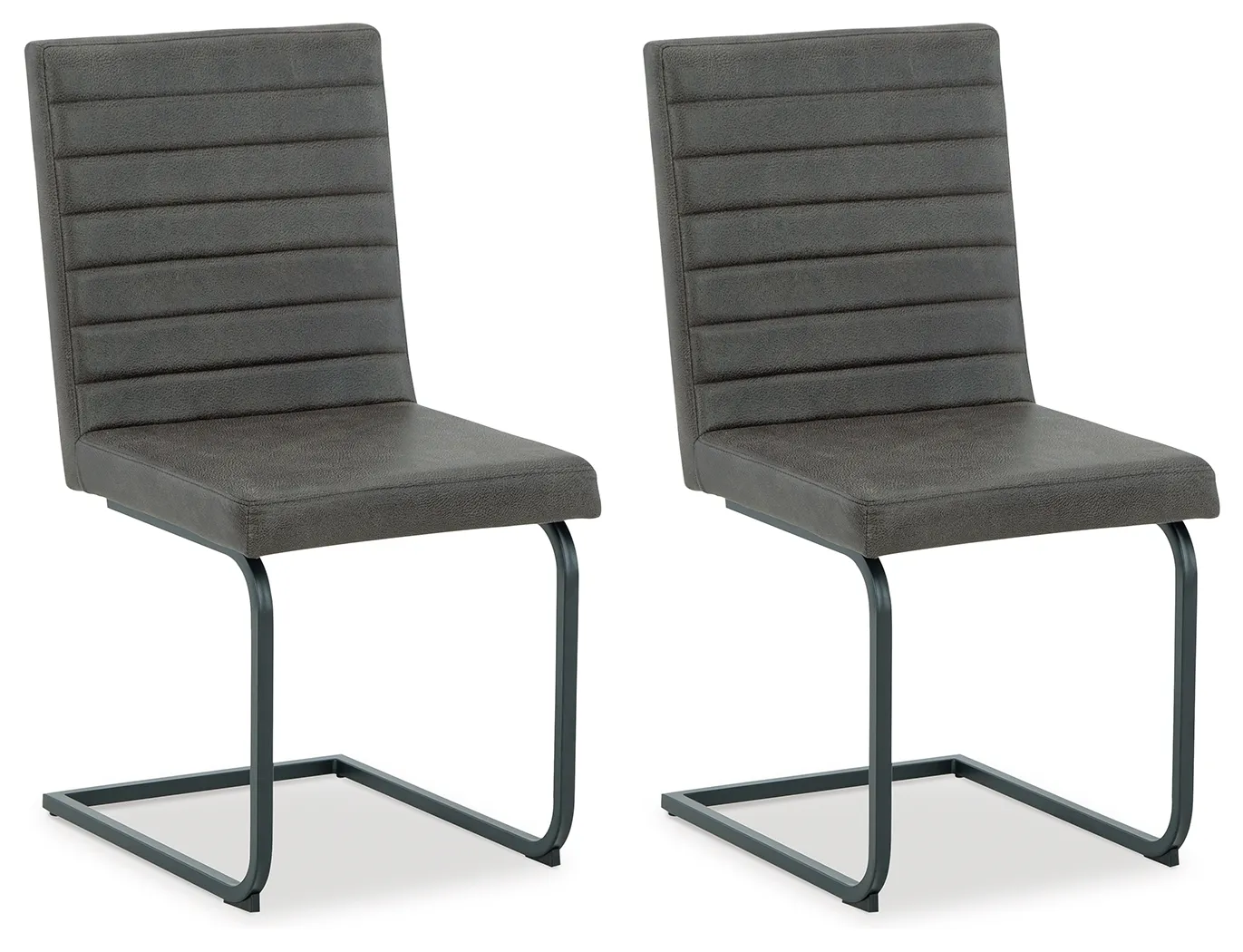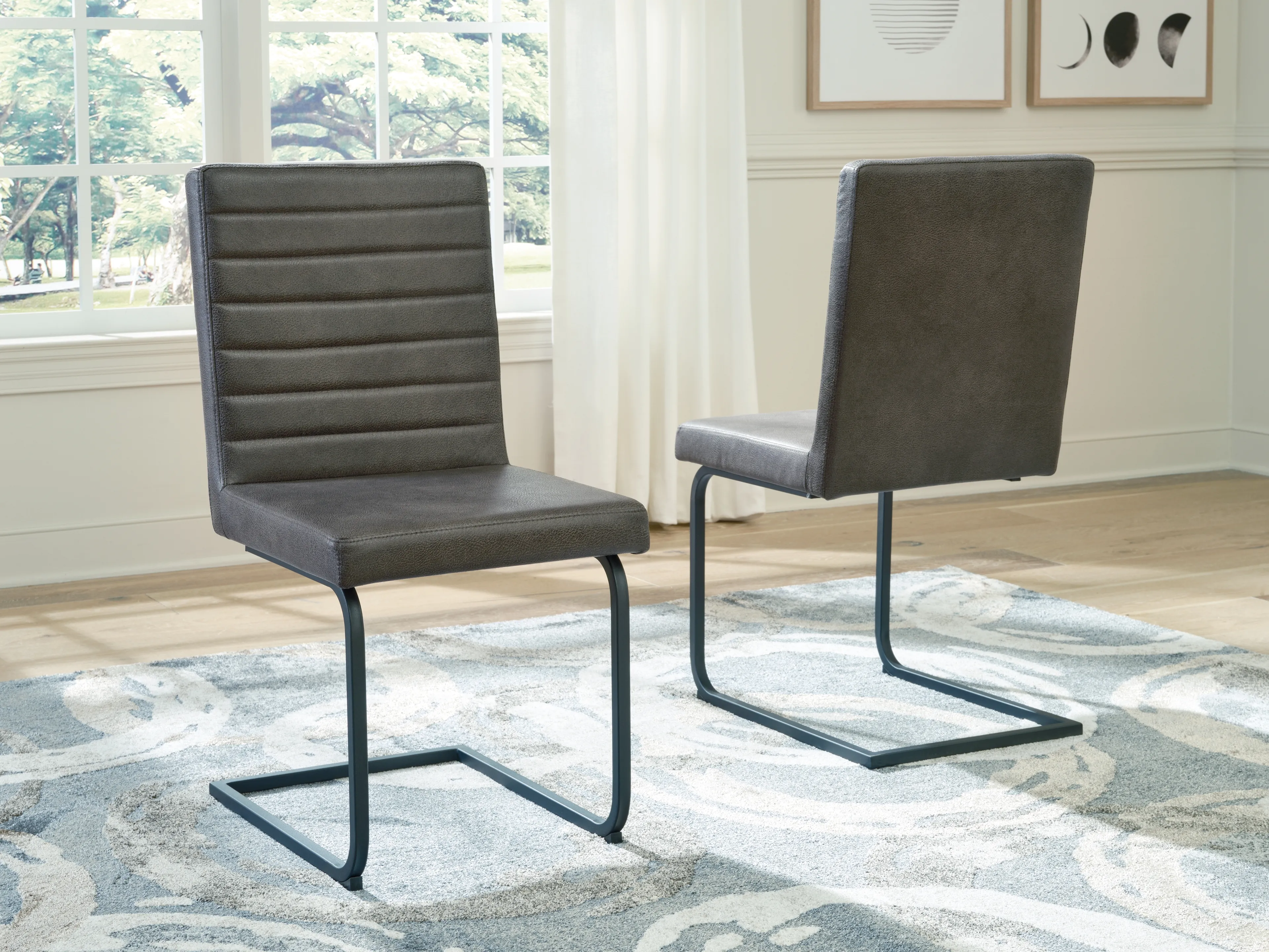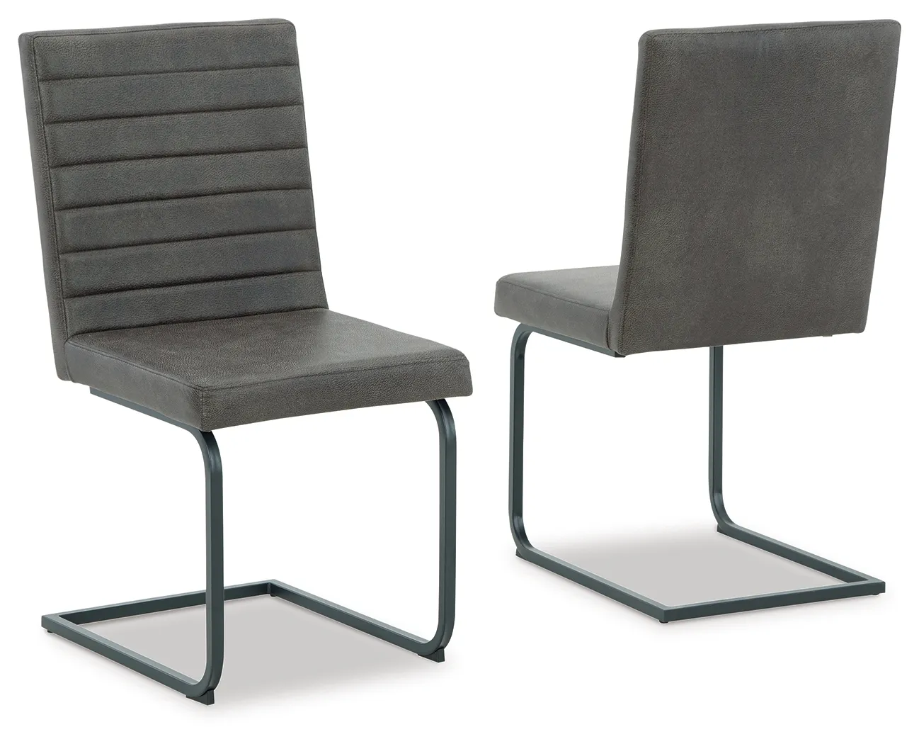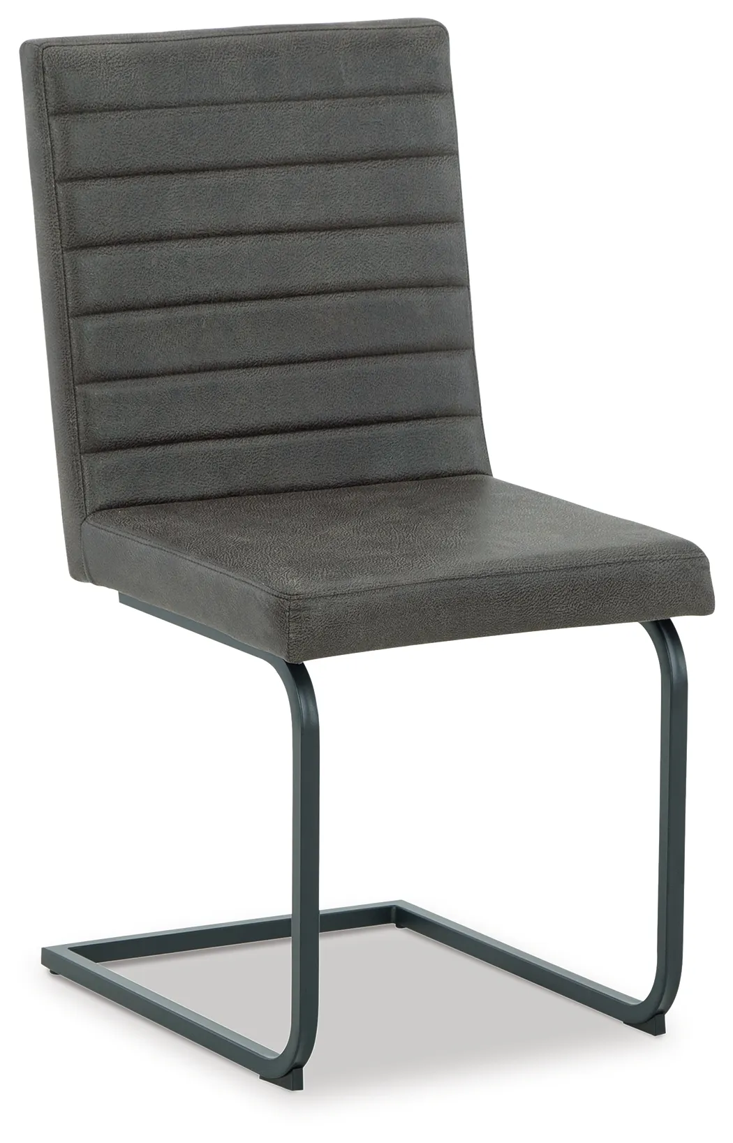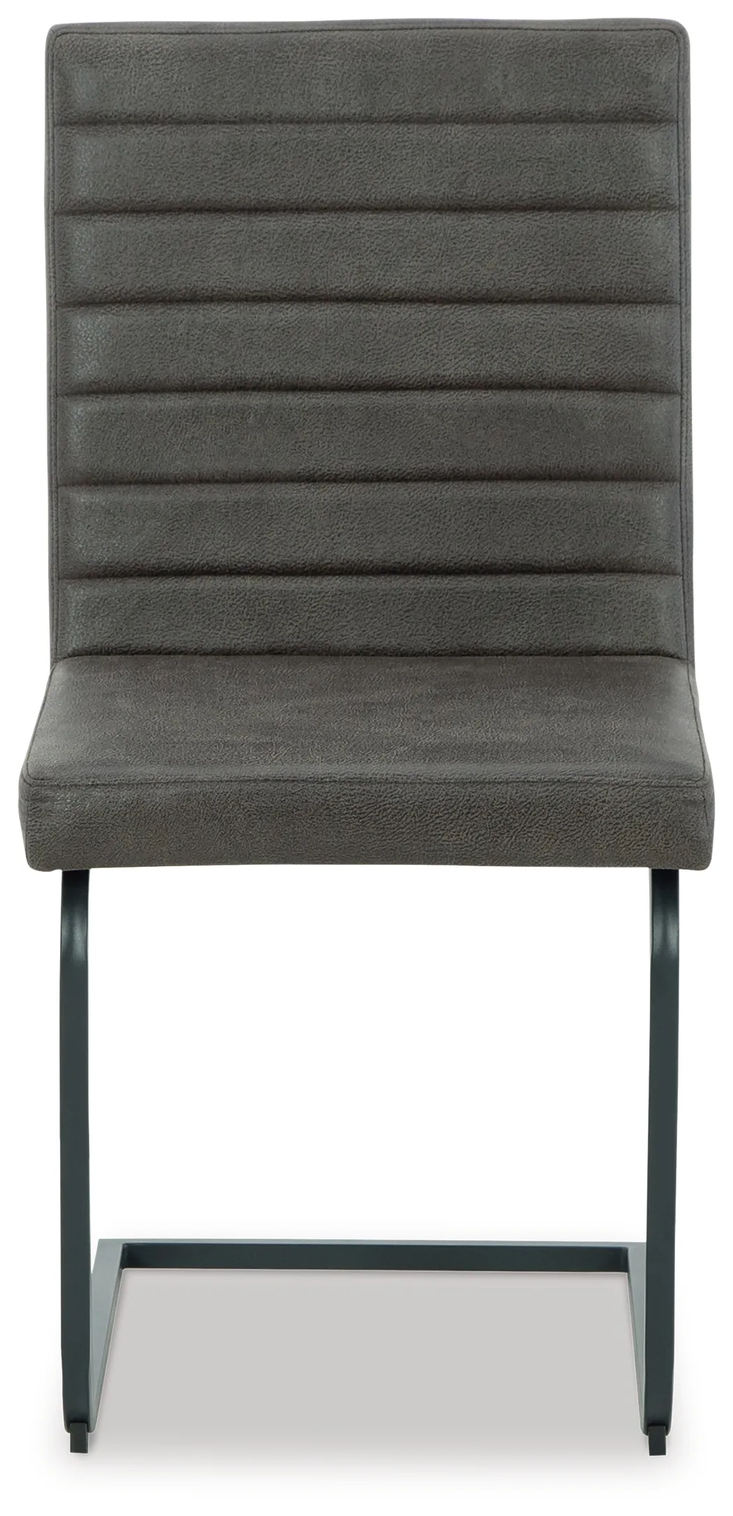 Have a seat in sleek style with this dining side chair. Contemporary with a casual vibe, it's dressed to impress with a modern C-shaped metal base, smoke gray faux leather upholstery and a tailored channel back design. Use this chair in the dining room or anywhere in the home for a fresh addition everyone will notice.