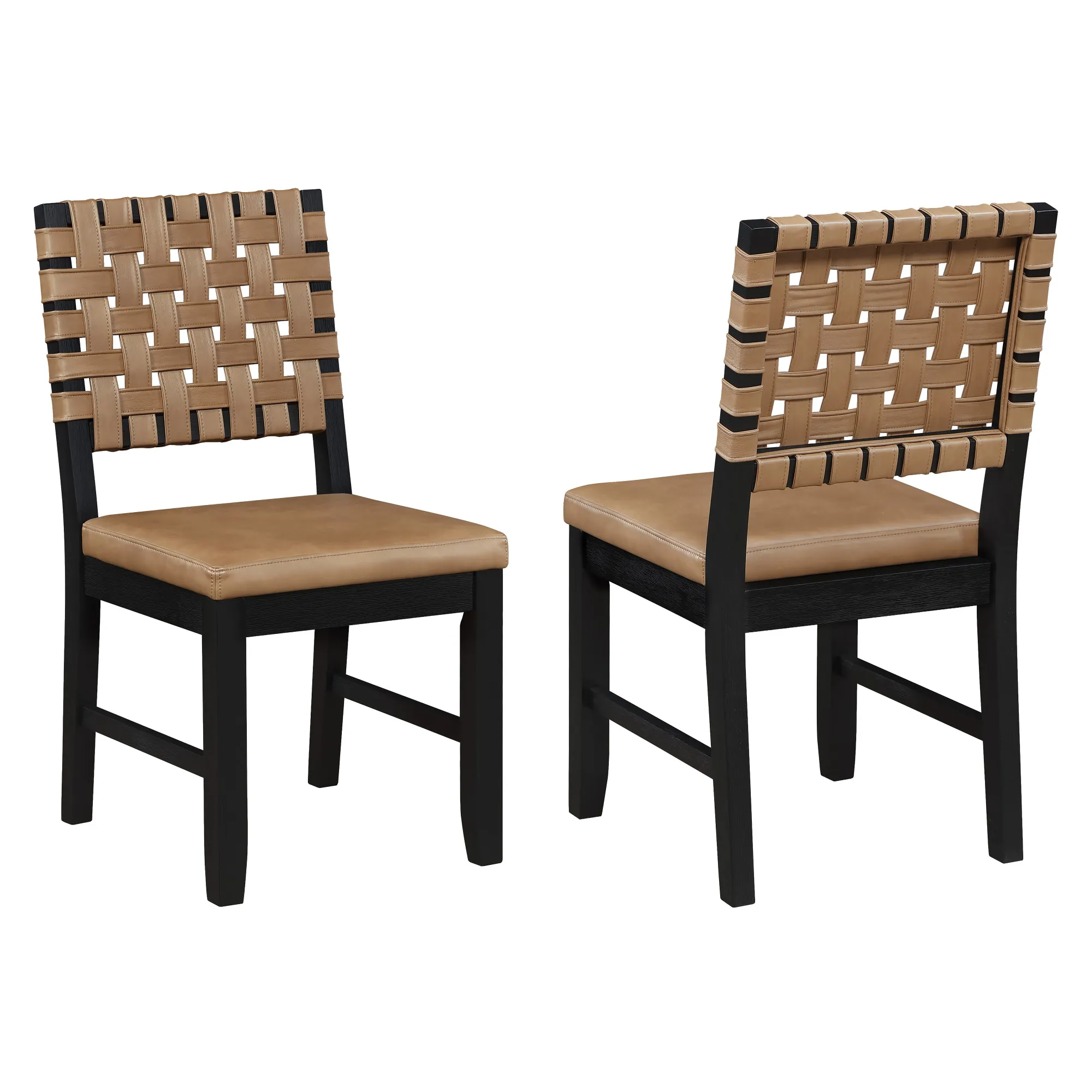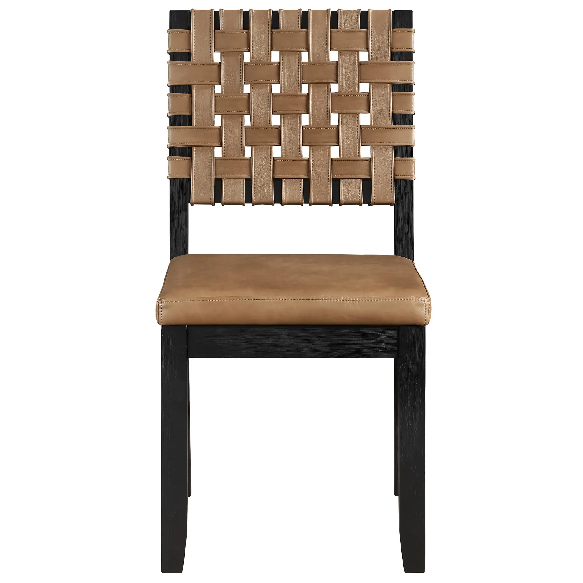 The sleek and modern Reid Sand Side Chair instantly elevates your space, proving that luxury doesn't mean stuffy. Built for high style and comfort, it features a tailored, box-pleat seat with two inches of foam cushioning. Wrapped in rich, saddle brown vegan leather that cleans effortlessly with a damp cloth, the chair's black finish on the frame adds a light, contemporary foundation while an exposed webbed back provides a casual-rustic detail and superior support. The angled back completes the look with the benefit of an ideal seating pitch for dining, office, or accent seating.
