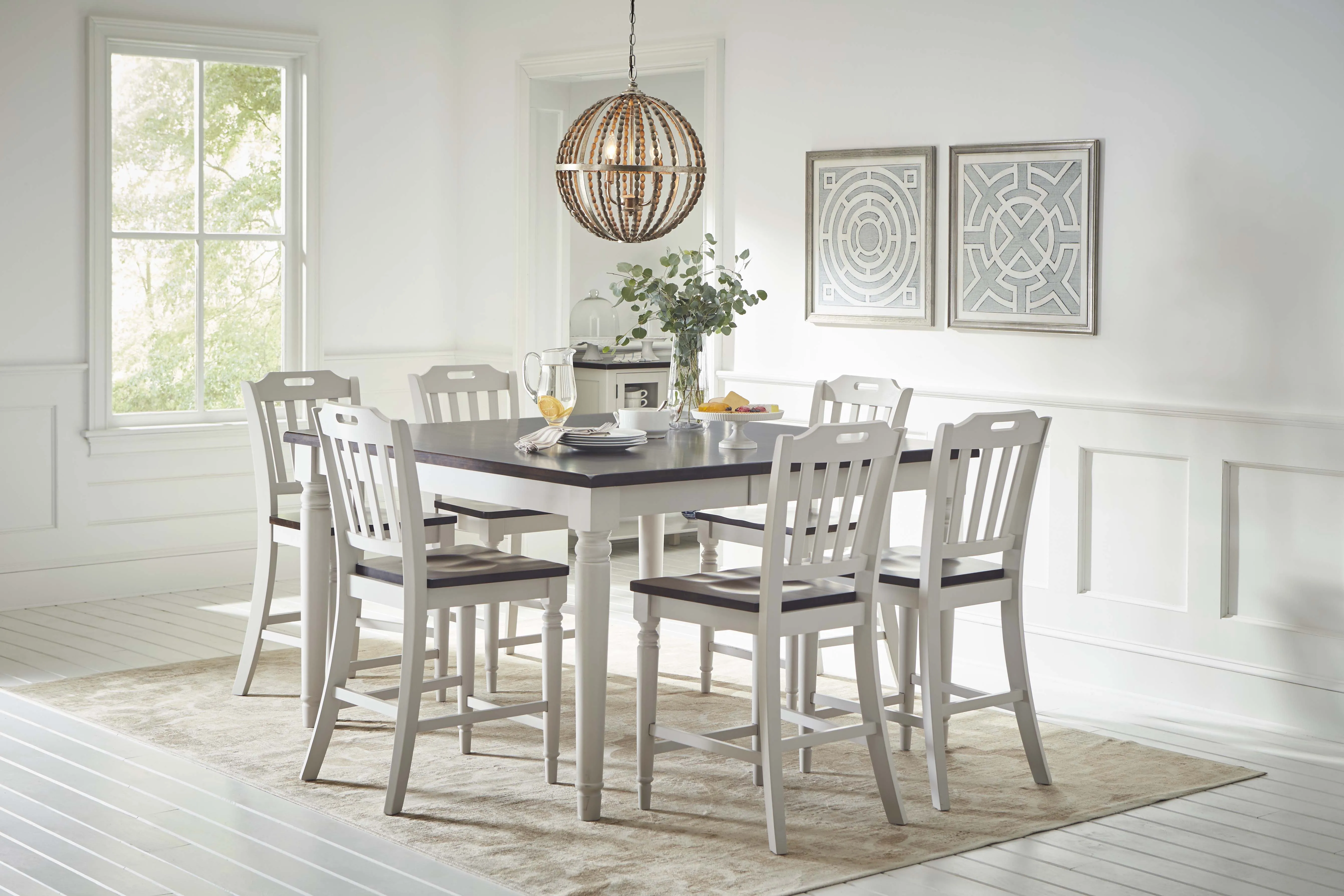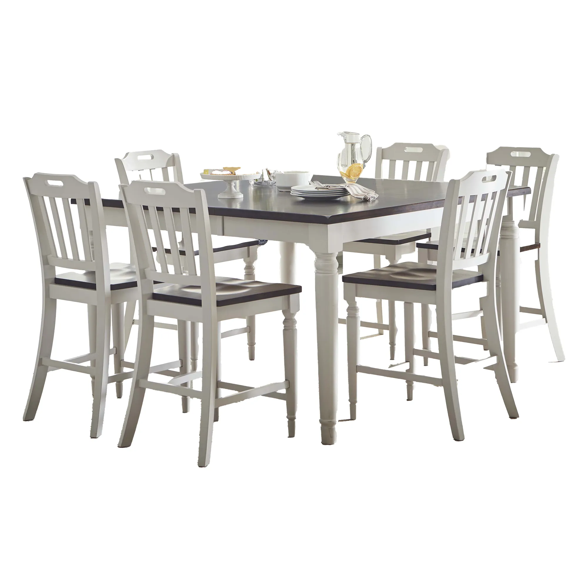 Transform your dining area with the Orchard Park Solid Rubberwood 60" Seven-Piece Farmhouse Counter Height Dining Set. Featuring a rich, farmhouse dark brown top paired with a soft modern grey base, this collection creates an inviting space for entertaining. The set includes a 60" counter height dining table and six matching barstools, all crafted from solid hardwood. Perfect for family dinners and weekend gatherings, the Orchard Park set blends timeless country style with durable craftsmanship, offering a stunning and functional addition to your home.