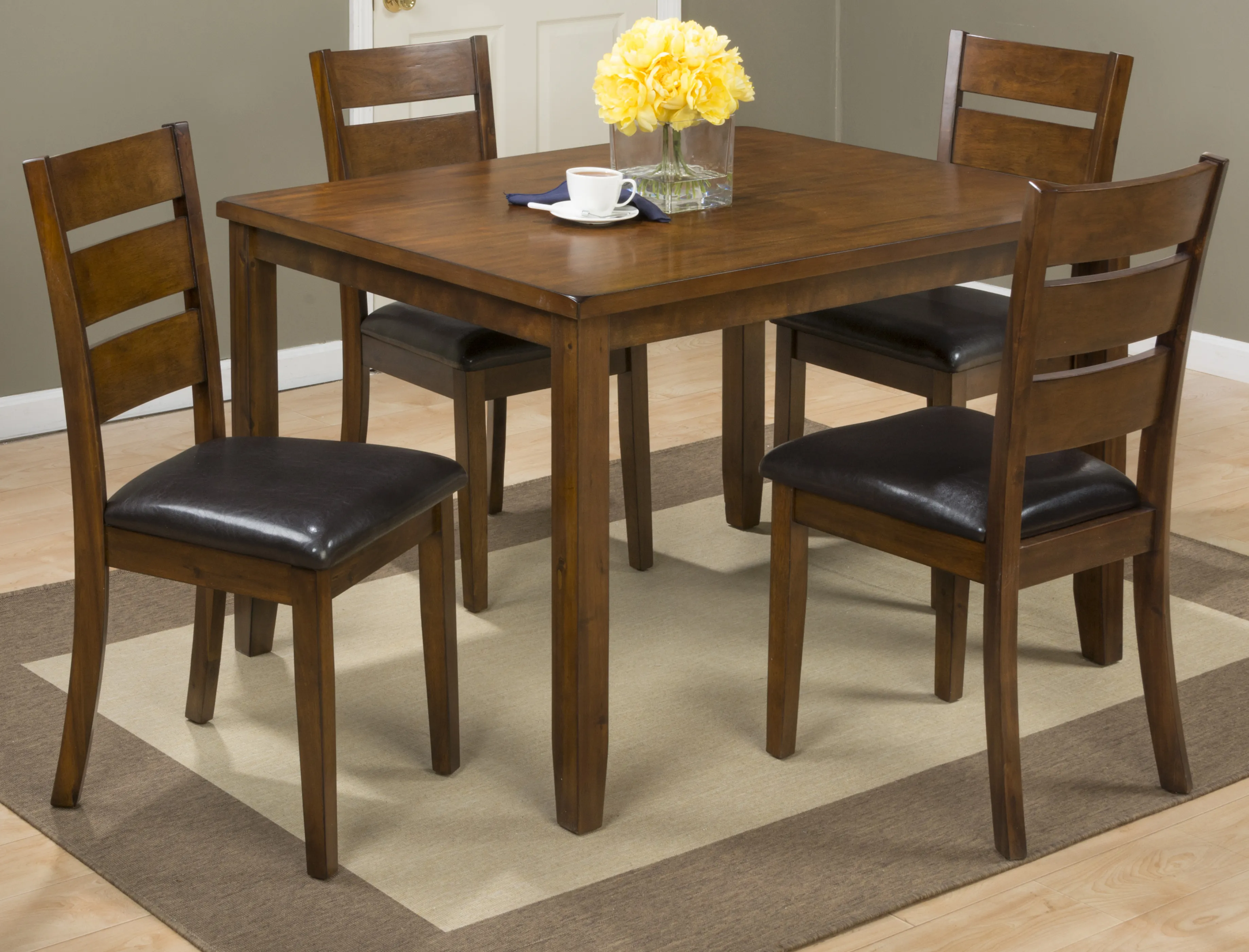The Plantation 5 Pack- Table with 4 Chairs is part of the Plantation Collection. This farmhouse dining group was designed to change with the times and to be fashionable and convenient. A rich finish with gorgeous Mango veneer sets this incredible value apart as a true find. Sturdy, solid construction on both the table and chairs, as well as faux leather upholstery on the seats guarantee that this group will be a staple in your home for years to come. Built with Mango Veneer over solid hardwood for a thick and sturdy build for years of use.