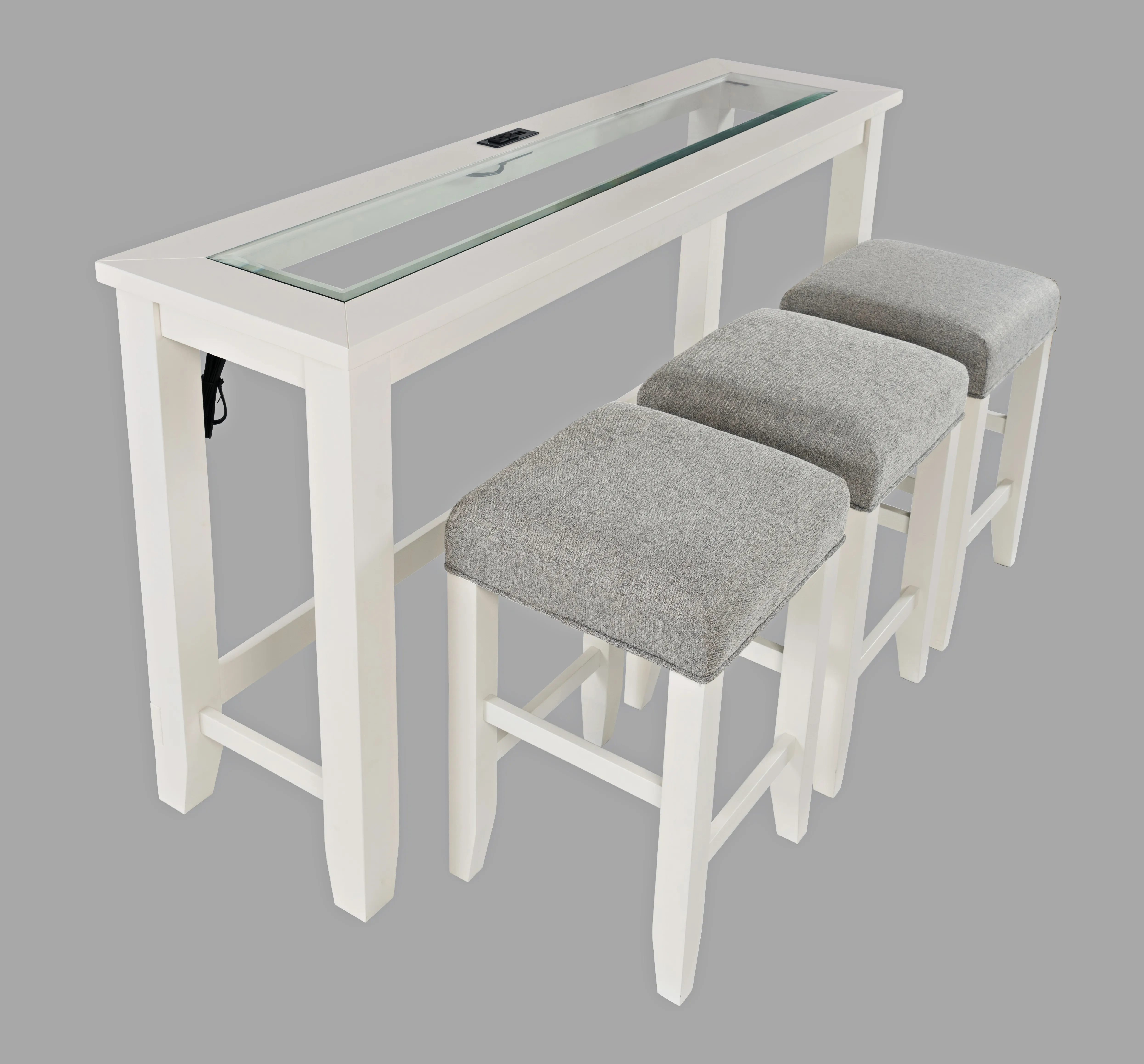 Elevate your dining experience with the Urban Icon Contemporary 4-Piece Counter Height Dining Set. Featuring a sleek 66" table with a solid tempered glass inlay and modern beveled edges, this set is available in three unique color options to complement your decor. Designed with a sofa table style, it's perfect for smaller spaces or additional seating behind a couch. The set includes three matching backless barstools and offers built-in USB charging and power outlets, providing convenience for charging devices while entertaining guests or during everyday use. Combining contemporary style with practical functionality, the Urban Icon set is a stylish and space-efficient addition to any home.