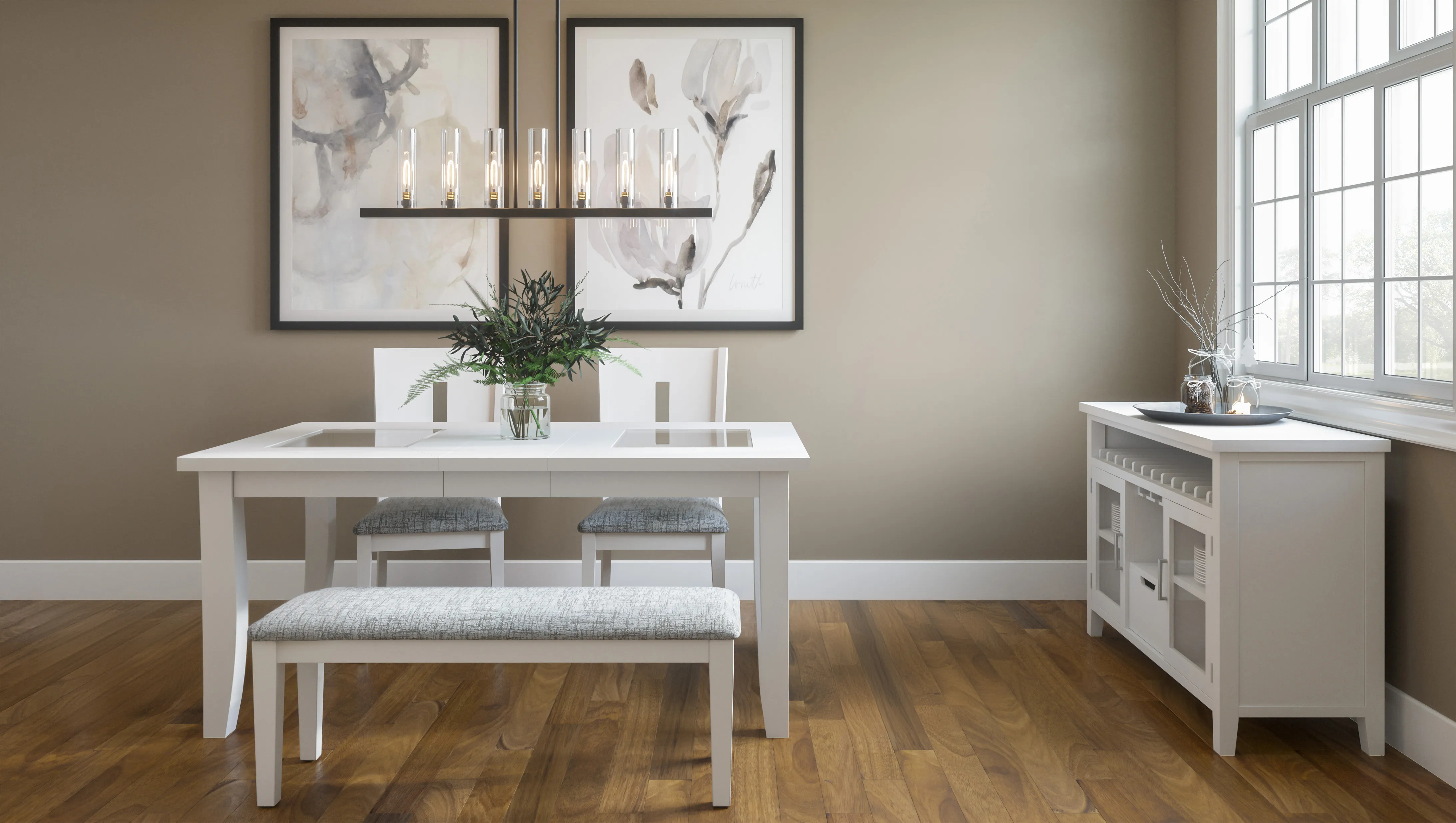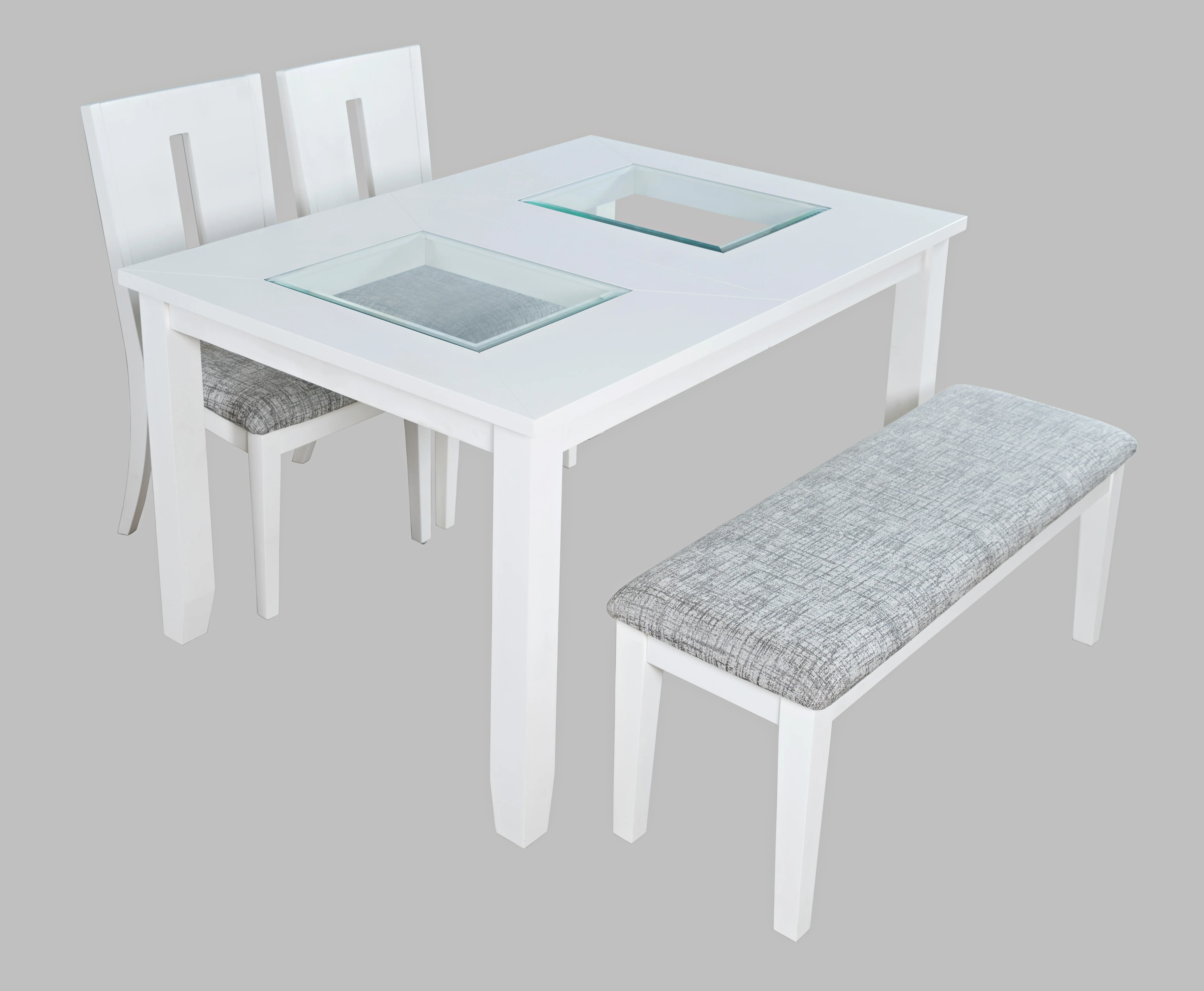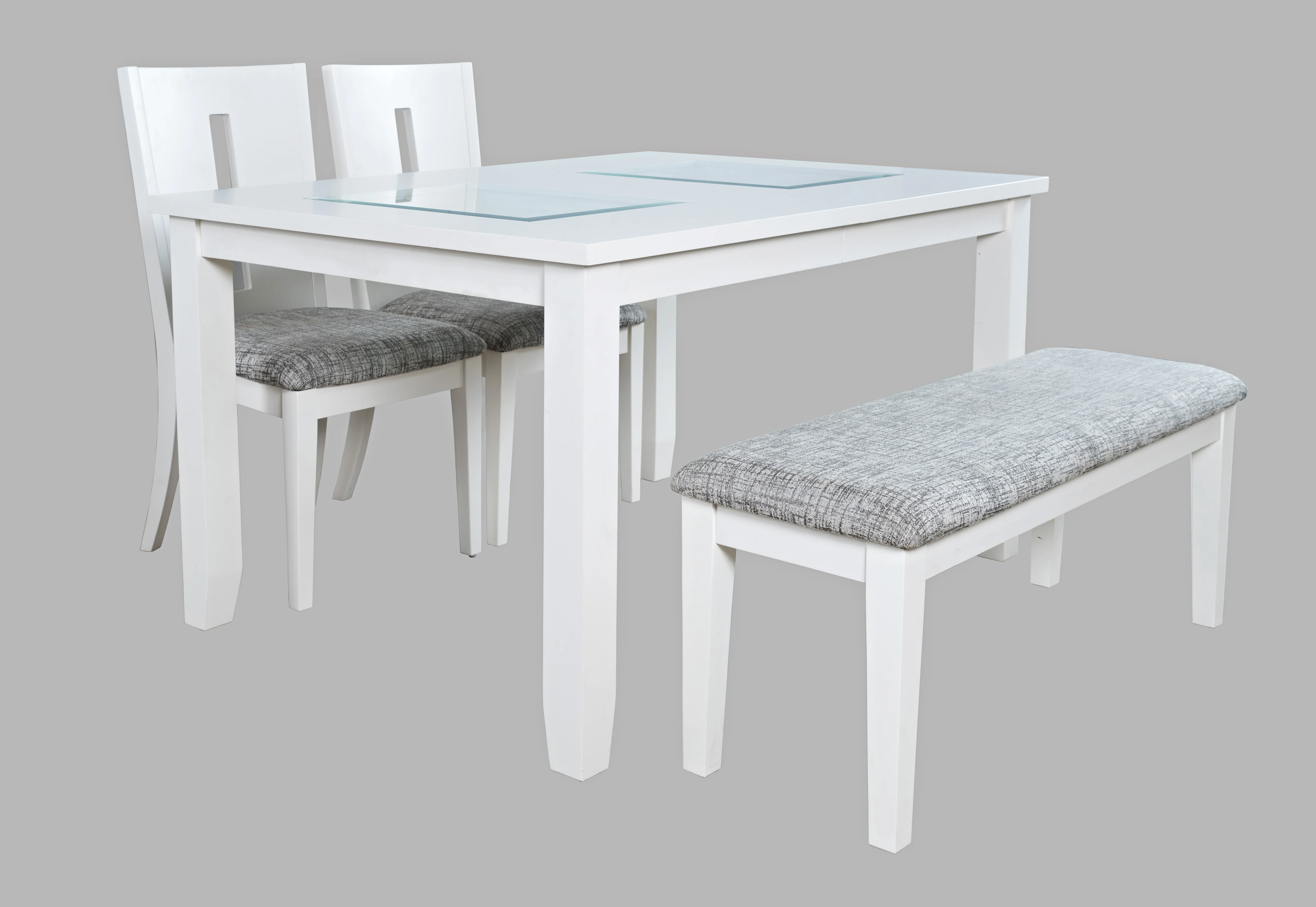 Elevate your dining space with the Urban Icon Contemporary 66" Four-Piece Dining Set. Featuring a sleek table with a solid tempered glass inlay and modern beveled edges, this set includes one 66" dining table, two matching upholstered dining chairs, and a stylish bench. Available in three color options, the set effortlessly complements a variety of interior styles. Combining contemporary design with versatile seating, the Urban Icon set is perfect for both everyday dining and special gatherings, adding a sophisticated touch to your home.