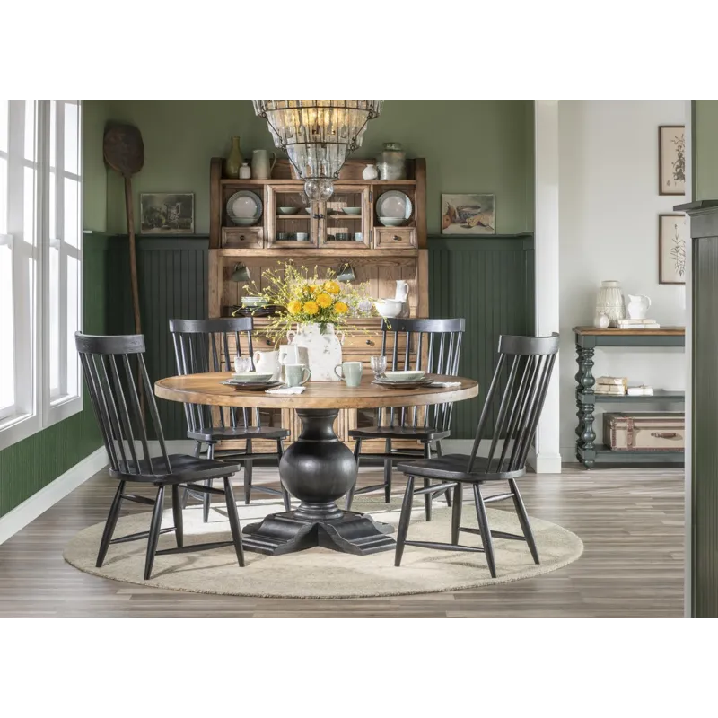 The Vintage Market 5-Piece Round Dining Set from Legacy Classic’s Country Living collection brings timeless farmhouse charm and inviting warmth to your dining space. Anchored by a generously sized round dining table and paired with four classic Windsor side chairs, this set is designed to foster connection and conversation. The Barnwood-finished tabletop contrasts beautifully with the Kettle Black base and chairs, creating a collected, heritage-inspired look that feels both comfortable and enduring—perfect for everyday meals and memorable gatherings alike.