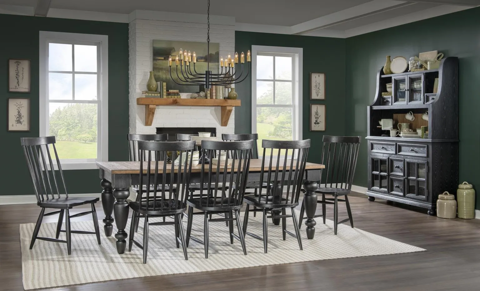 The Vintage Market 9-Piece Dining Set from Legacy Classic’s Country Living collection captures the heart of relaxed, farmhouse-inspired living with timeless craftsmanship and inviting character. Featuring a substantial chimney-leg dining table paired with eight classic Windsor side chairs, this set blends rustic finishes with traditional silhouettes for a warm, welcoming gathering space. The contrasting Barnwood tabletop and Kettle Black base create a collected, heritage look that feels both familiar and enduring—perfect for homes that value comfort, family, and connection.