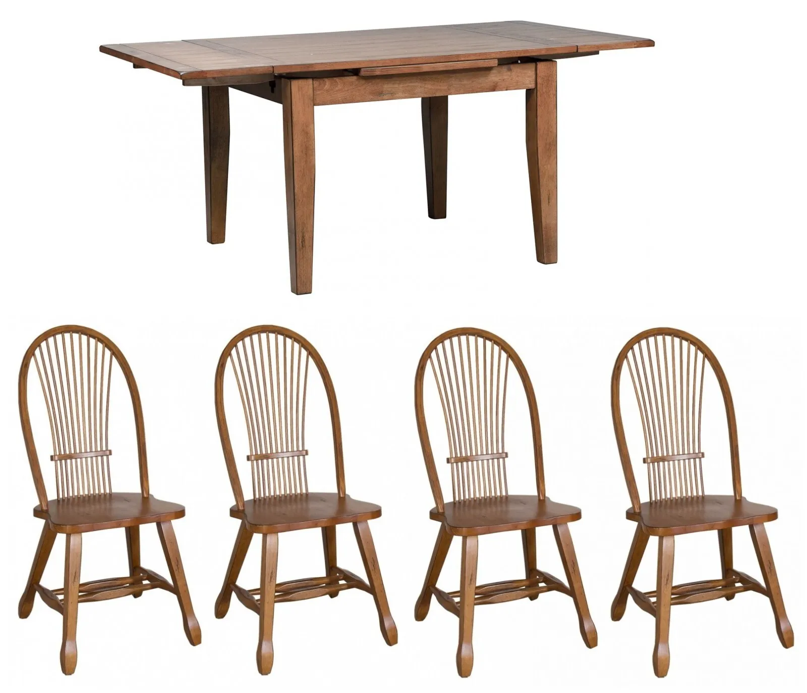 Retractable Leg Table - Oak: Gather around the Treasures retractable leg table. Crafted of rubberwood solids and oak veneers, this piece features a rustic oak finish, two 12” retractable leaves, and a planked top. Treasures offers simple shaker styled dining in a subtle finish which evokes the feel of a treasured antique.
