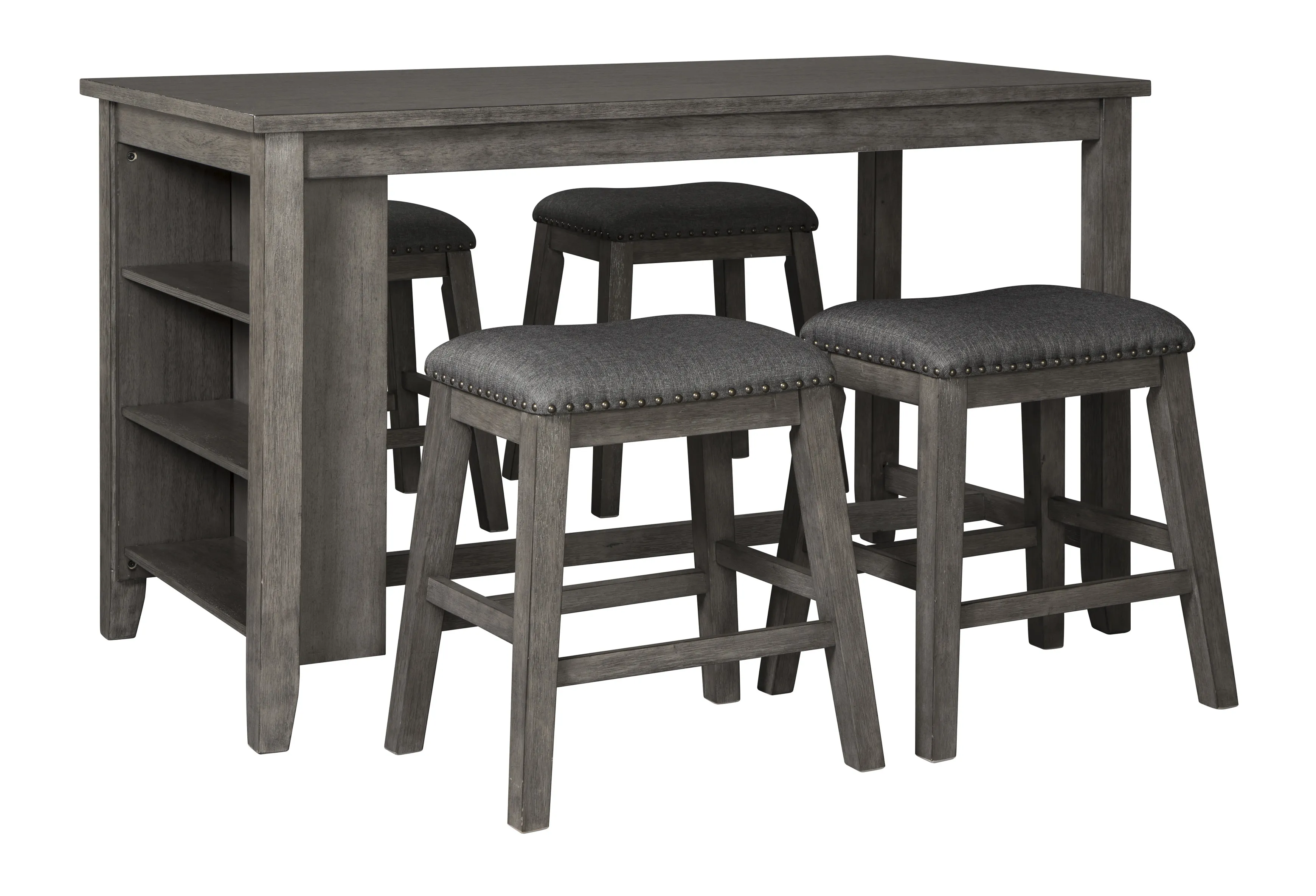 The Signature Design by Ashley Caitbrook 5-Piece Counter Height Dining Set with Backless Stools features an antiqued gray wash finish, built-in table shelving, and upholstered seating with nailhead trim. Ideal for modern farmhouse and contemporary dining spaces, this compact counter-height dining set offers comfort, storage, and timeless style for everyday living.
