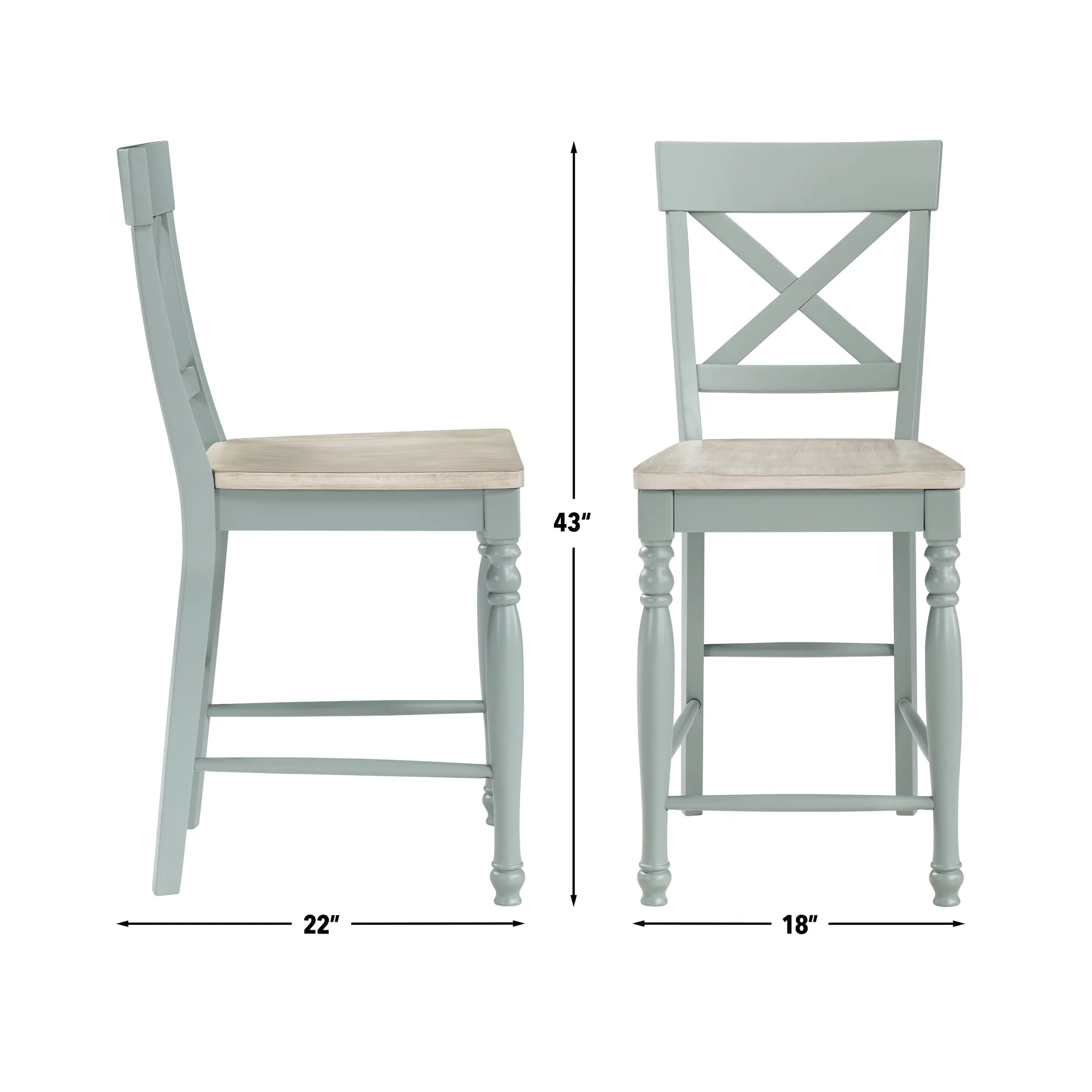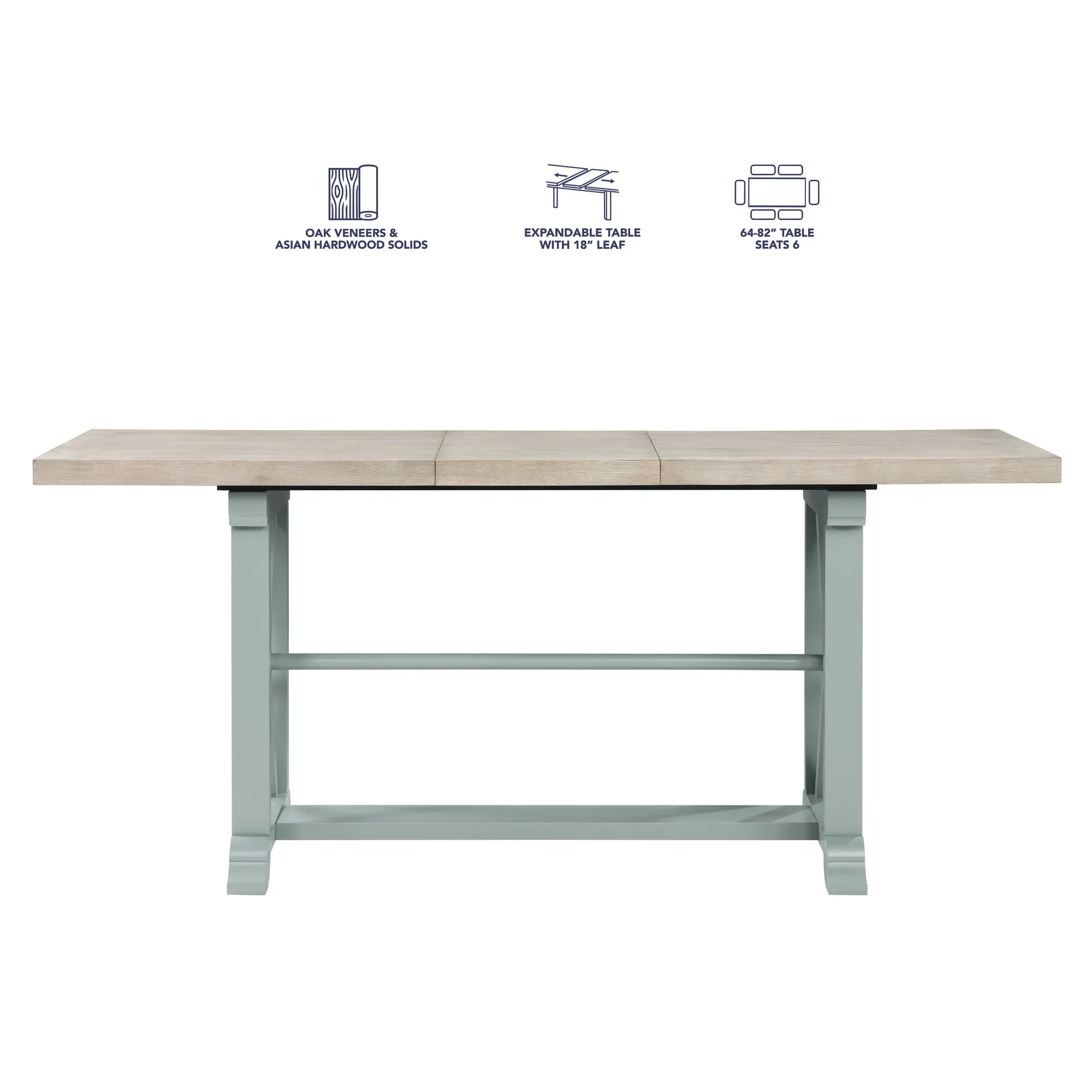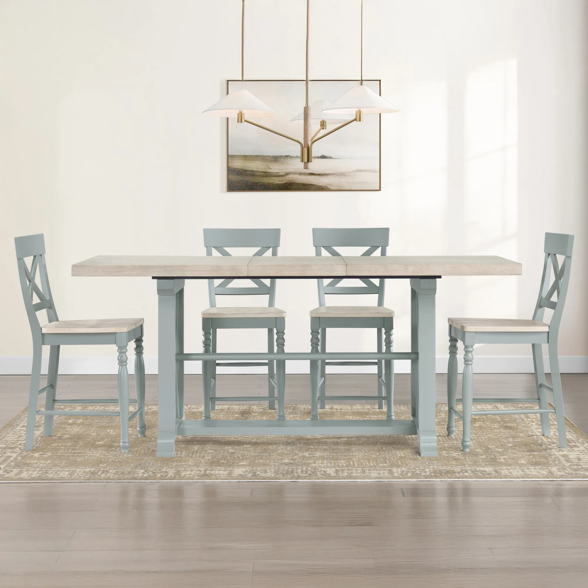 Bring charm and functionality to your dining space with the Darcy 7-Piece Counter Set. The extendable table features a washed parhcment finish wood top and squared mint green legs, blending farmhouse charm with modern elegance. With its 18-inch leaf, the table expands from 64 to 82 inches, comfortably seating up to six guests. The six counter-height chairs showcase a modified X-back design, two-tone finish, and contoured seats for added comfort. Ideal for dining rooms or breakfast nooks, the Darcy combines durability with inviting rustic-modern style.