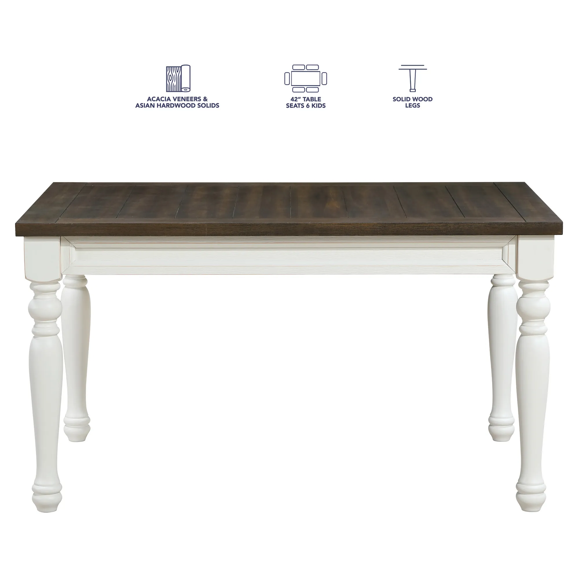 Styled just like the grown-up version, the Joanna 3-Piece Kids Dining Set brings rustic charm to any playroom, bedroom, or dining space. Crafted from kiln-dried hardwoods with reinforced joinery, it’s built to last through snacks, schoolwork, and play. A wire-brushed ivory and mocha finish adds warmth and texture, while solid wood legs and scooped chairs offer comfort and stability. Sized perfectly for children, this table-and-chair set seats up to six—creating a cozy spot for everyday fun and creativity.